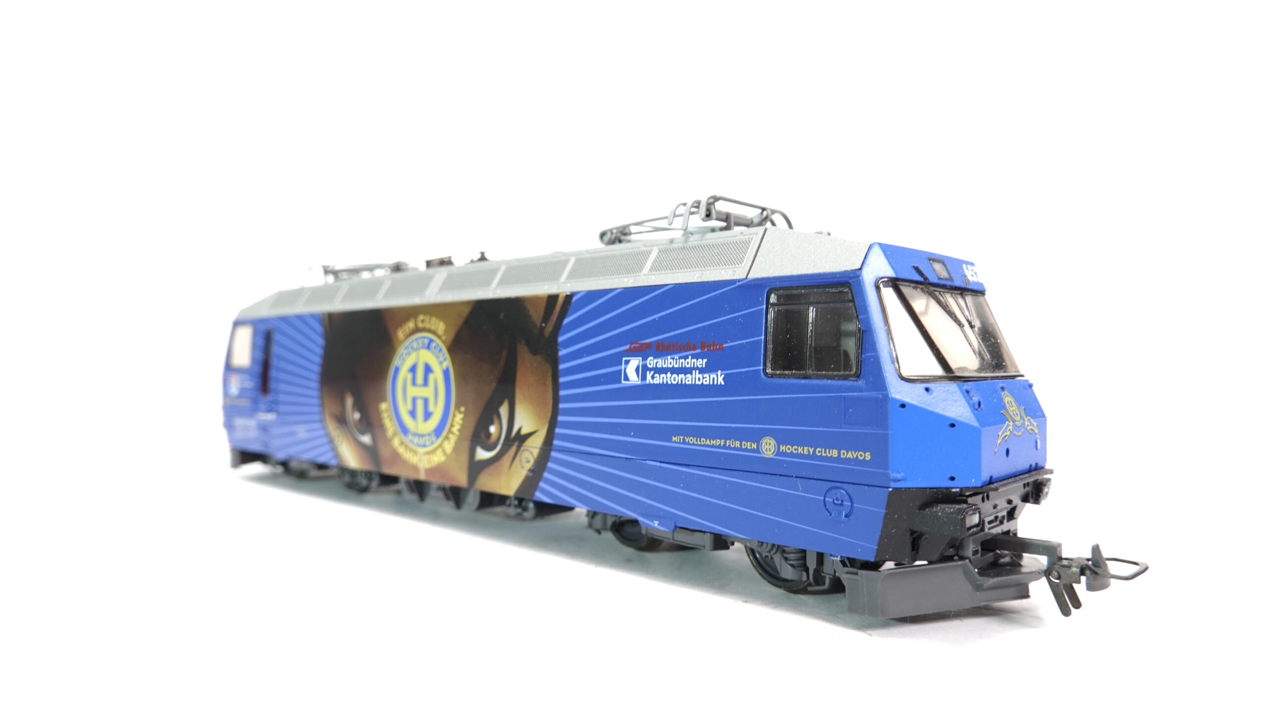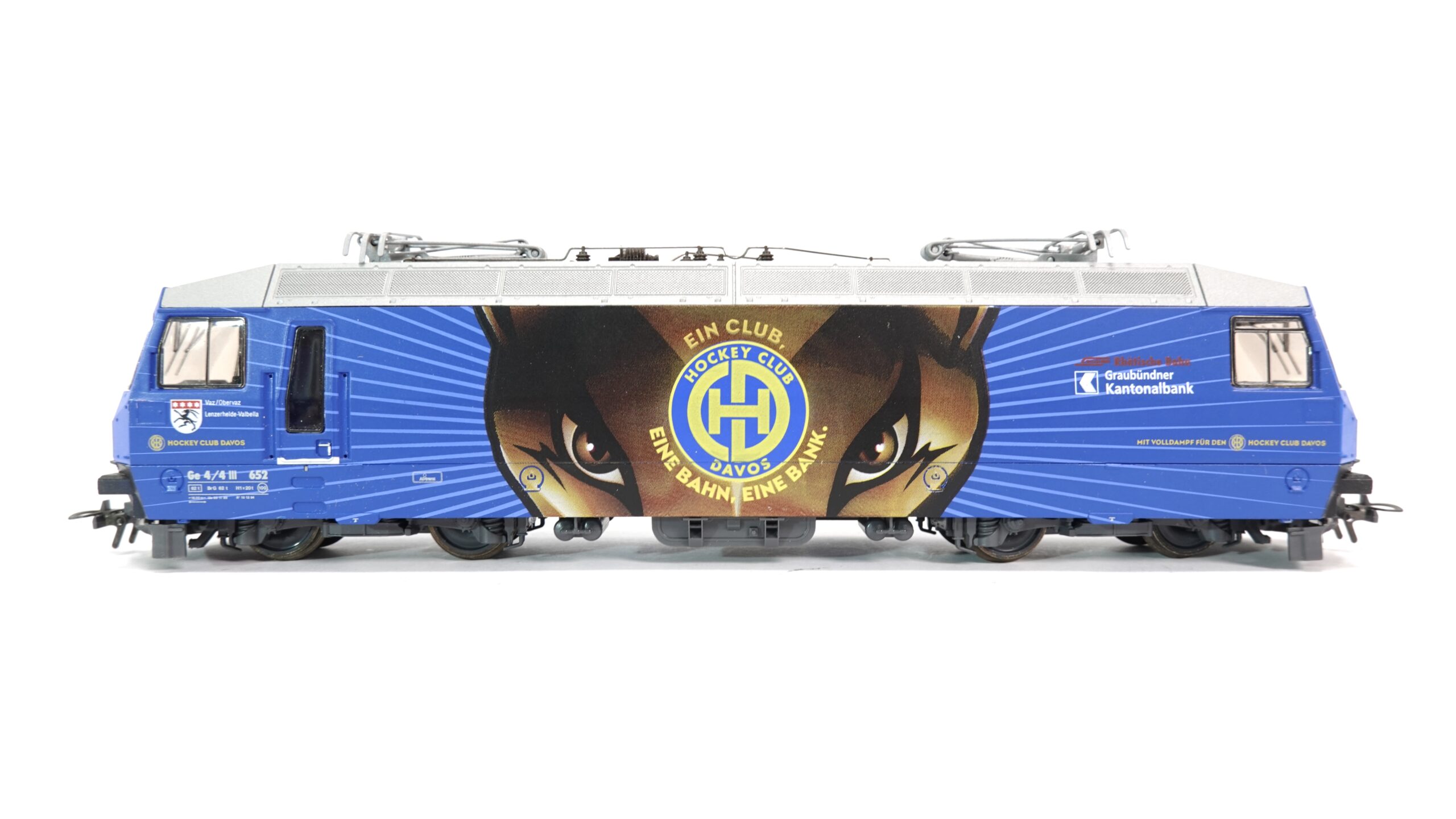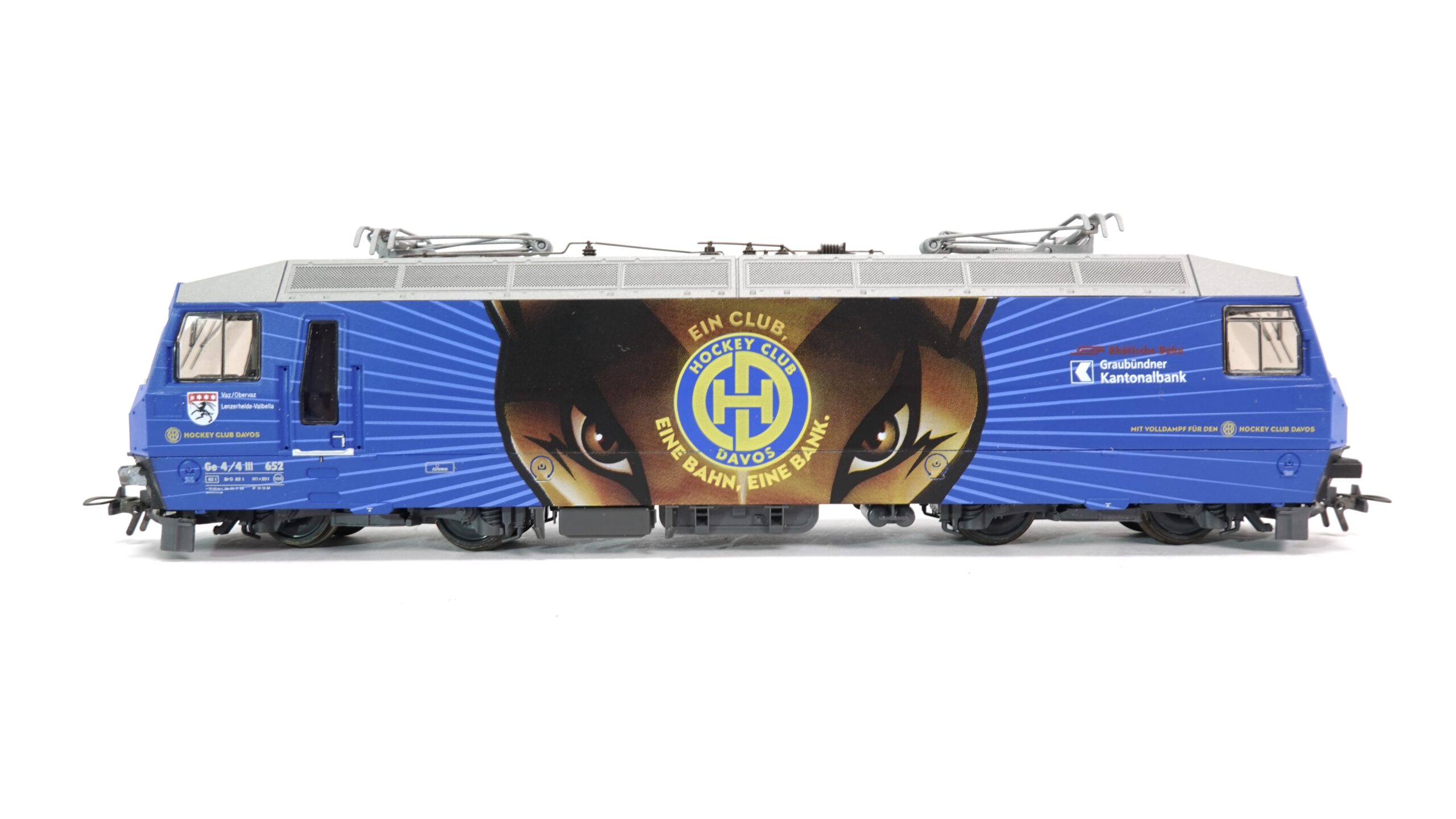 Die Lok Nr. 652 trägt eine ganz besondere Beklebung: Sie wurde dem Hockey Club Davos (HCD) gewidmet, einem der traditionsreichsten Eishockeyvereine der Schweiz. Mit ihrer auffälligen, blauen Sonderlackierung, dem Blick eines Raubtiers und dem HCD-Logo auf der Seite ist diese Lokomotive ein echter Hingucker – auf den Schienen wie auch auf jeder Modellbahnanlage.