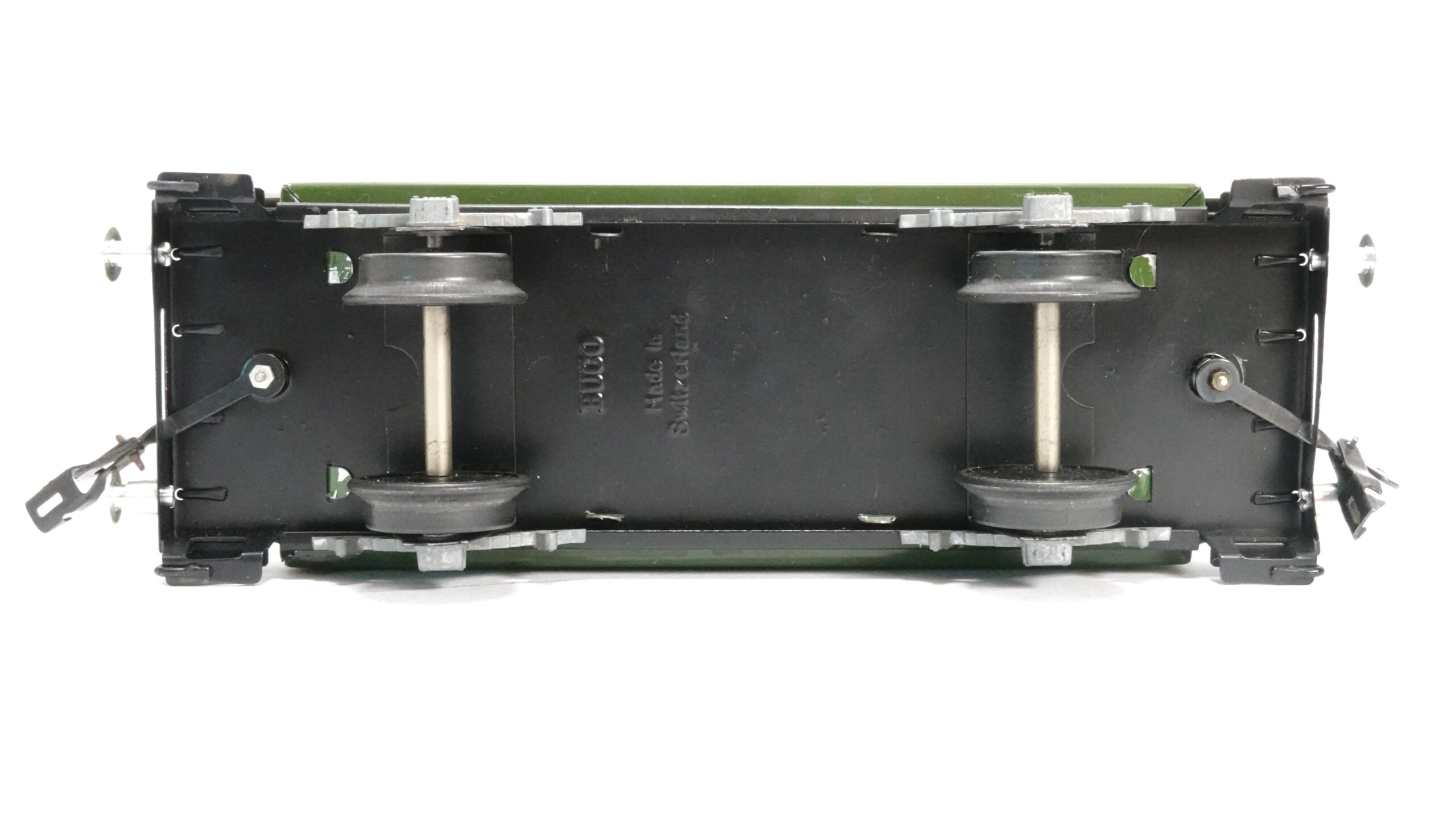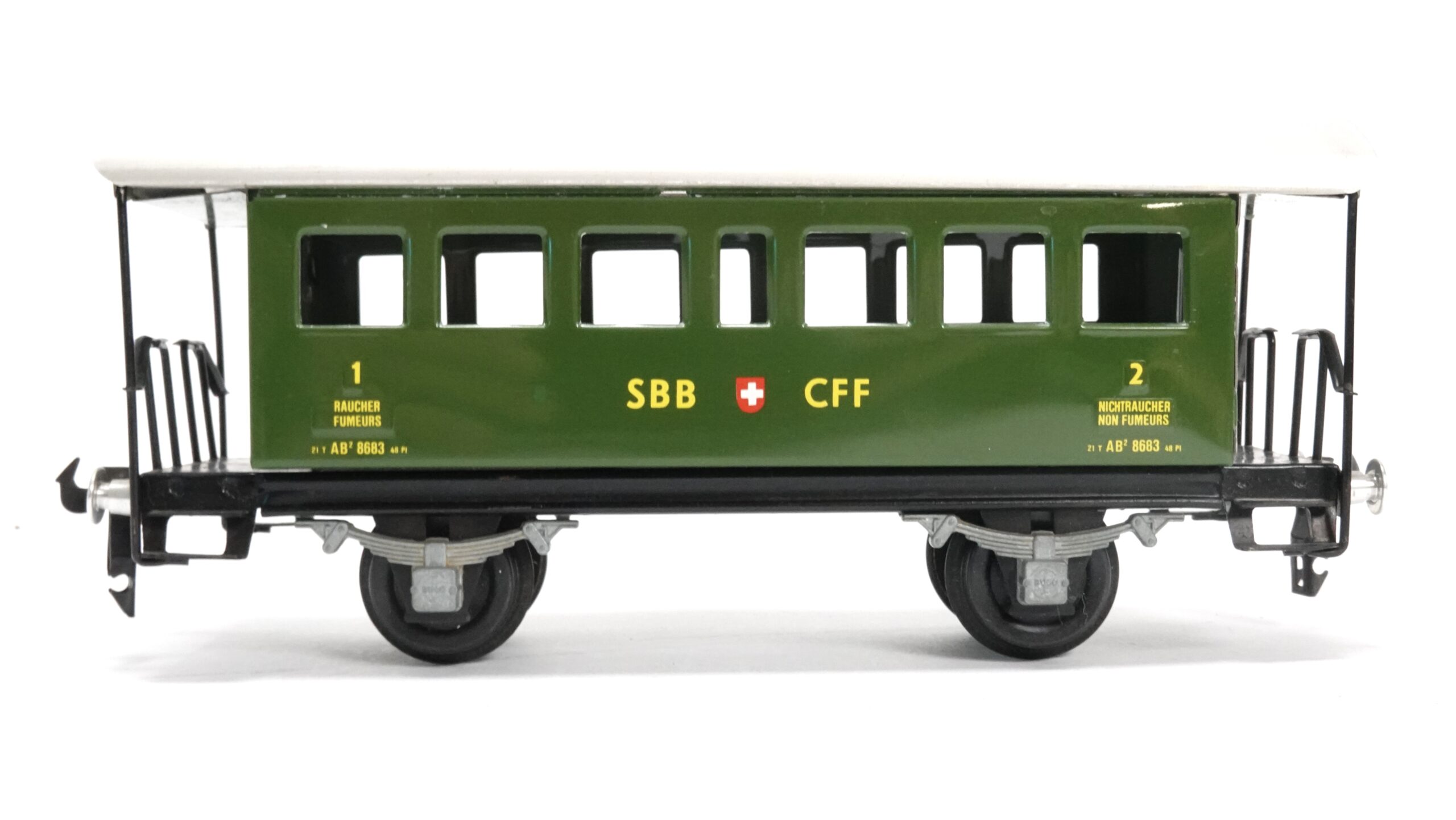 Der Buco 8683 SBB-Personenwagen in grüner Farbgebung ist ein historisches Modellbahn-Schmuckstück aus der Mitte des 20. Jahrhunderts. Hergestellt von der renommierten Schweizer Marke Buco, spiegelt dieser detailreiche Personenwagen den Stil der Schweizerischen Bundesbahnen (SBB/CFF) aus der ersten Hälfte des 20. Jahrhunderts wider.