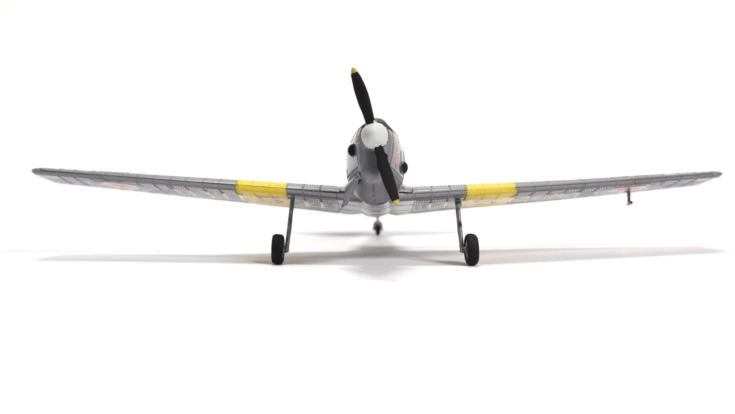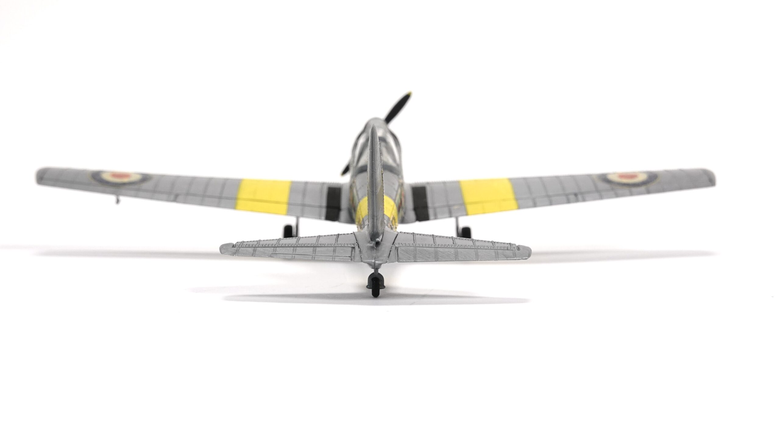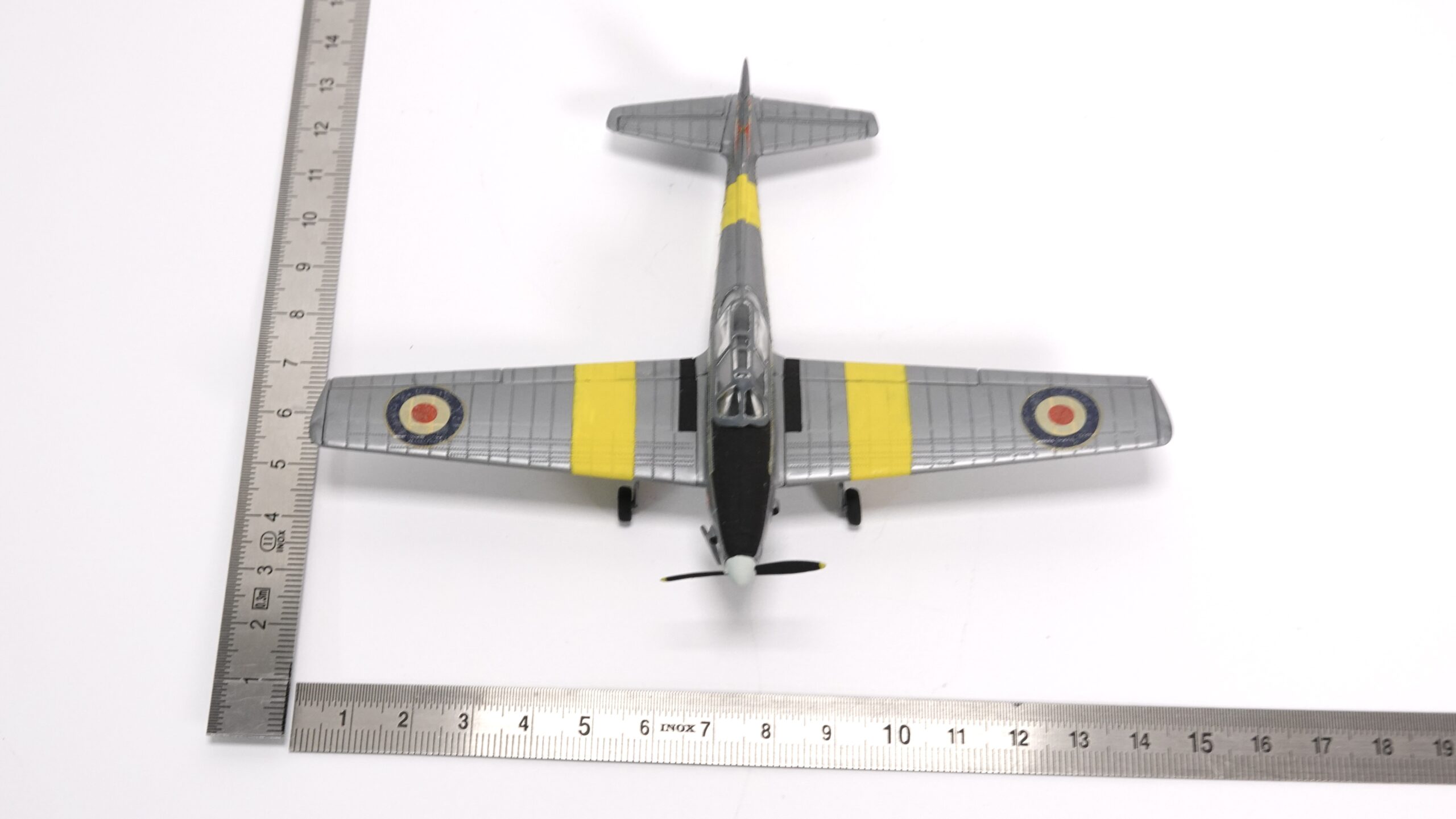 Das Modell im Maßstab 1:72 wurde detailgetreu gefertigt und handbemalt. Es besteht aus hochwertigem Kunststoff und ist mit präzisen Decals ausgestattet, die die historische Authentizität perfekt wiedergeben. Die Bemalung orientiert sich an einem realen Vorbild aus der Nachkriegszeit – mit silberner Lackierung, schwarzer Motorhaube und auffälligen gelben Warnflächen zur besseren Sichtbarkeit im Schulflugbetrieb.