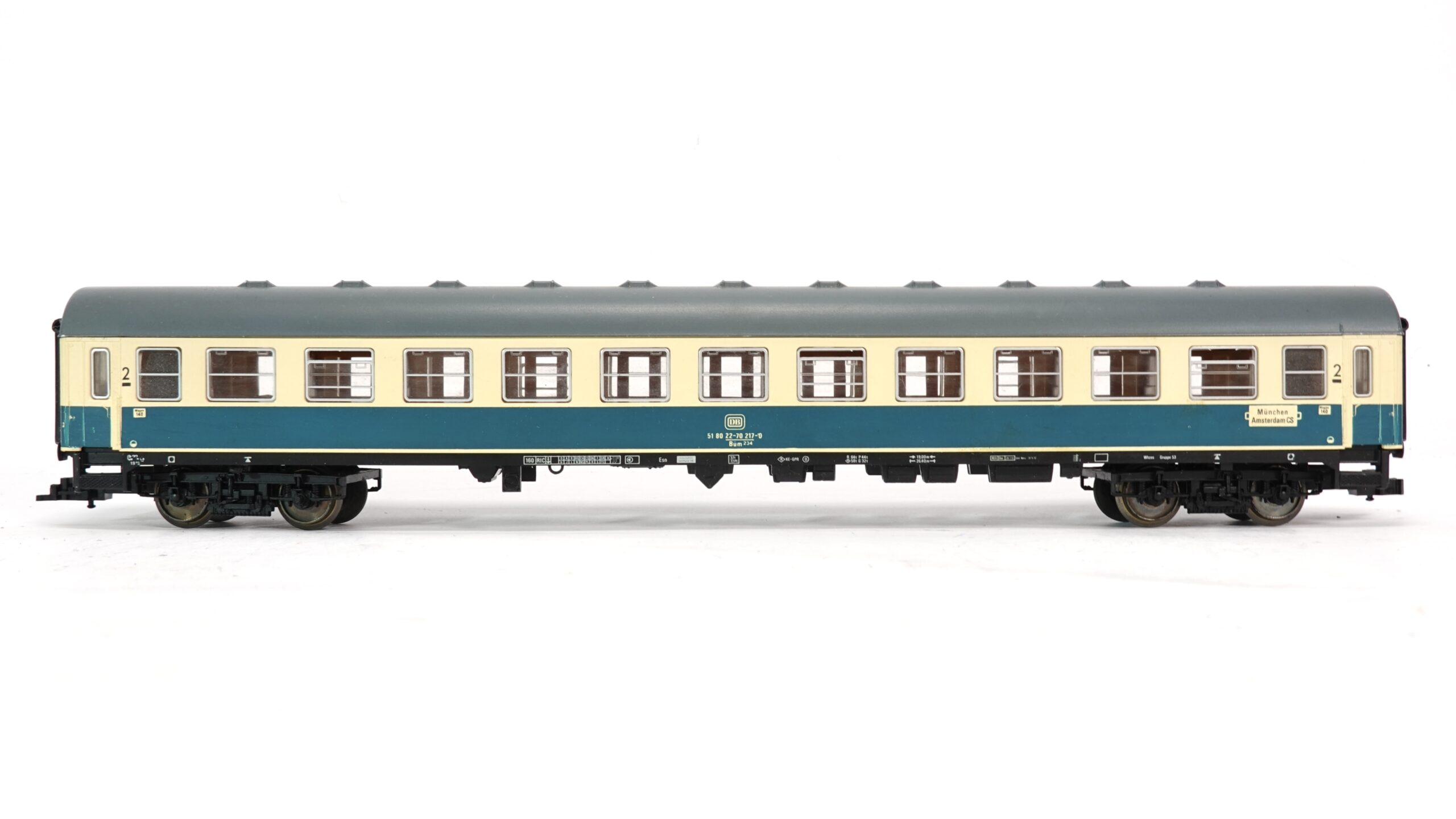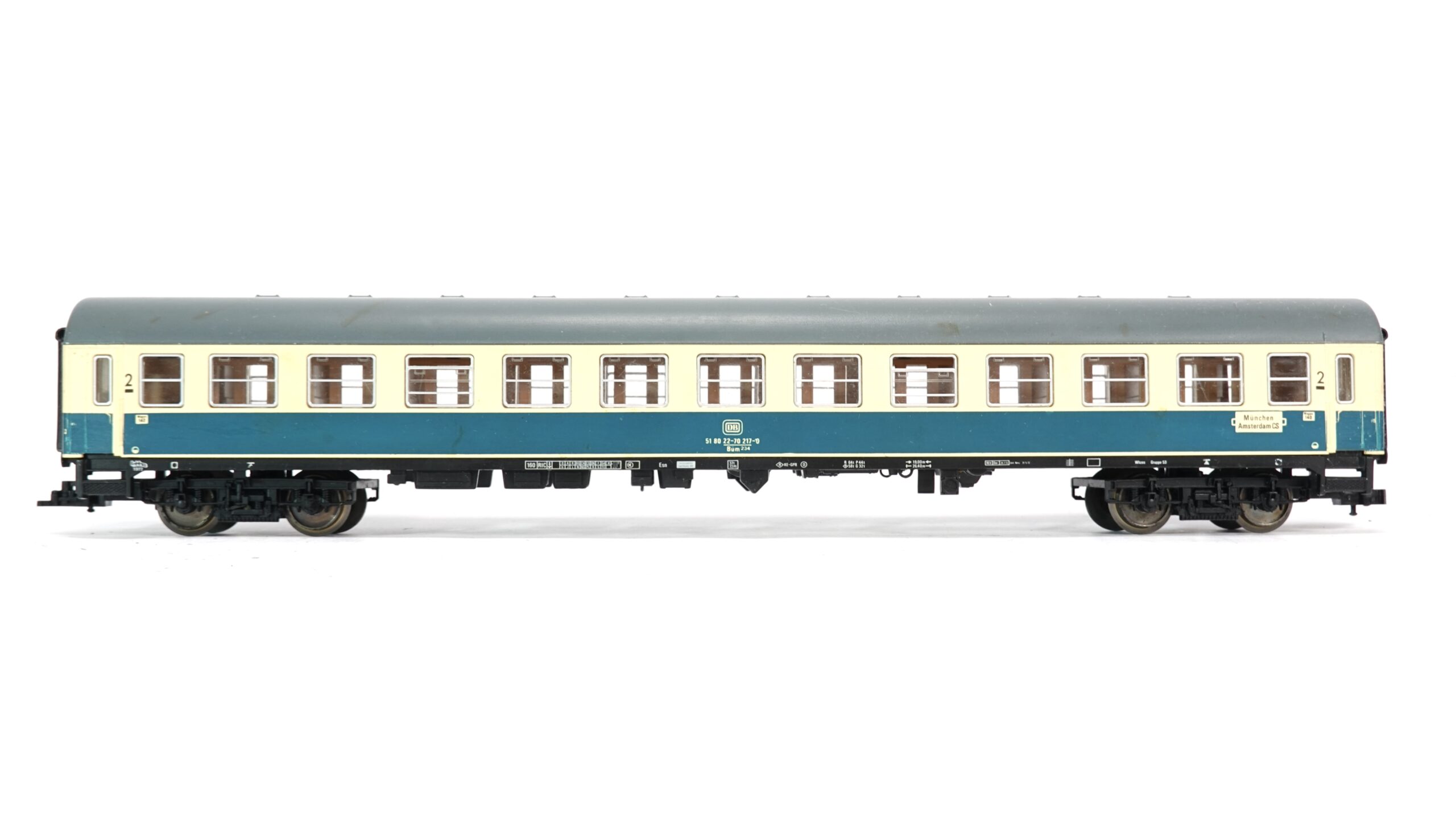 Der Wagen ist in der beliebten blau-beigen Farbgebung der DB gehalten, welche in den 1970er und 1980er Jahren charakteristisch für viele Intercity- und Schnellzüge war. Die Wagennummer „51 80 22-30 212-0“ deutet auf einen zweiten Klasse Schnellzugwagen hin. Die Klassenbezeichnung „2“ ist deutlich an den Stirnseiten aufgedruckt. Das Modell ist detailreich gestaltet, mit feinen Beschriftungen, filigranen Griffstangen und exakt nachgebildeten Drehgestellen des Typs Minden-Deutz.
