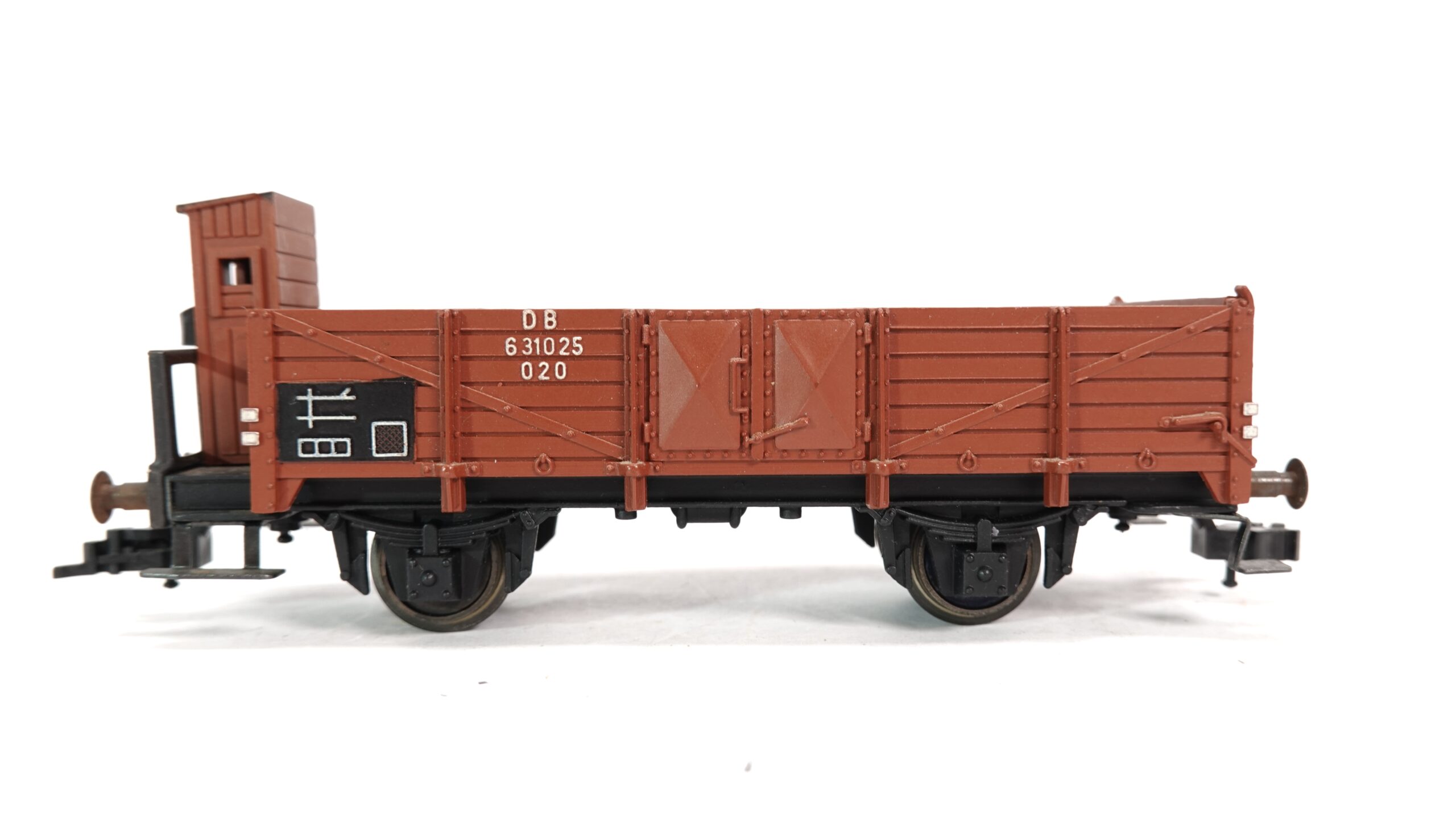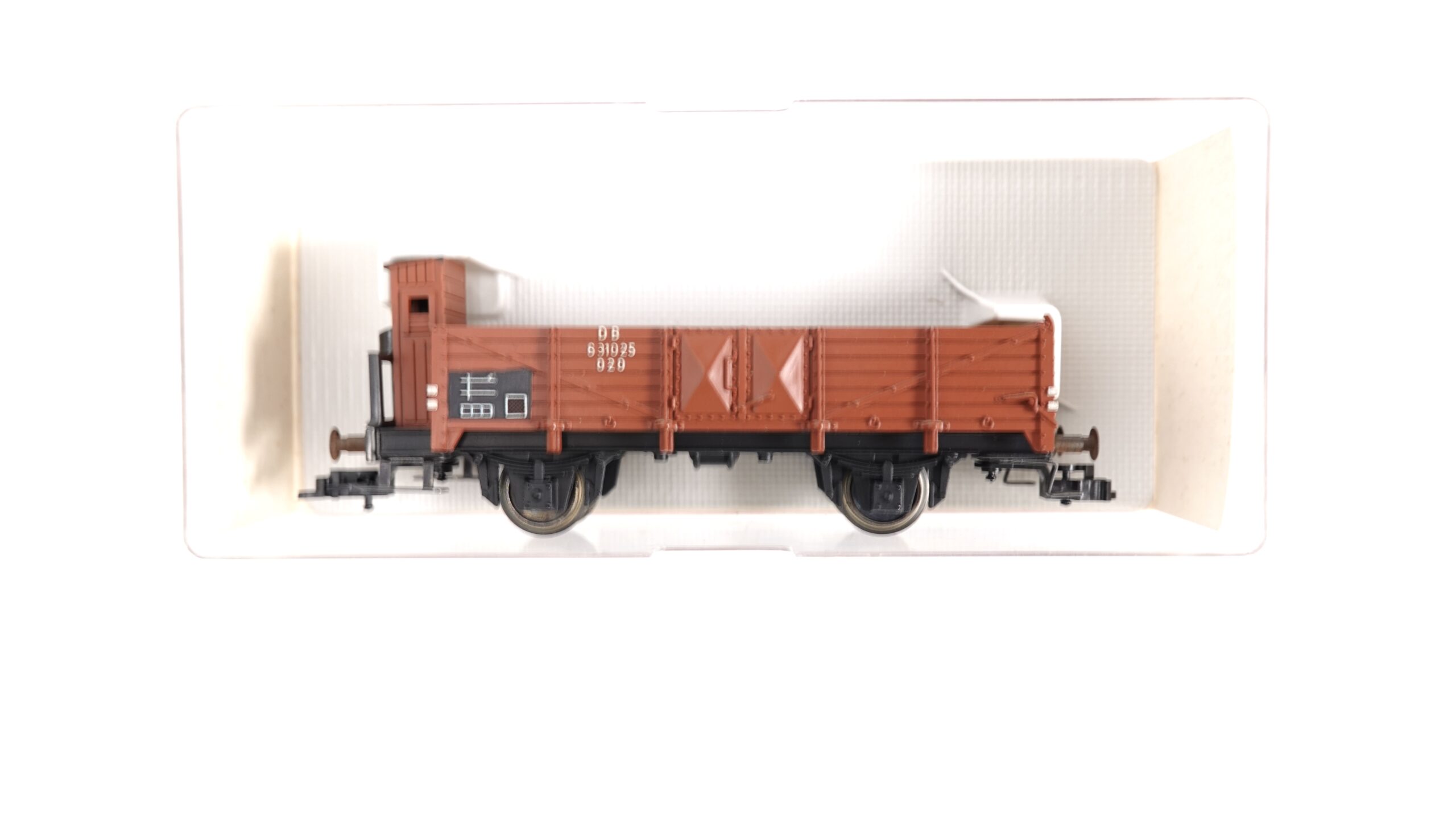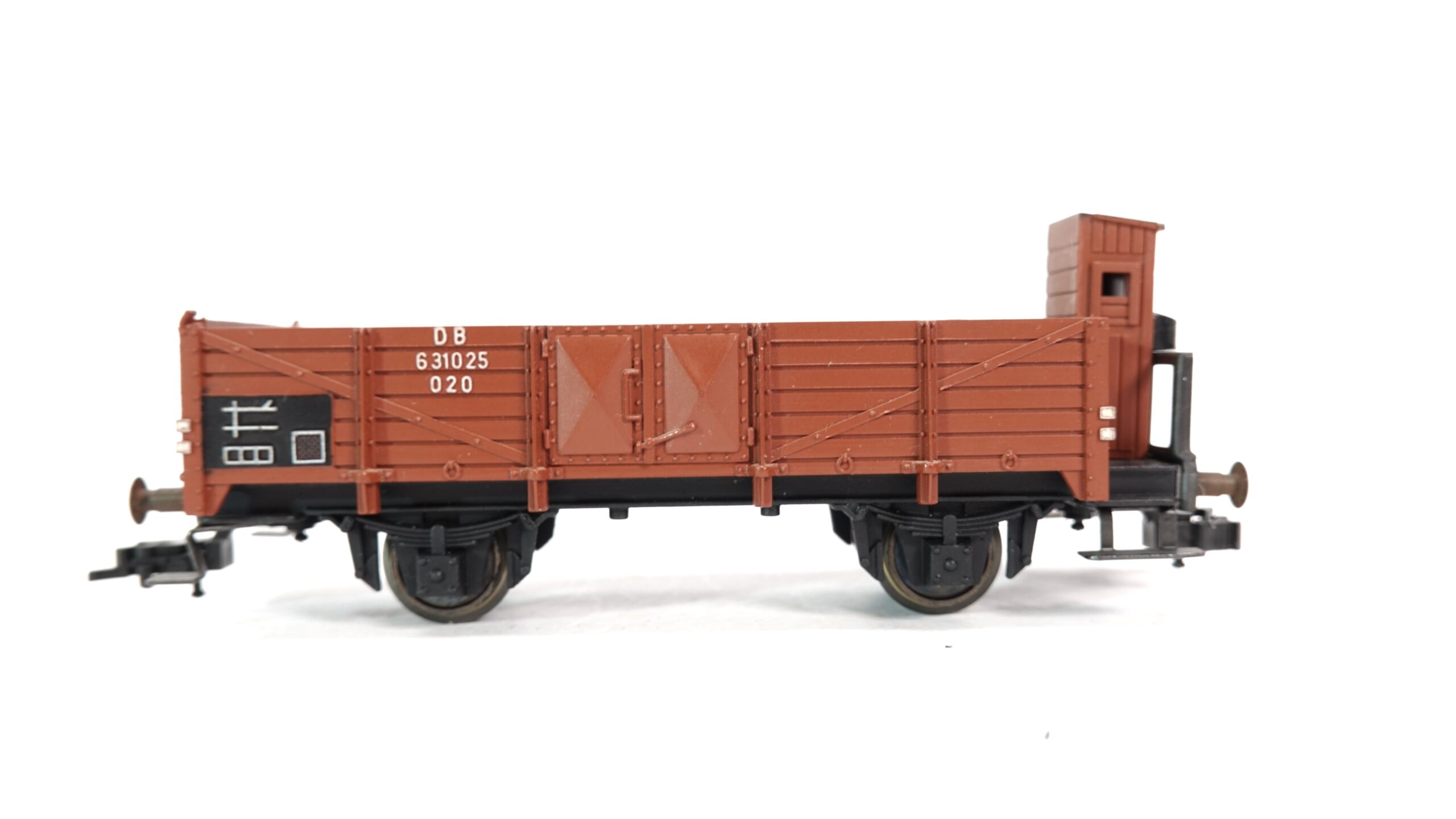 Dieses Modell ist in einem authentischen, rostbraunen Farbton gehalten und zeigt feinste Nachbildungen von Holzplanken-Strukturen, Verstrebungen und Scharnieren. Besonders auffällig ist das Bremserhaus am Wagenende, das typisch für ältere Güterwagen der DB ist und dem Modell einen historischen Charakter verleiht. Die Bedruckung ist gestochen scharf, inklusive der Wagennummer „631025 020“ und weiteren originalgetreuen Betriebskennzeichnungen.