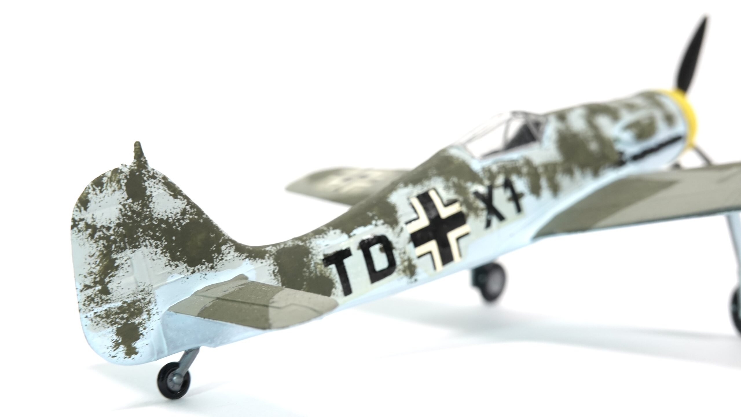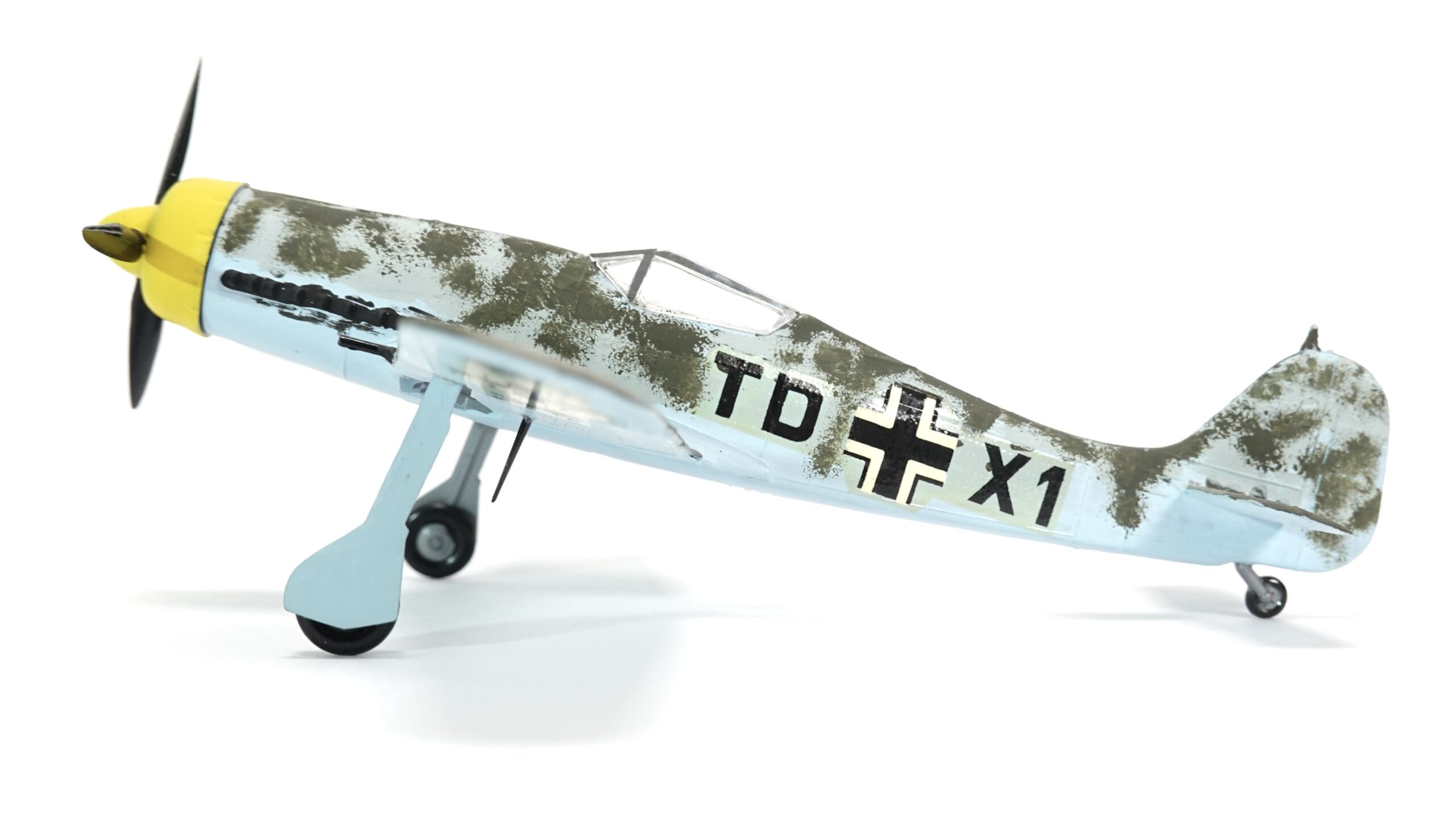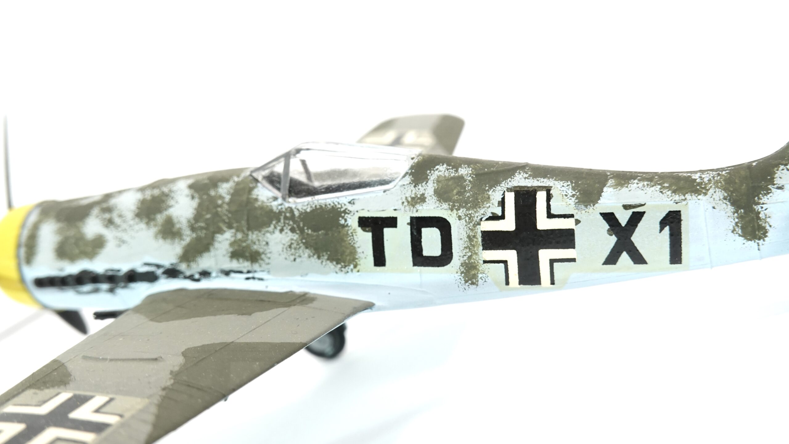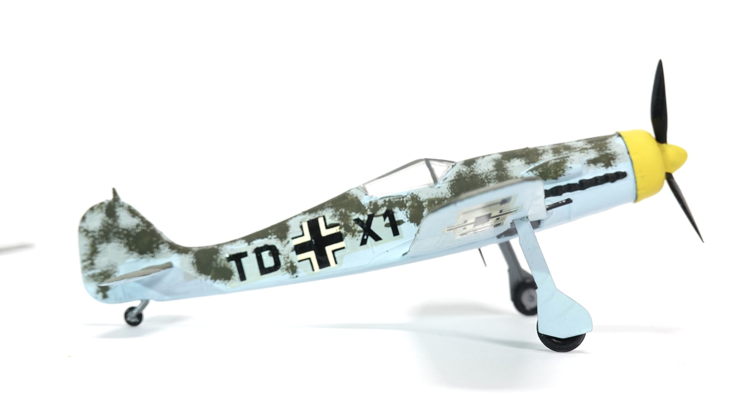 Dieses Modell zeigt eine besondere Tarnbemalung mit hellblauem Untergrund, olivgrüner Oberseite und gelber Motorhaube, wie sie bei Maschinen der Reichsverteidigung und an der Ostfront häufig vorkam. Der Tarnanstrich wurde in aufwendiger Handarbeit aufgetragen, was dem Modell einen einzigartigen Charakter verleiht. Anders als bei industriell gefertigten Miniaturen handelt es sich hier um ein individuell bemaltes Sammlerstück, das die Handschrift des Modellbauers trägt.