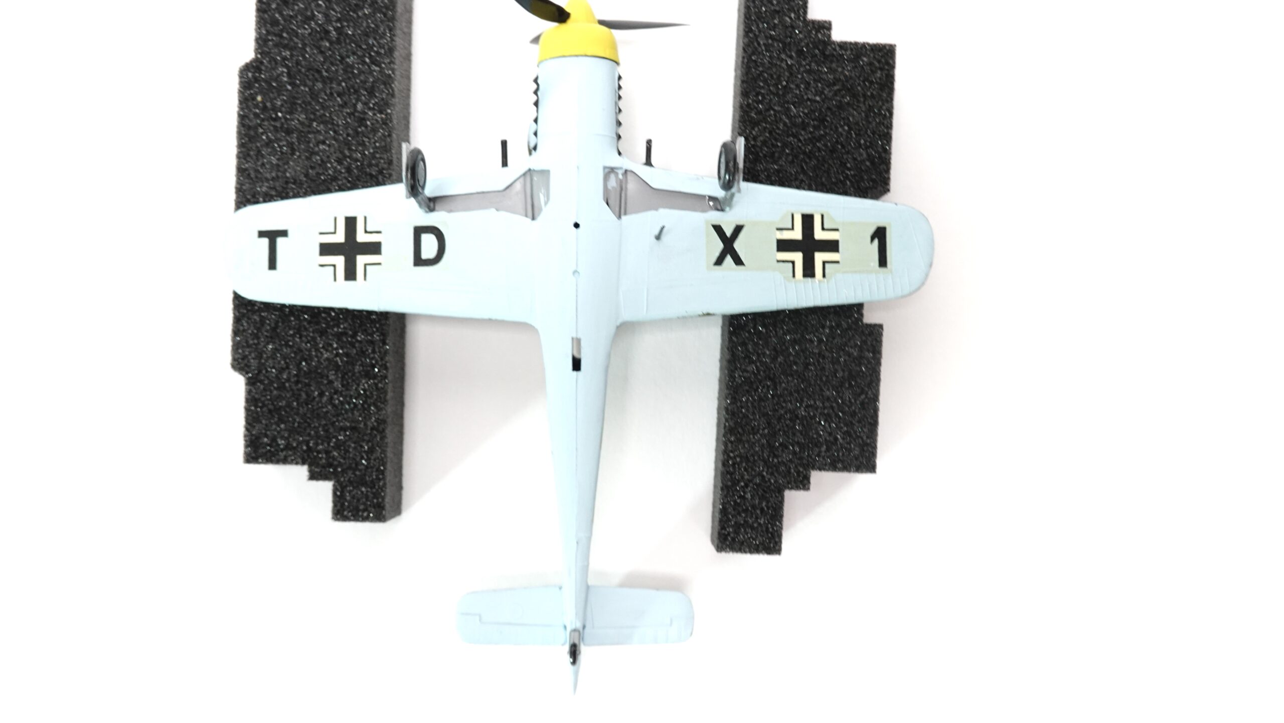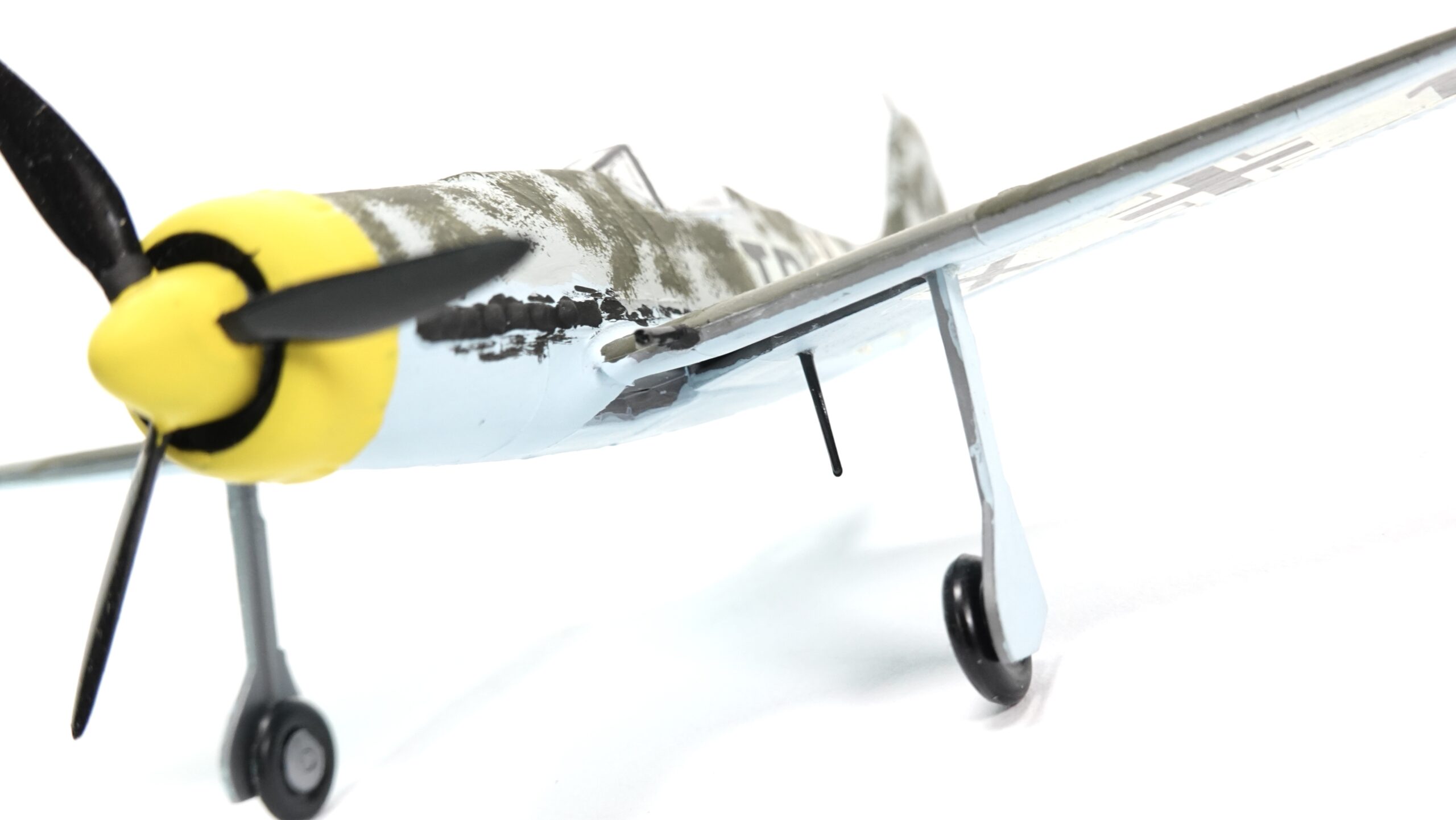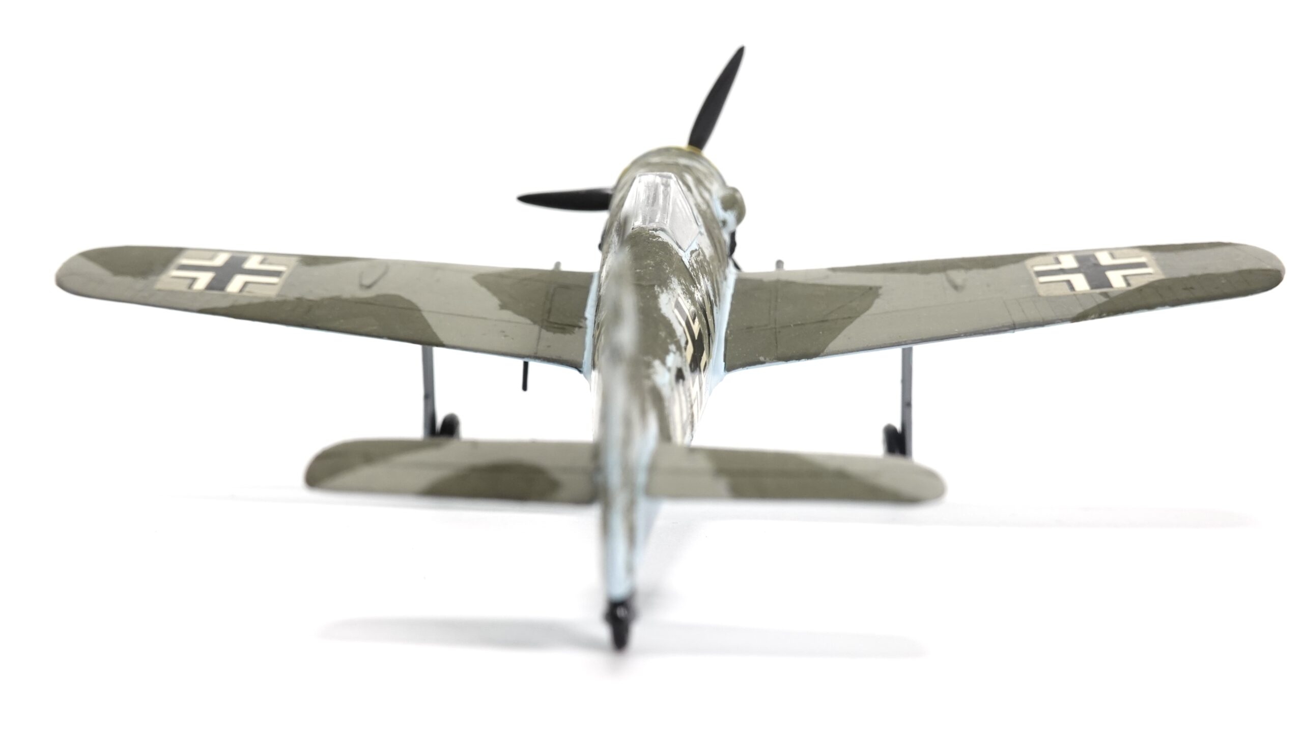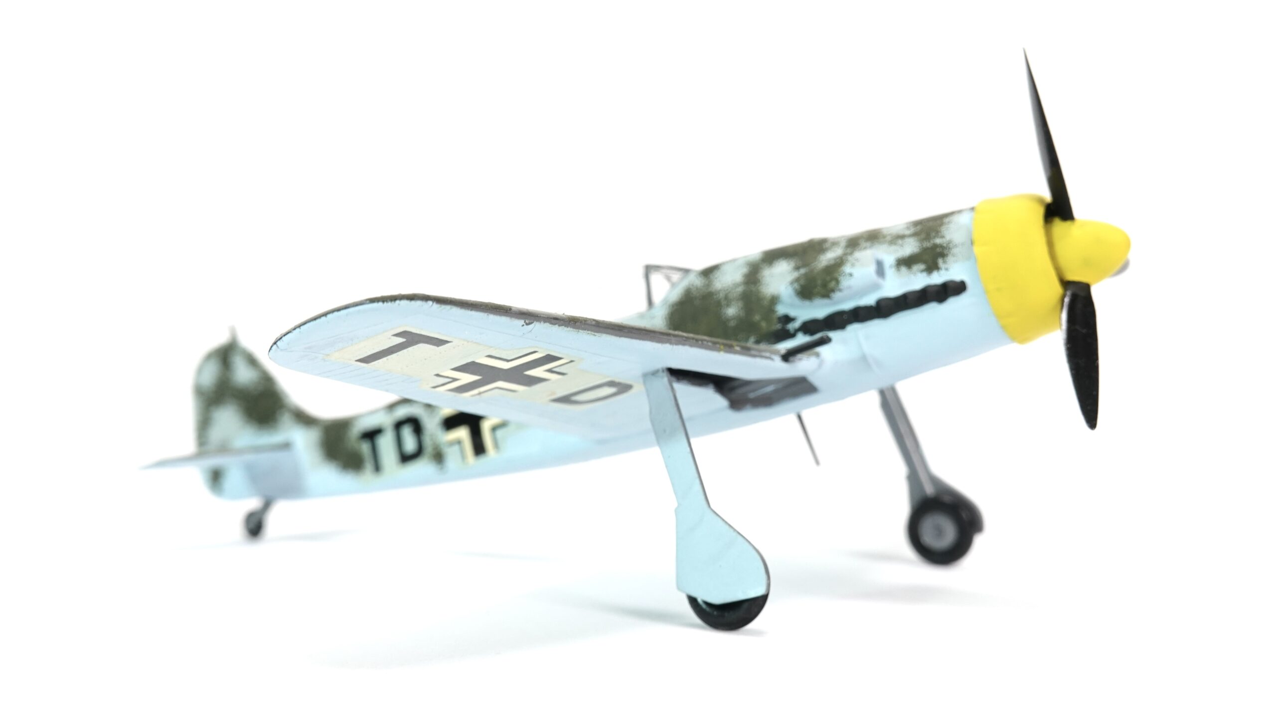 Dieses Modell zeigt eine besondere Tarnbemalung mit hellblauem Untergrund, olivgrüner Oberseite und gelber Motorhaube, wie sie bei Maschinen der Reichsverteidigung und an der Ostfront häufig vorkam. Der Tarnanstrich wurde in aufwendiger Handarbeit aufgetragen, was dem Modell einen einzigartigen Charakter verleiht. Anders als bei industriell gefertigten Miniaturen handelt es sich hier um ein individuell bemaltes Sammlerstück, das die Handschrift des Modellbauers trägt.