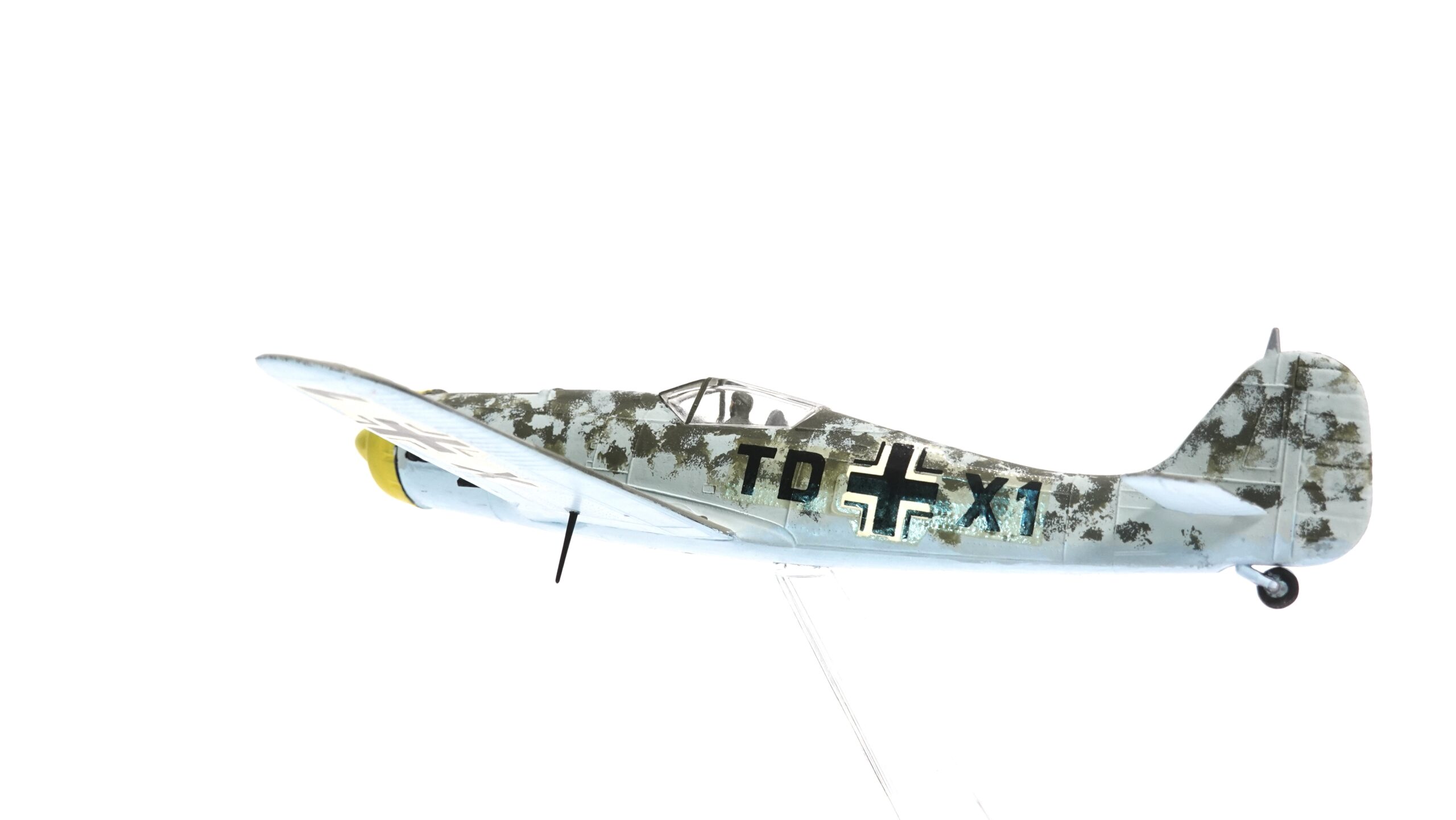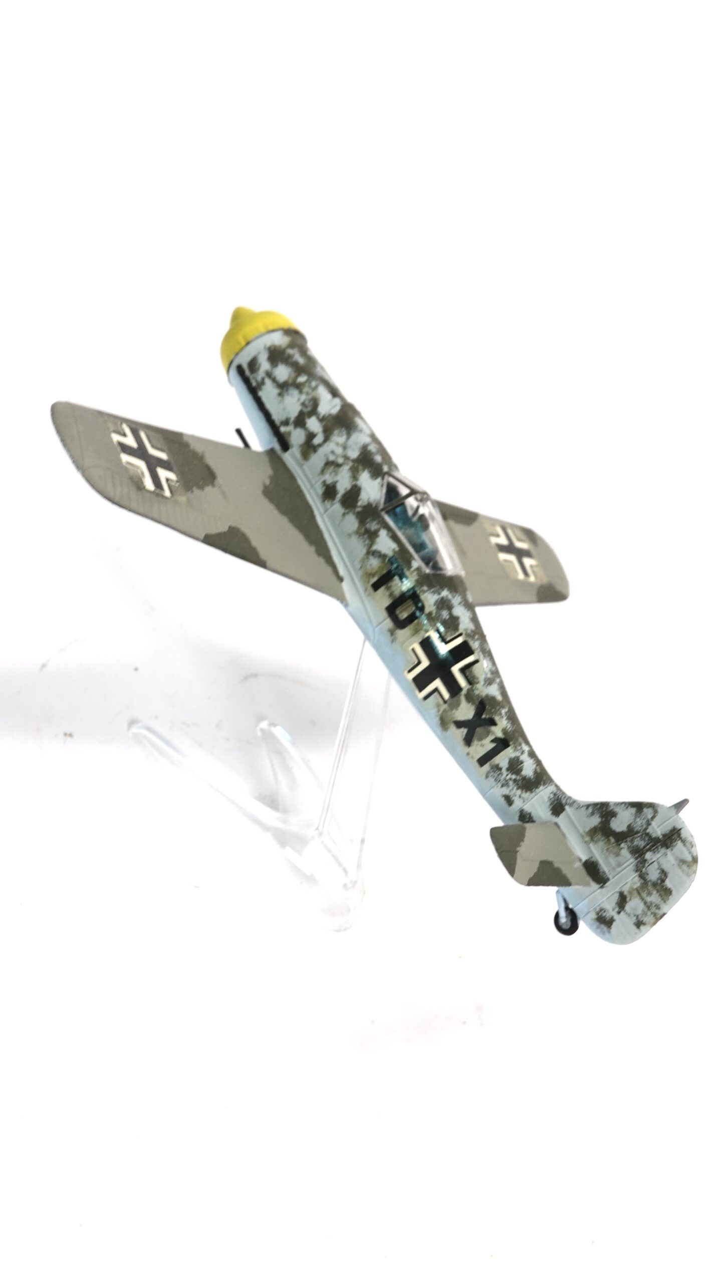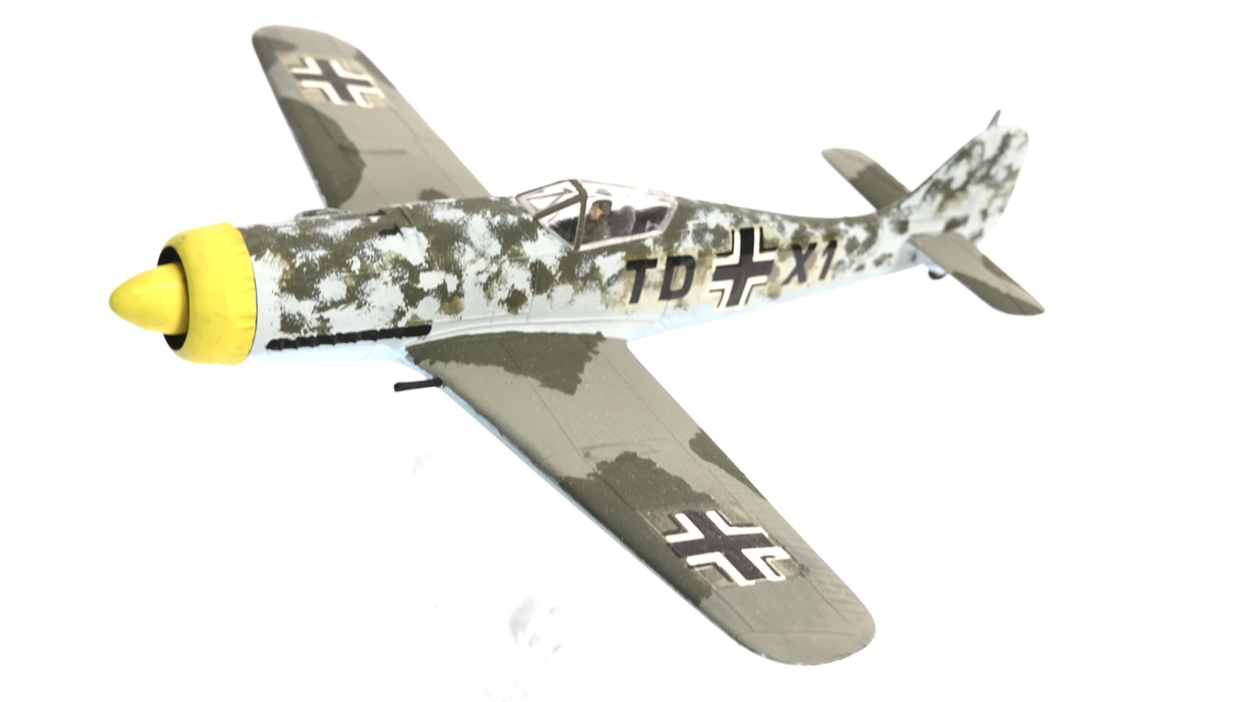 Dieses liebevoll handbemalte Modell stellt eine Focke-Wulf Fw 190 A-8 dar – eines der bekanntesten Jagdflugzeuge der deutschen Luftwaffe im Zweiten Weltkrieg. Im Maßstab 1:72 gefertigt, bietet dieses Modell eine originalgetreue Darstellung des einsitzigen Kampfflugzeugs, das ab 1941 in grosser Stückzahl produziert wurde. Die Maschine trägt die Markierung TD+X1 und zeigt eine authentische Wintertarnung mit weissem Fleckenmuster über grauer Grundfarbe sowie gelbem Spinner – typisch für die Ostfront-Einsätze.