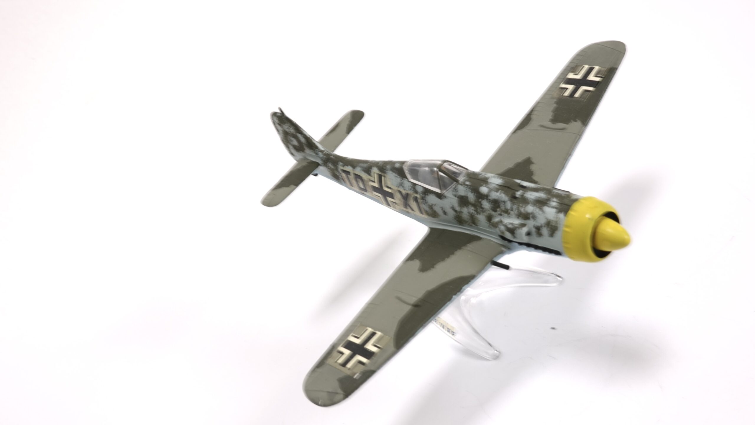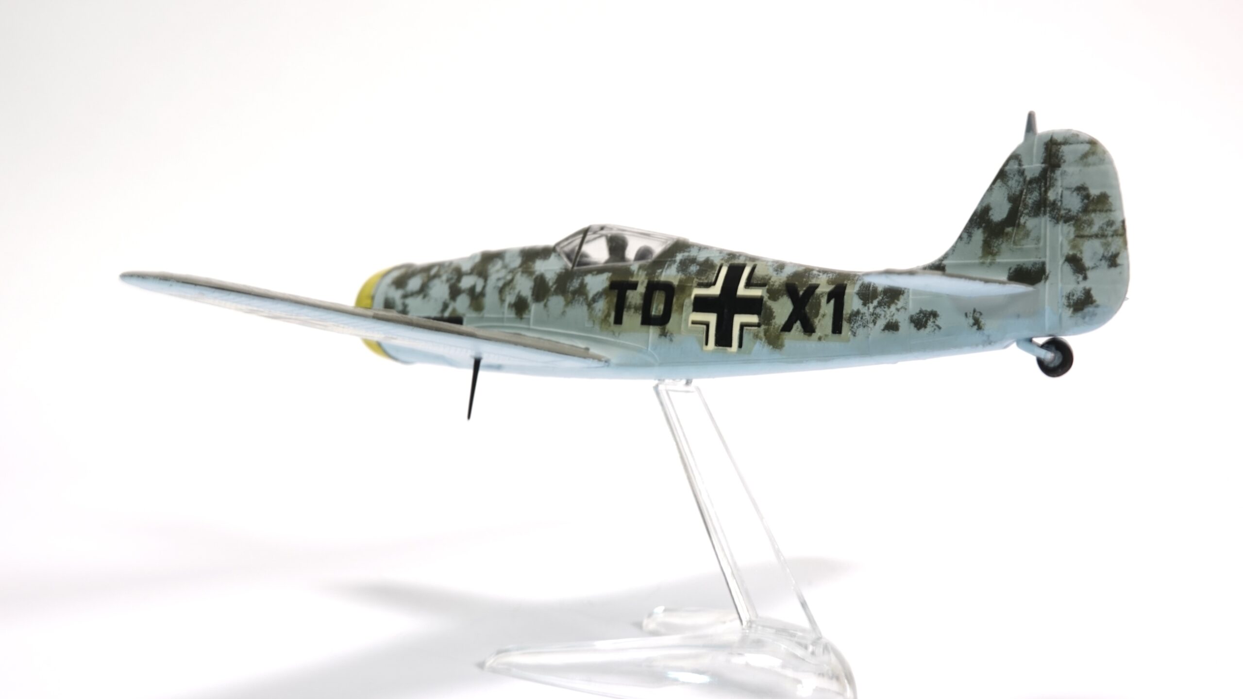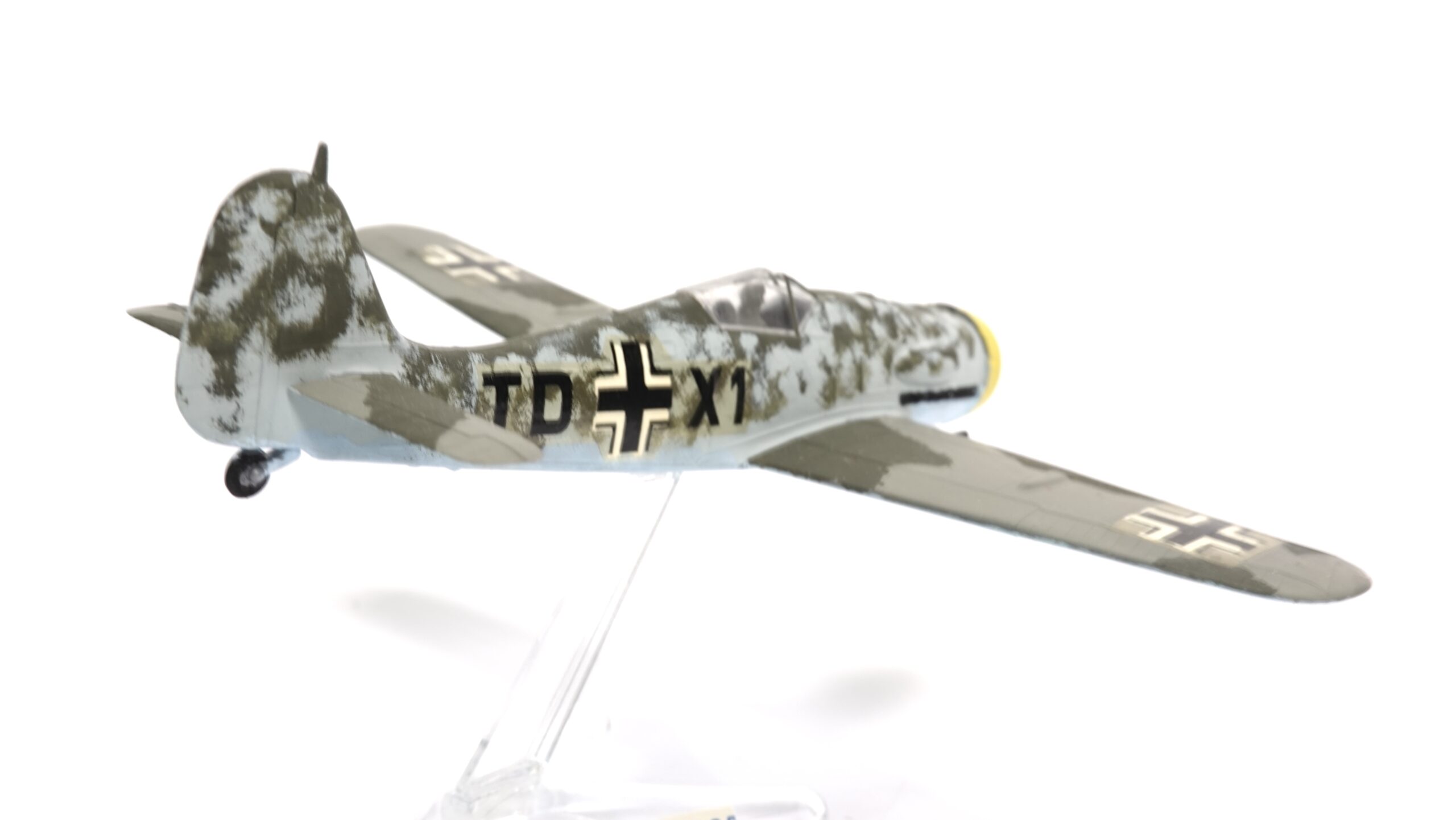 Im Luftkrieg über Europa erwies sich die Fw 190 als äußerst vielseitig. Sie wurde nicht nur als Jagdflugzeug eingesetzt, sondern auch als Jagdbomber, Erdkampfflugzeug und in späteren Versionen sogar als schwerer Jäger gegen alliierte Bomberverbände. Die Wintertarnung auf dem gezeigten Modell deutet auf Einsätze an der Ostfront hin, wo weiße oder helle Lackierungen die Maschinen besser gegen den Schnee tarnten.