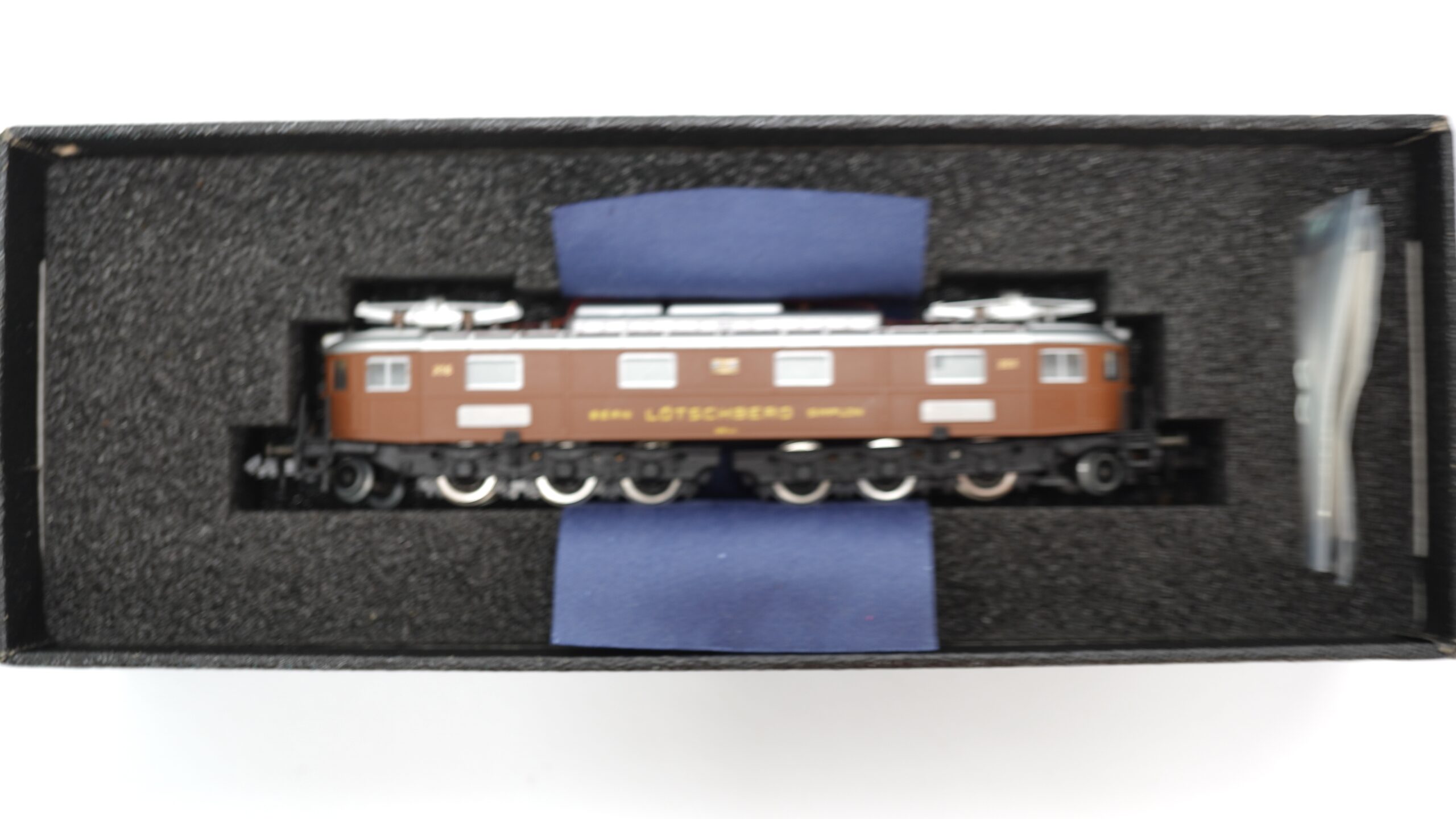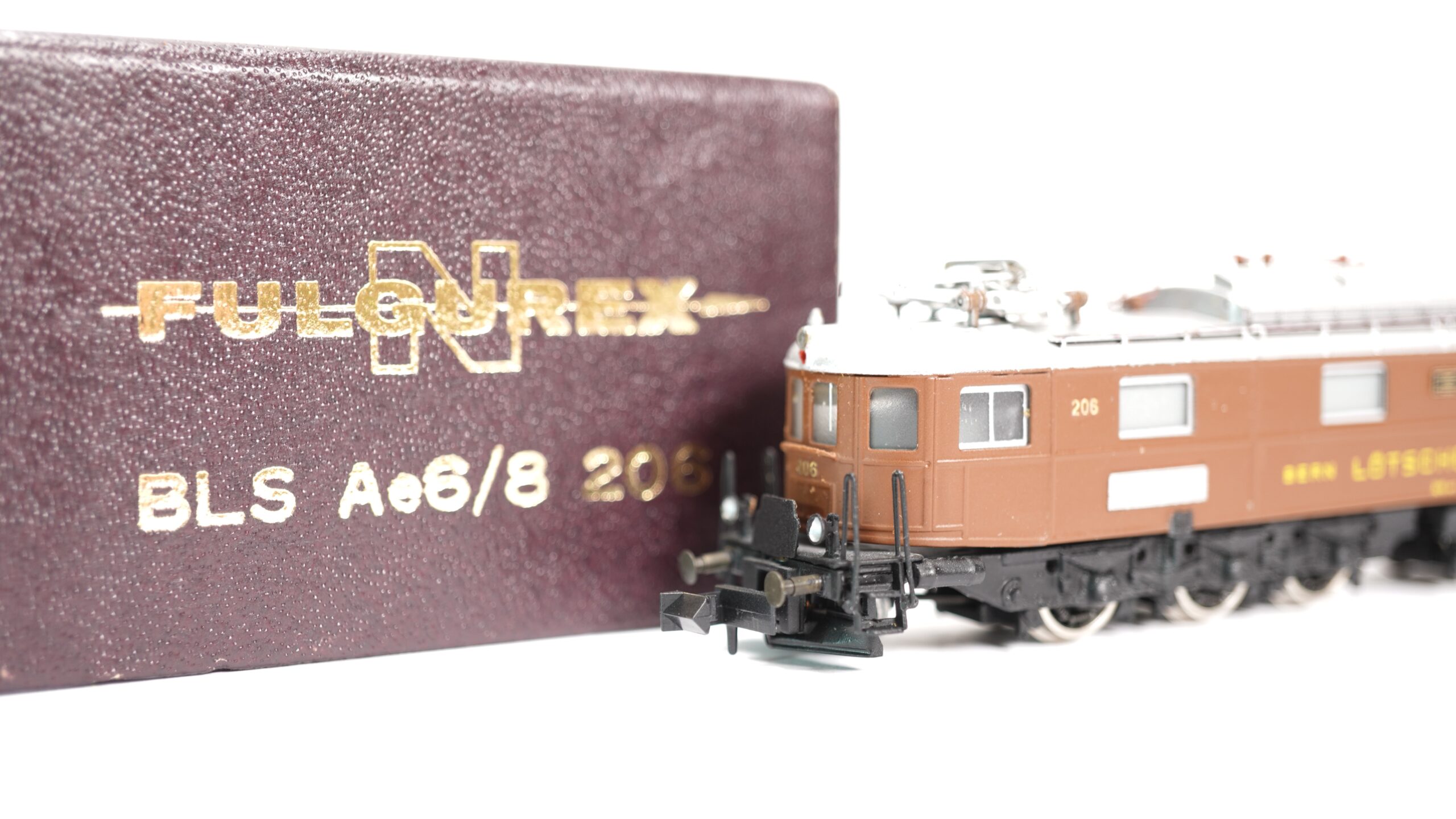 Zum Verkauf steht ein äußerst seltenes und hochwertiges Modell der schweizerischen Elektrolokomotive Ae 6/8 der Bern–Lötschberg–Simplon-Bahn (BLS), gefertigt vom renommierten Kleinserienhersteller Fulgurex in Messingbauweise. Das Modell trägt die Betriebsnummer 206 und ist in der klassischen braunen Farbgebung mit gelber BLS-Beschriftung „Bern – Lötschberg – Simplon“ ausgeführt. Es handelt sich um die Referenznummer 4203/2 N im Maßstab 1:160 (Spur N).