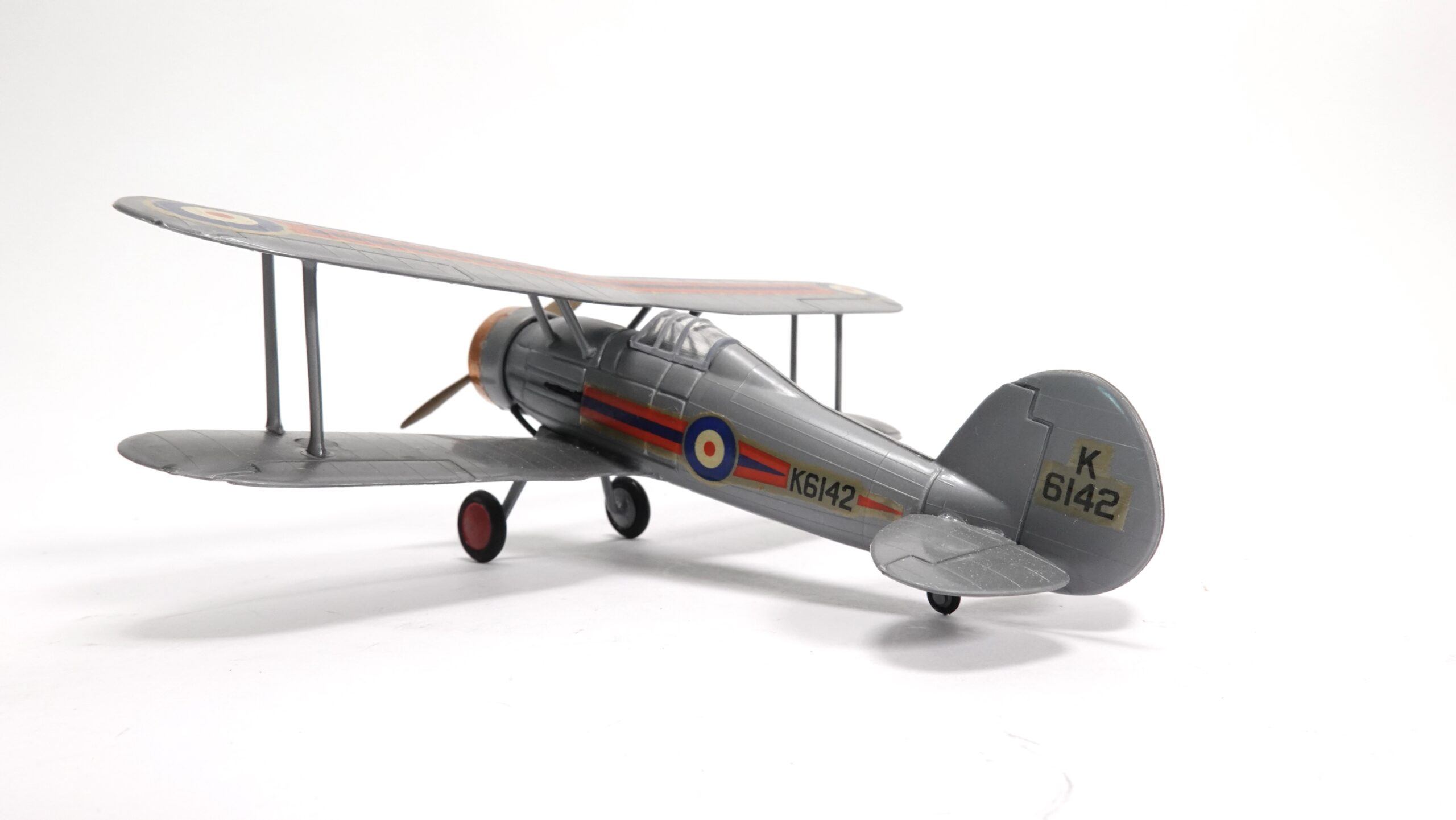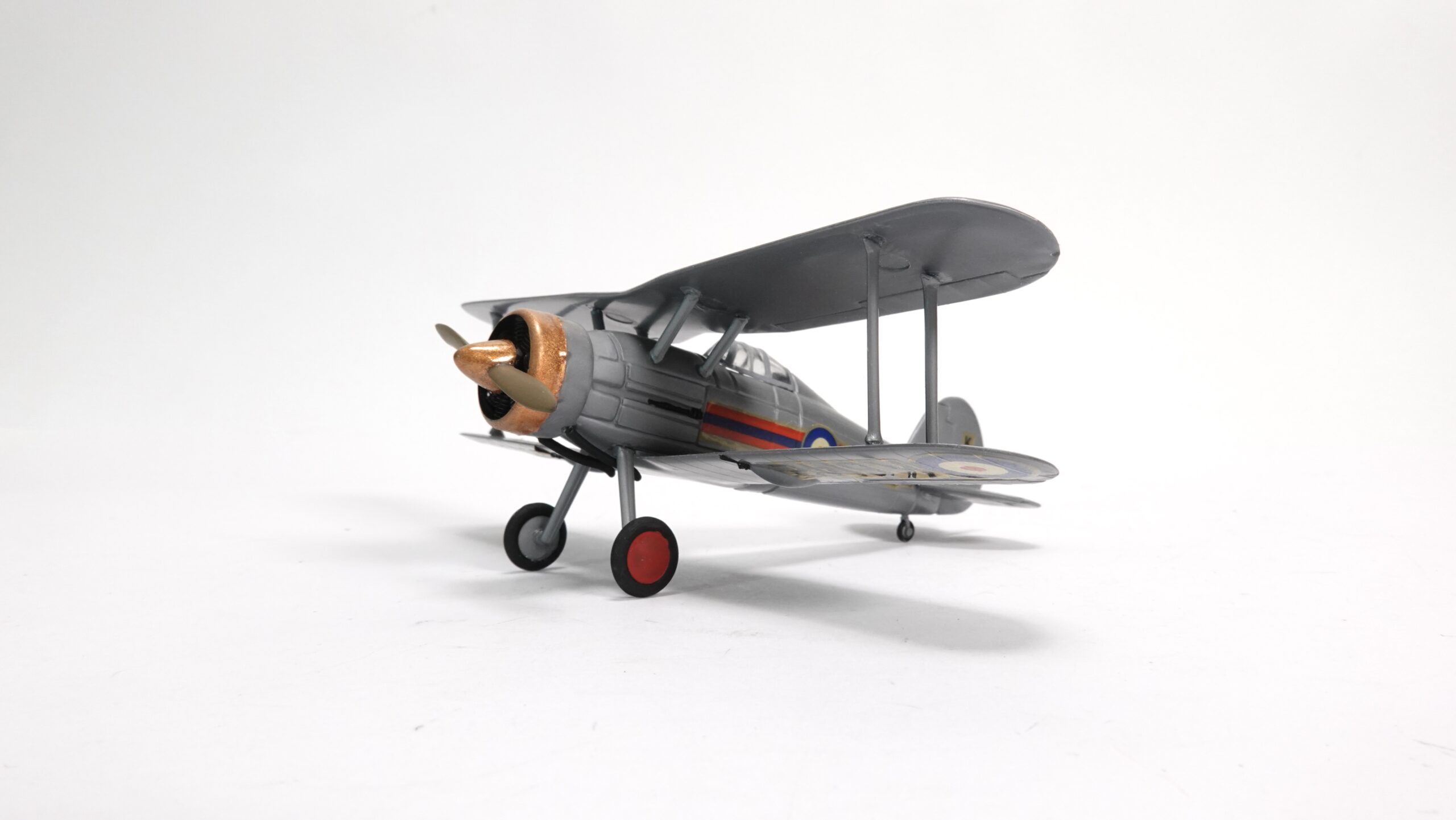 Der abgebildete Doppeldecker stellt einen britischen Jagdflieger der späten 1930er Jahre dar und orientiert sich optisch stark an der Gloster Gladiator Mk I, dem letzten in Serie produzierten Doppeldecker-Jagdflugzeug der Royal Air Force (RAF). Mit seiner typischen Doppeldecker-Bauweise, dem offenen Cockpit (beim Vorbild anfangs ohne, später mit Haube), dem Sternmotor und den markanten britischen Hoheitszeichen (Roundels) auf Flügel und Rumpf, spiegelt das Modell ein prägendes Kapitel der Vorkriegs- und frühen Kriegsfliegerei wider.