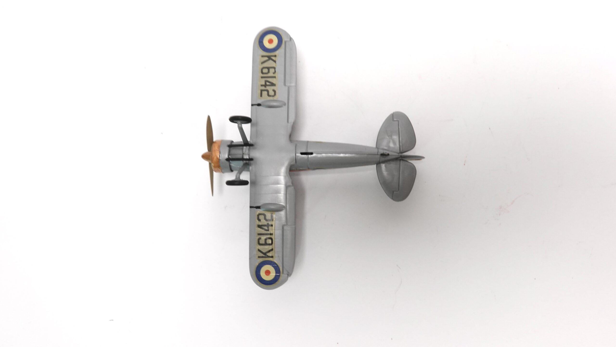 Das vorliegende Modell trägt die Betriebsnummer K6142, was auf ein reales Serienflugzeug der RAF hinweist. Die auffällige Lackierung mit den klassischen RAF-Roundels auf Ober- und Unterflügeln sowie den farbigen Rumpfbändern in Blau, Rot und Gelb ist typisch für den Vorkriegsanstrich der britischen Luftstreitkräfte. Die Propellerhaube in bronzefarbenem Ton und das silbergraue Finish unterstreichen den historischen Charakter des Flugzeugs.
