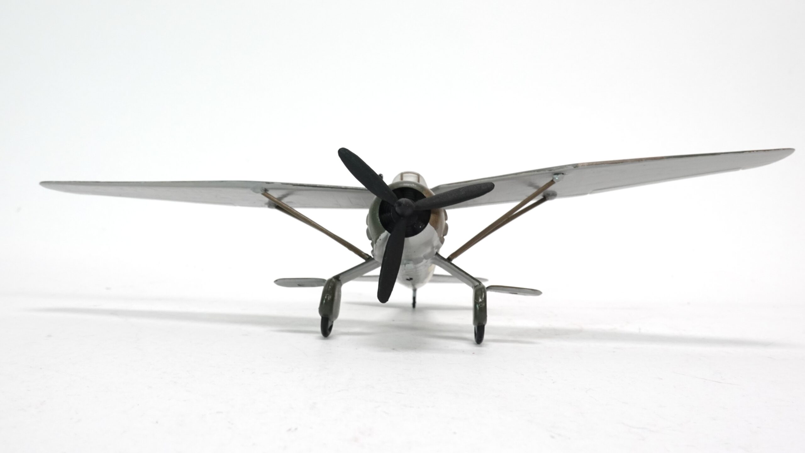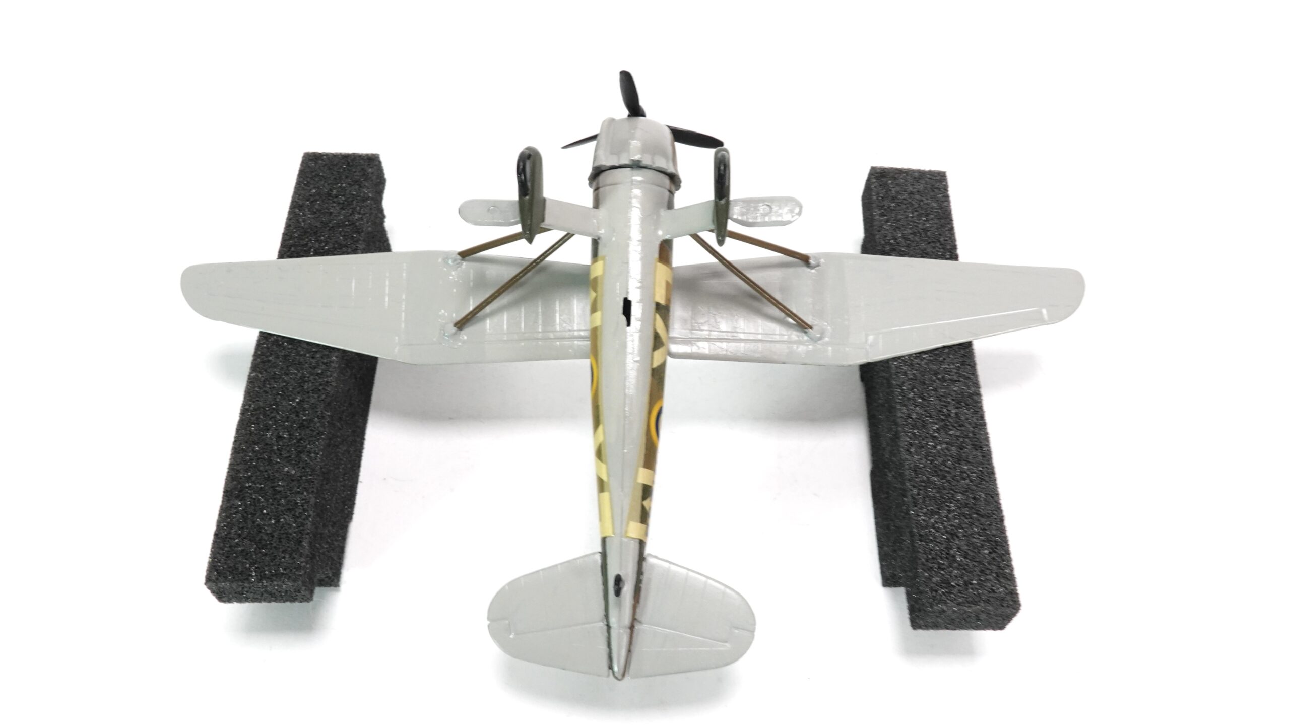 Das Modell ist im Maßstab 1:72 gefertigt und besteht aus bemaltem Kunststoff. Es wurde mit hoher Präzision und viel Liebe zum Detail per Hand veredelt – von der Tarnbemalung bis hin zur realistischen Cockpitverglasung. Auch das markante obere Tragflächenpaar mit den filigranen Streben wurde sorgfältig umgesetzt. Die Propeller und das Fahrwerk sind stimmig proportioniert und sorgen für ein authentisches Erscheinungsbild.