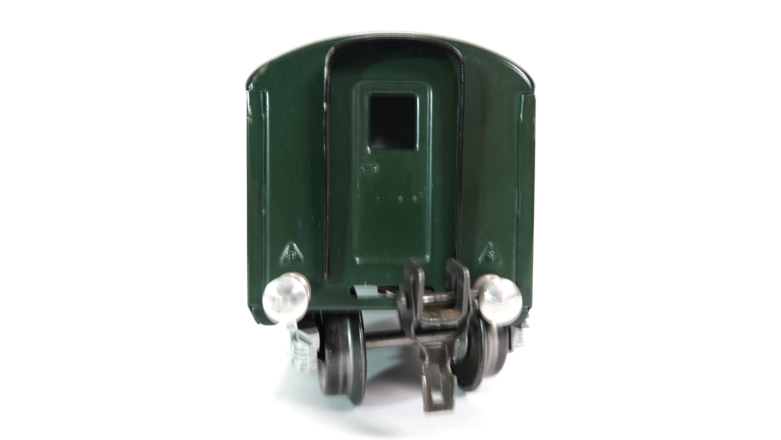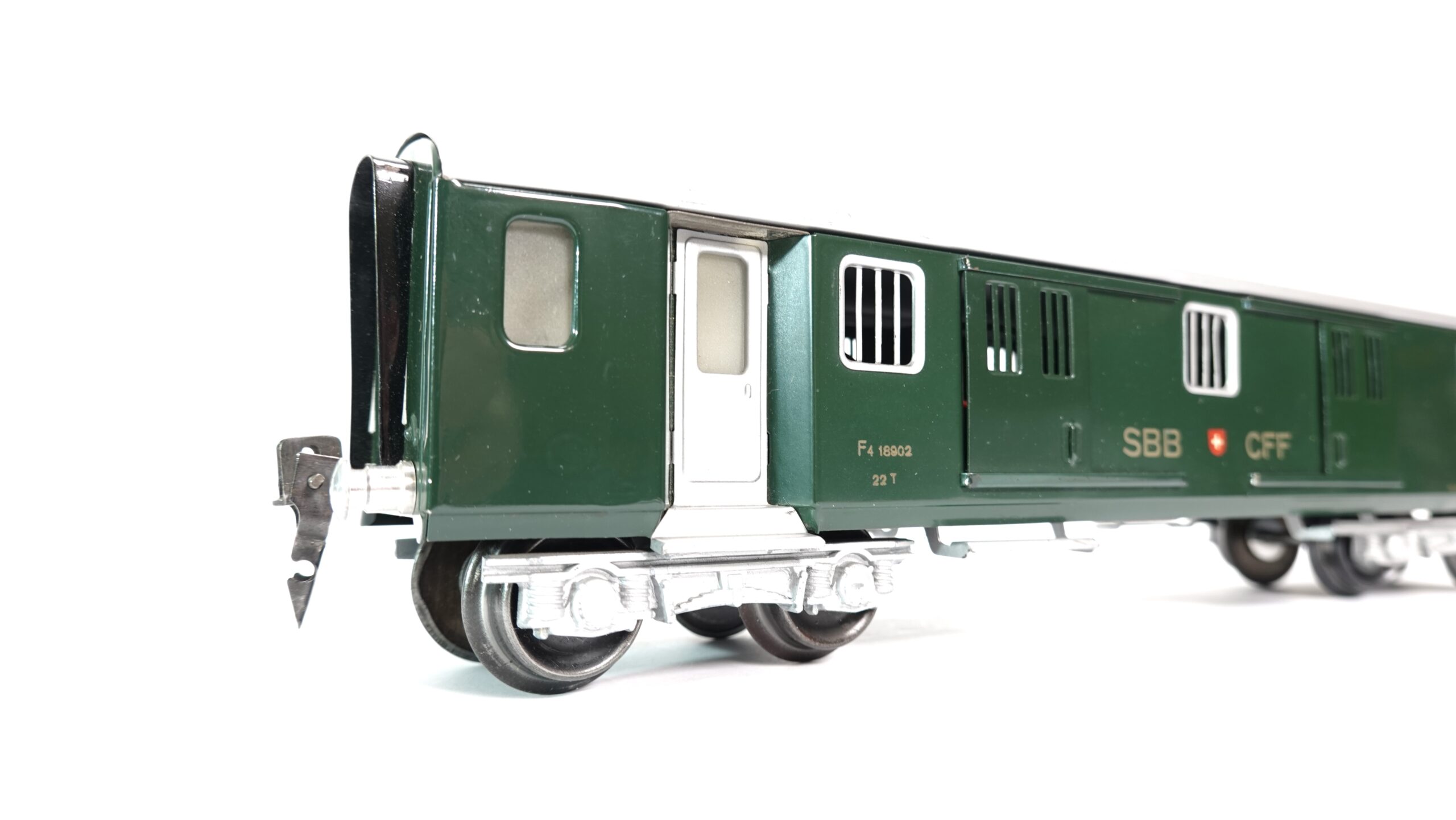 Das Modell von HAG spiegelt diesen praktischen Allrounder mit viel Liebe zum Detail wider. In robuster Ganzmetallbauweise gefertigt, strahlt der Wagen Solidität und Wertigkeit aus. Die klassische dunkelgrüne Farbgebung mit silbernem Dach entspricht dem typischen Erscheinungsbild der SBB-Wagen der 1950er- bis 1970er-Jahre. Die klaren, goldfarbenen Beschriftungen – inklusive der Aufschrift „SBB CFF“ und dem Schweizer Wappen – wirken hochwertig und sind vorbildgetreu angebracht.