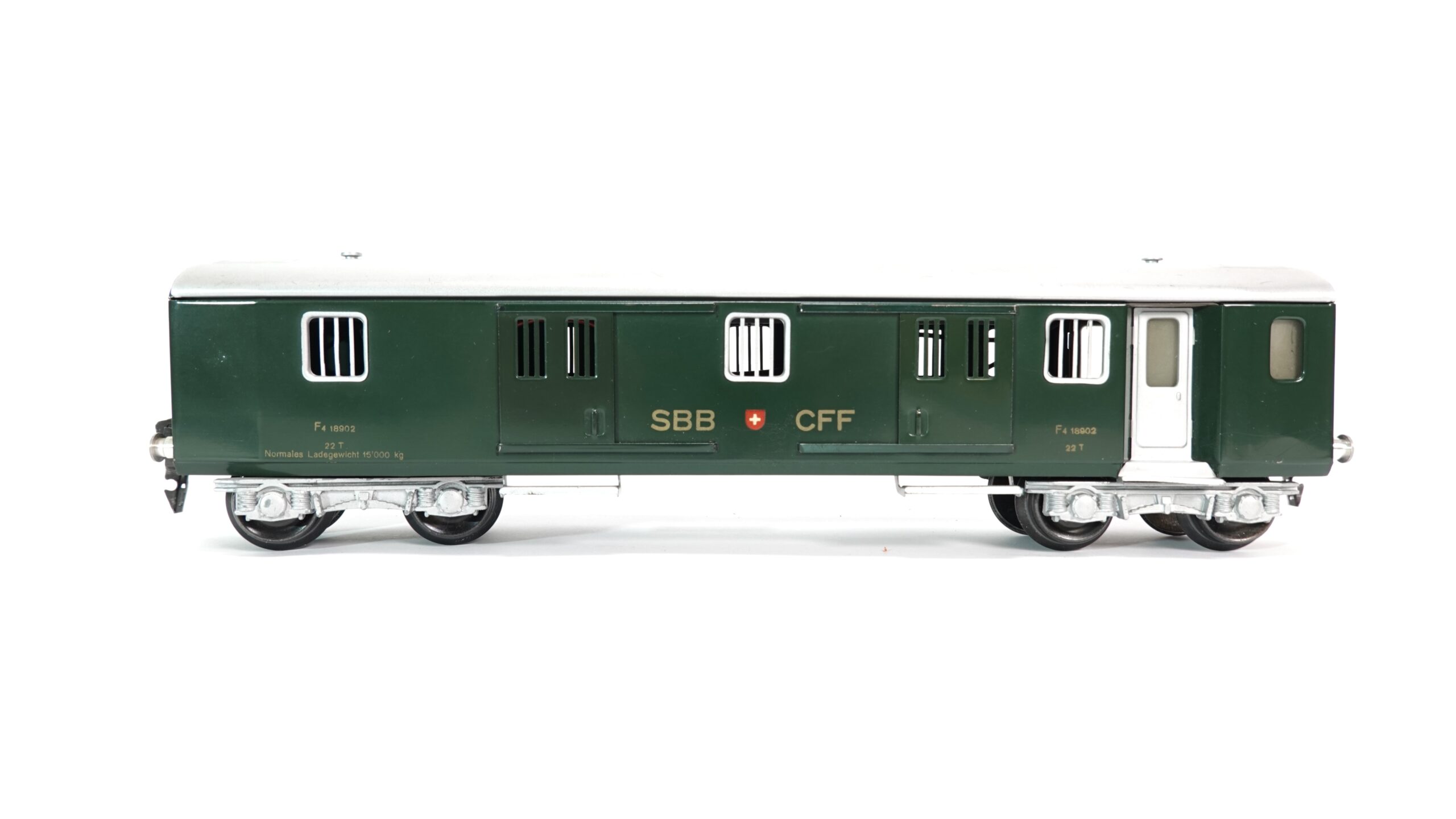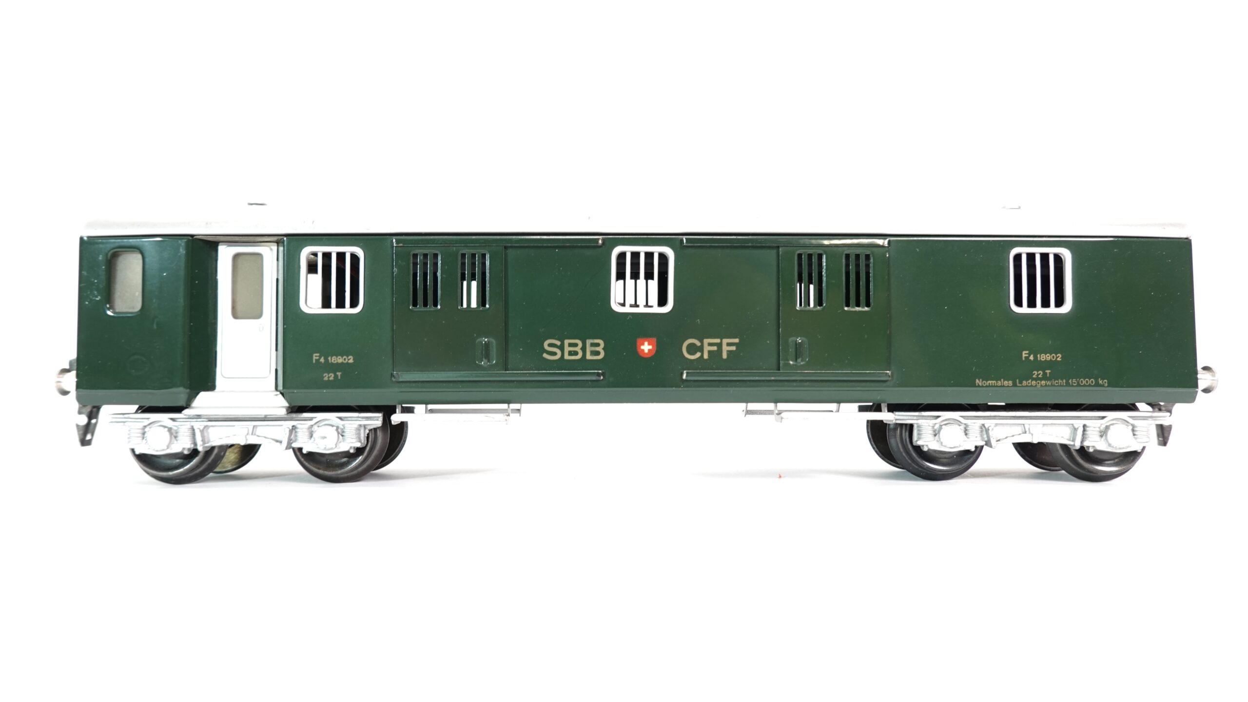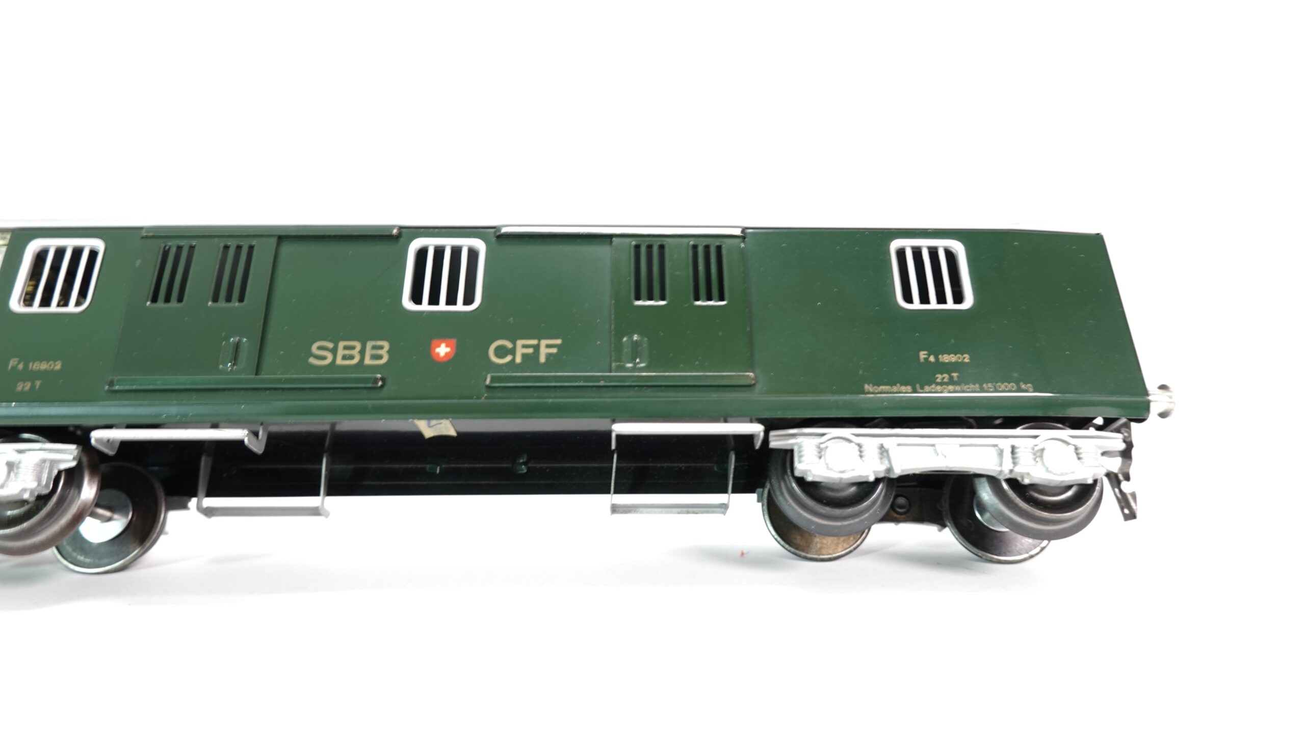 Die Wagennummer „F4 18902“ sowie technische Angaben wie das Ladegewicht (22 t bzw. 15.000 kg) unterstreichen die Authentizität. Die fein gearbeiteten Gitterfenster, Türen und die silbernen Drehgestelle runden das Bild ab. Durch seine Grösse in Spur 0 wirkt der Wagen besonders präsent und ist ein echter Blickfang, sowohl auf der Anlage als auch in der Vitrine.
