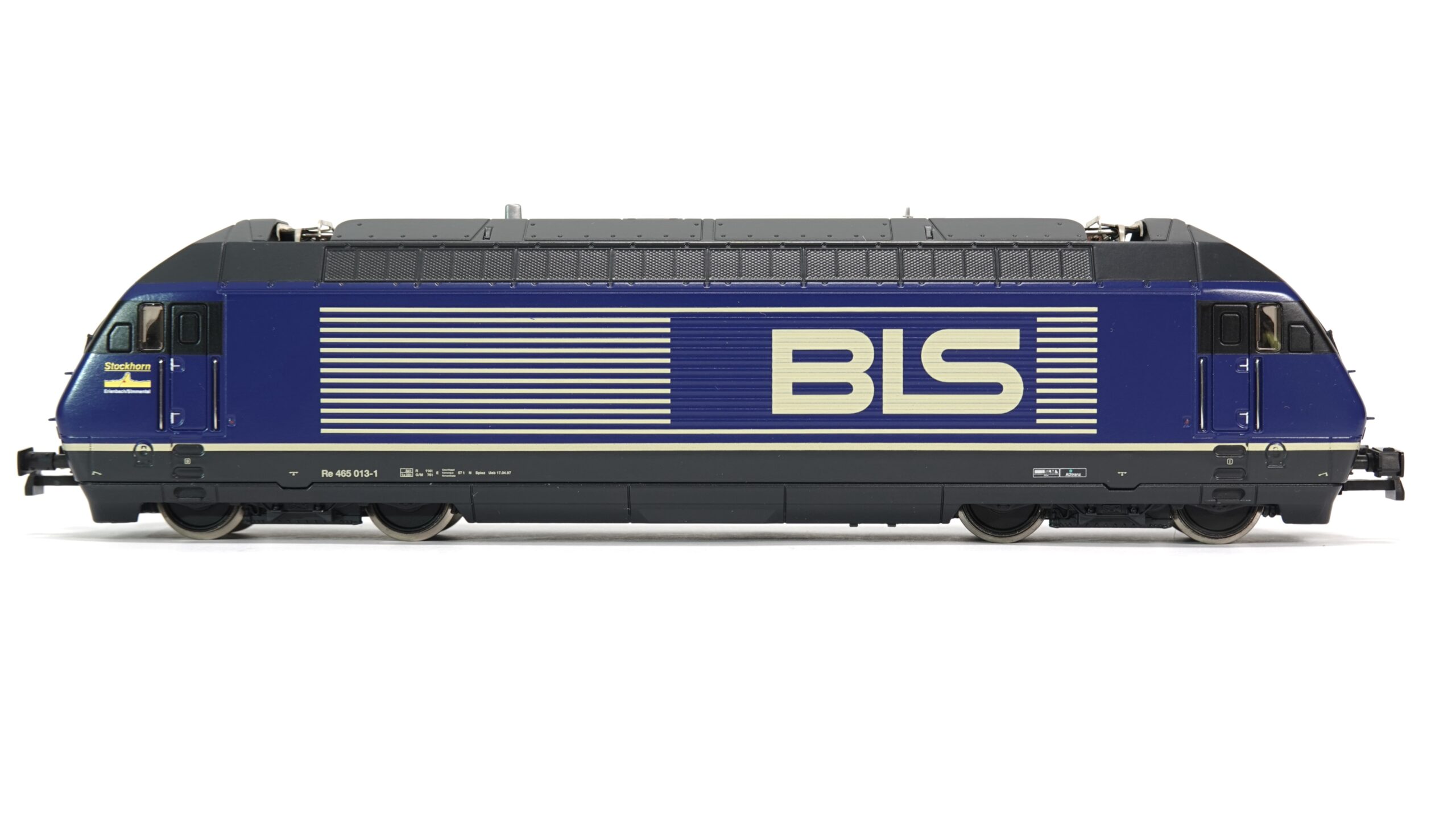 Die BLS Re 465 basiert auf der bewährten SBB Re 460 und wurde für den anspruchsvollen Güter- und Personenverkehr in der Schweiz optimiert. Mit ihrer starken Leistung und hohen Zuverlässigkeit kommt sie besonders auf den steilen Alpenstrecken zum Einsatz. Die Lokomotive 465 013 „Stockhorn“ wurde speziell gestaltet, um die enge Verbindung zwischen der BLS und der Region Berner Oberland zu symbolisieren. Das Stockhorn, eine der bekanntesten Bergformationen der Region, dient als Namensgeber und prägt das eindrucksvolle Design der Lok.