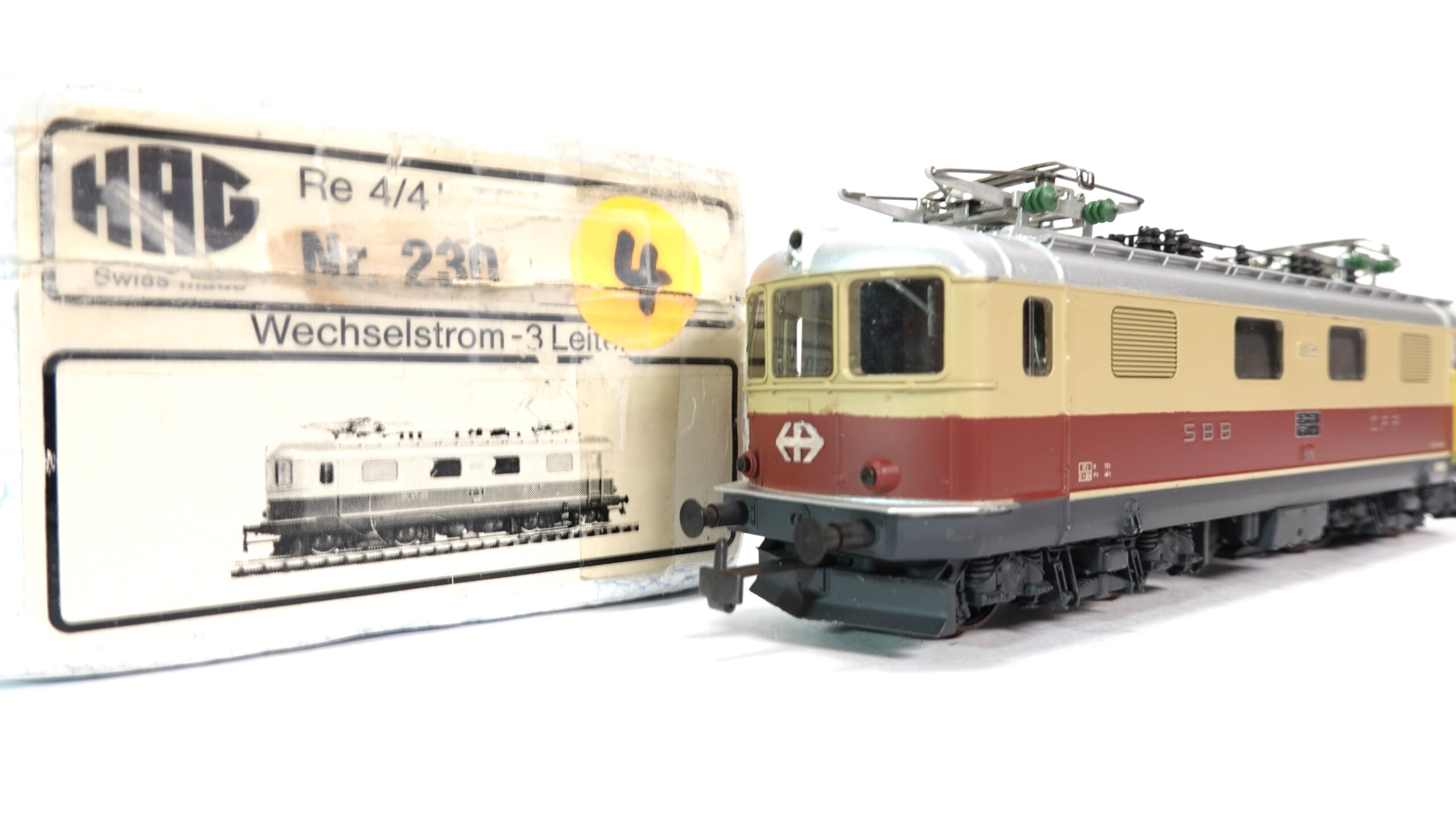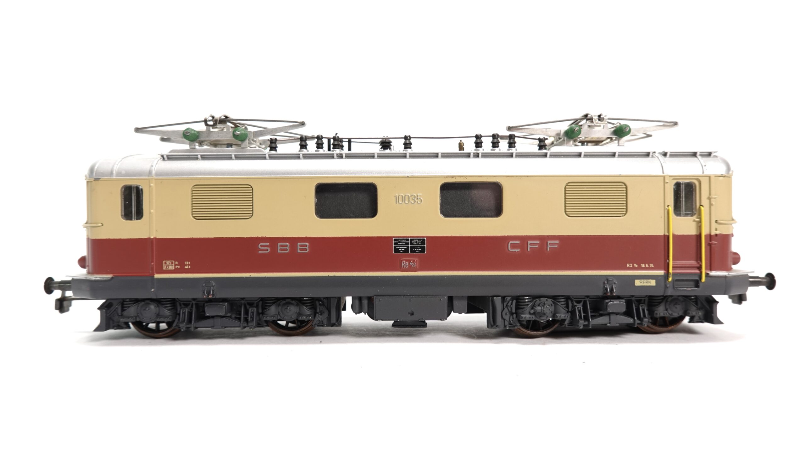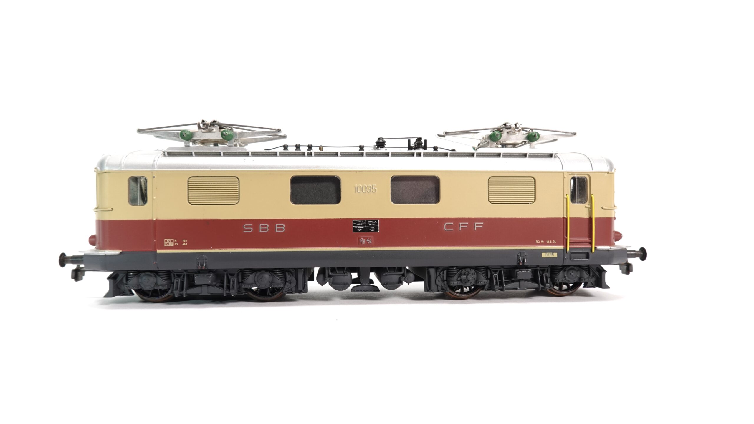 Das H0-Modell HAG 230 stellt die Lokomotive 10035 in typischer HAG-Qualität dar: massives Metallgehäuse, detailreiche Gravuren, klare Fenster und fein aufgedruckte Beschriftungen. Die Lackierung in TEE-Farben – Beige mit dunkelrotem Streifen – ist sauber aufgebracht und entspricht der typischen Erscheinung der Re 4/4 I in dieser Ausführung.