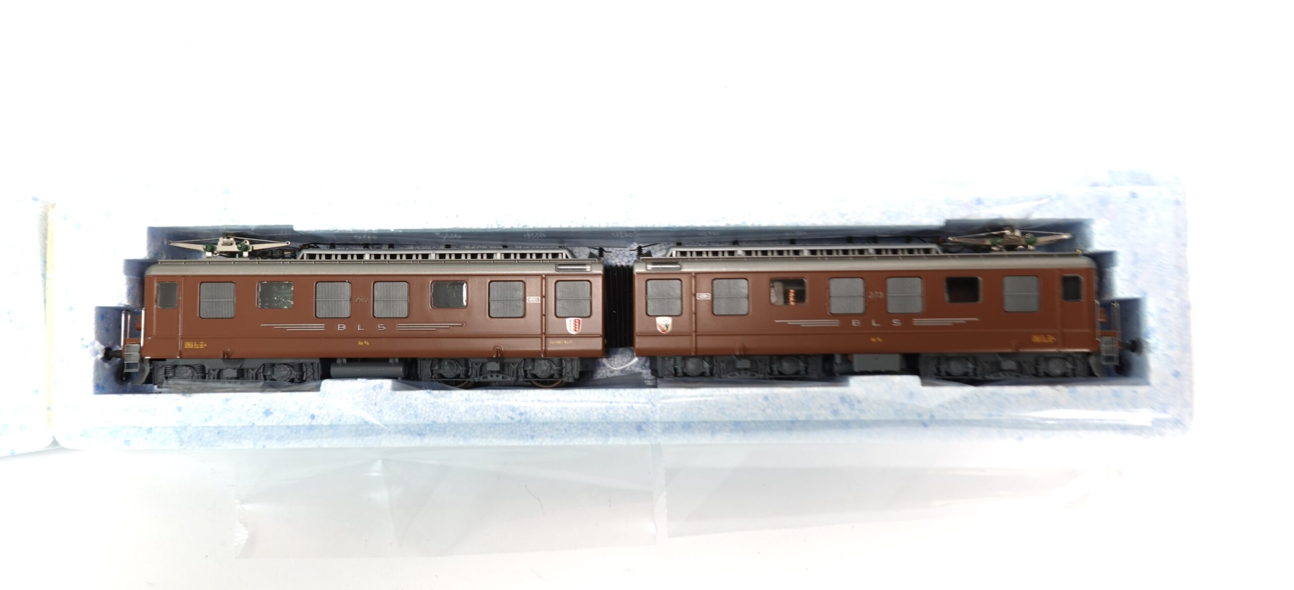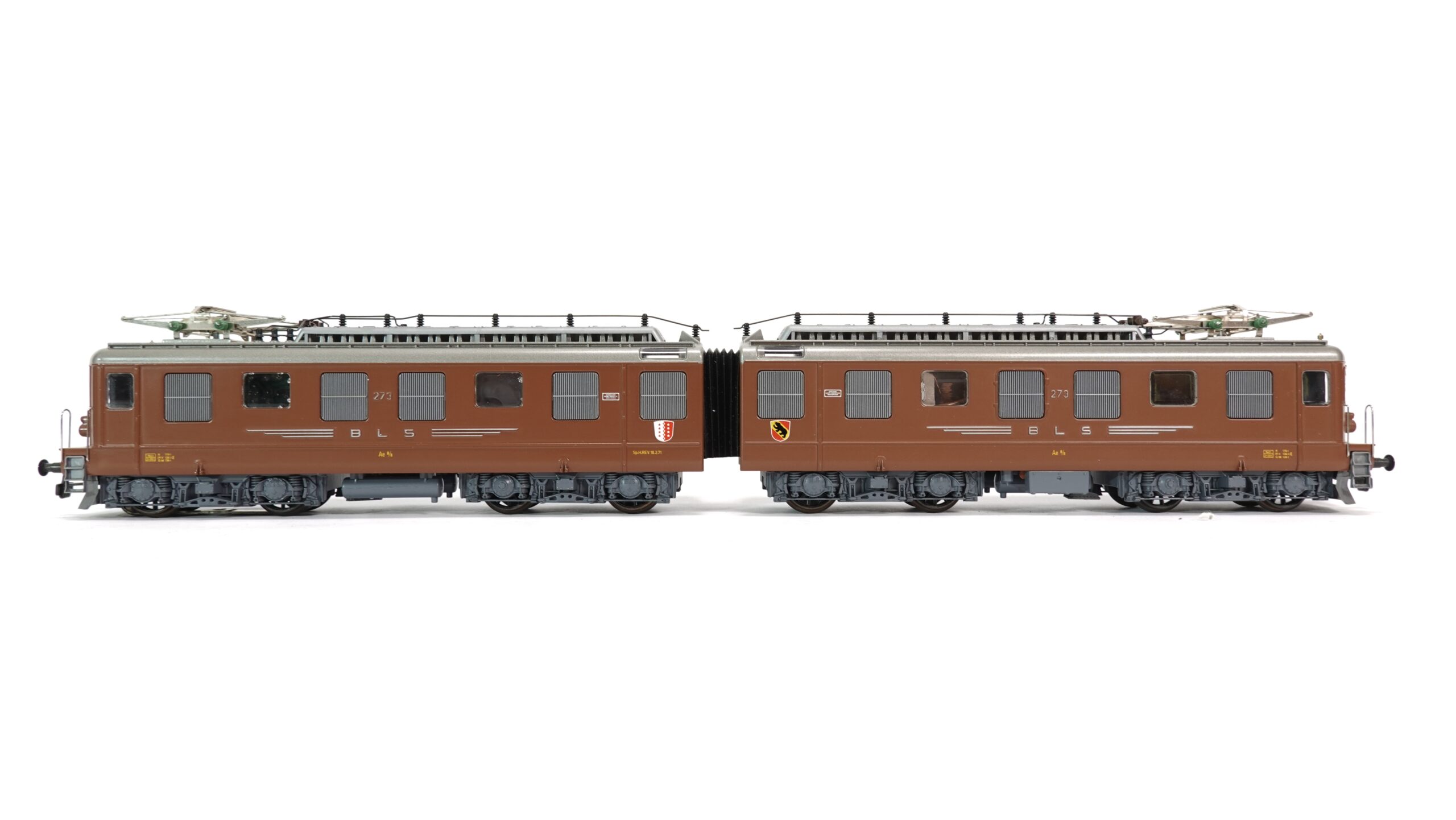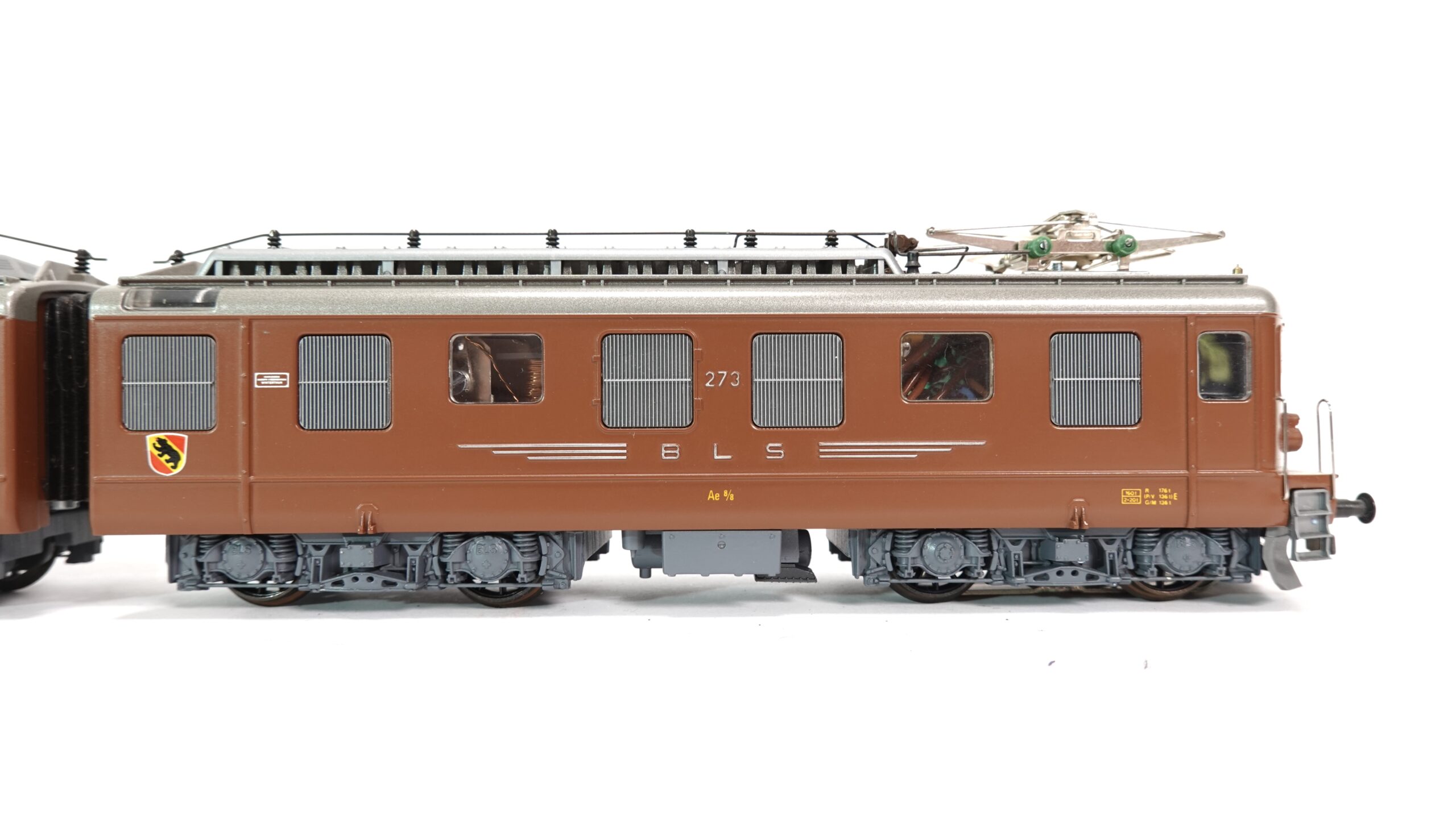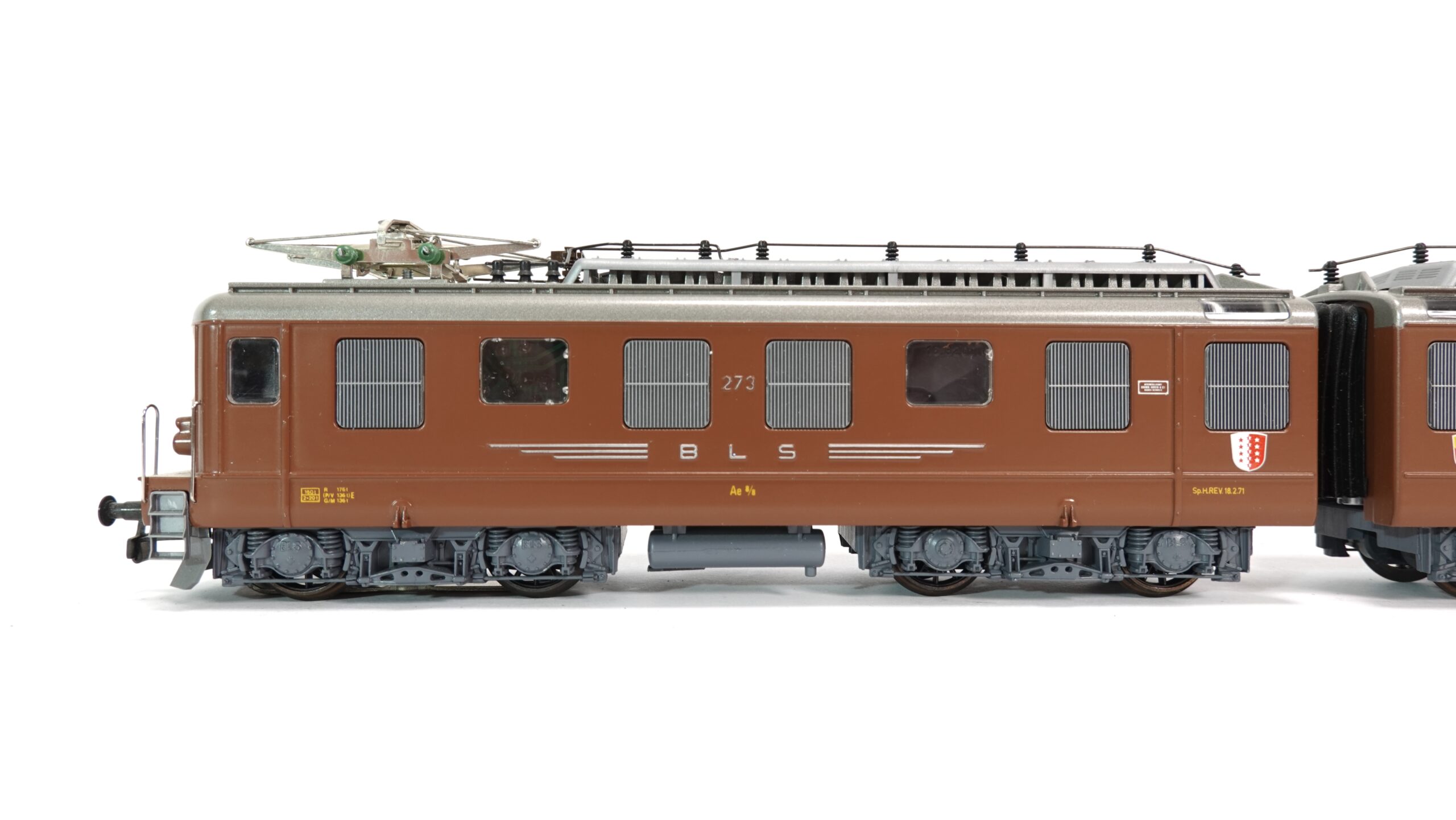 Die HAG 240 Ae 8/8 ist ein echter Brocken aus solidem Metall, gefertigt in feinster Schweizer Modellbauqualität. Die Lok kommt im klassischen braunen BLS-Look, mit silbernem Dach, klaren Fensterverglasungen, sauber aufgedruckten Wappen (darunter das Wallis und Bern – schöne Grüße vom Tunnel!) und natürlich dem dezent angebrachten „273“.