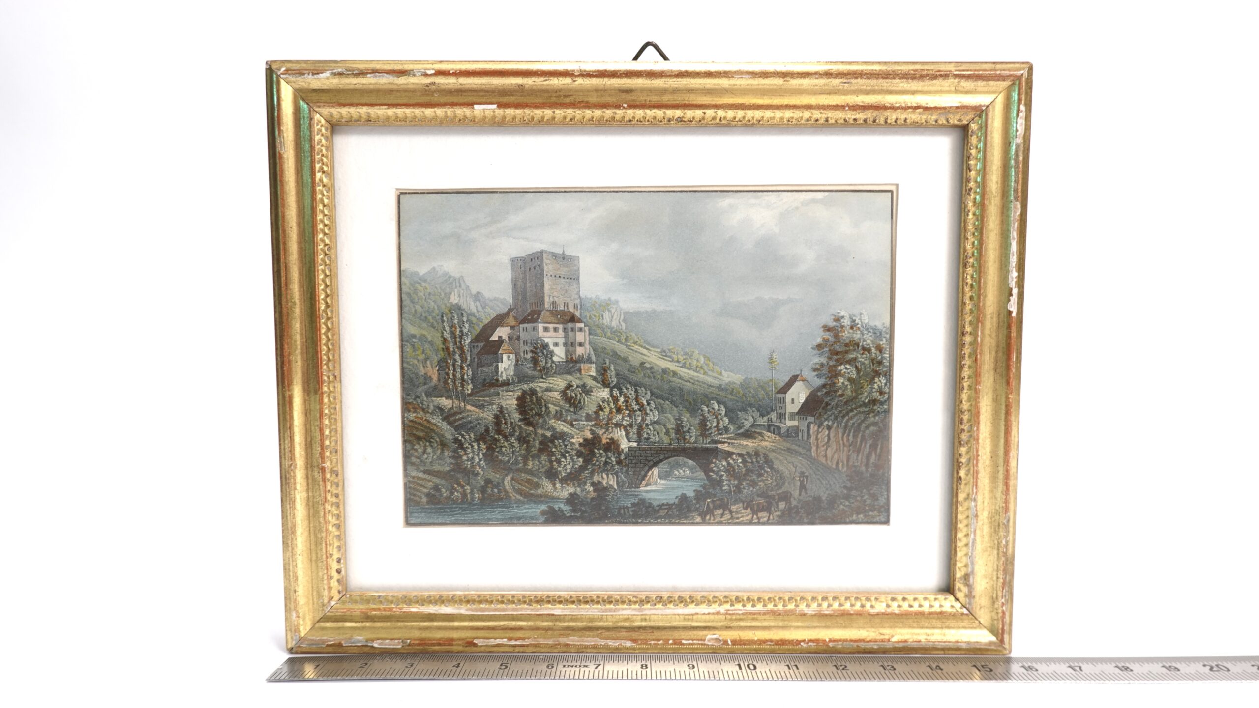 Die Burg-Landschaftsansicht als handkolorierter Kupferstich verbindet kunsthistorische Relevanz mit zeitloser Eleganz und sorgt für eine einzigartige Atmosphäre voller Geschichte, Romantik und handwerklicher Perfektion.