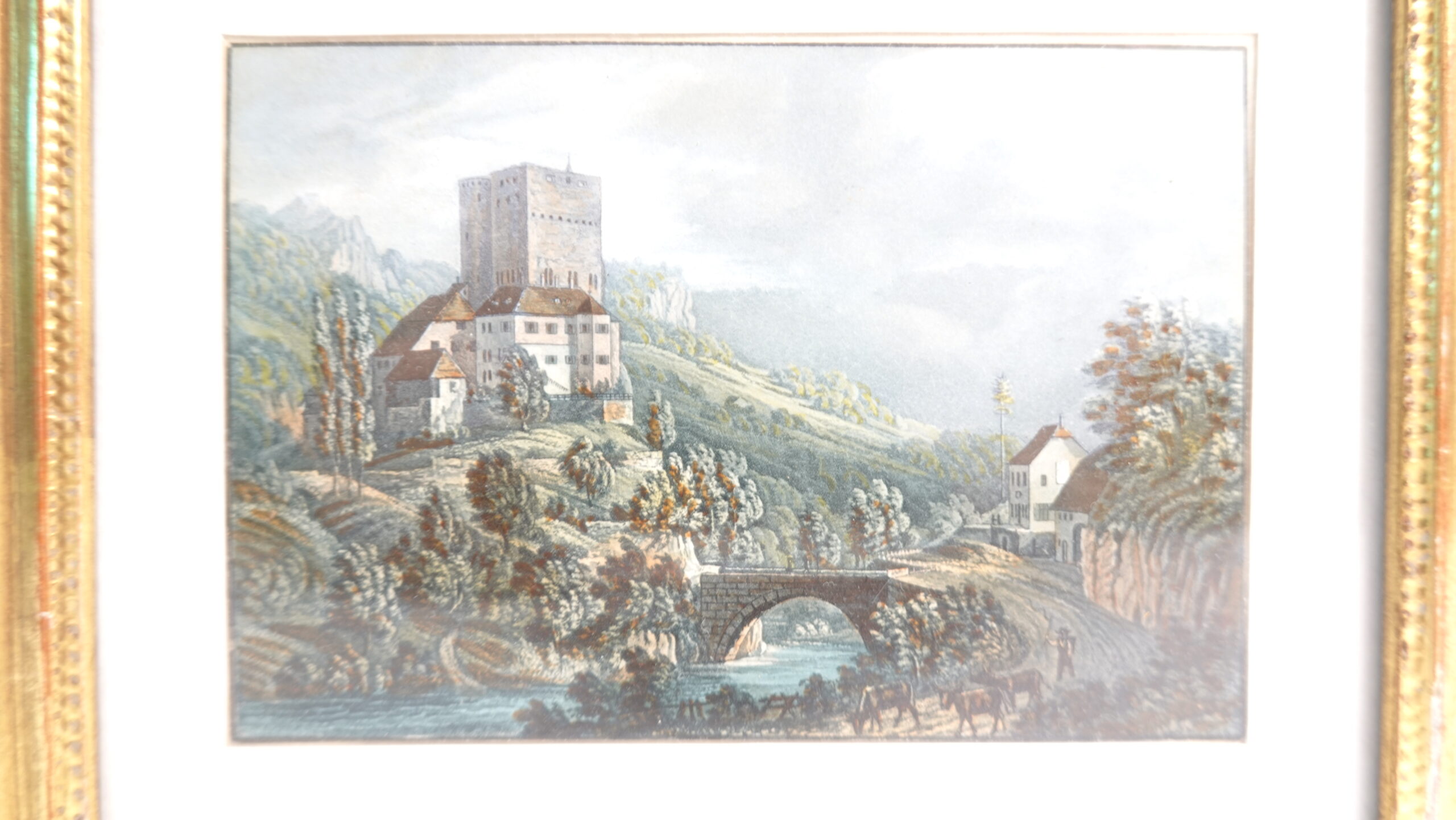 Im Mittelpunkt steht eine eindrucksvoll gelegene Burganlage, die sich über Hügel, Wälder und weitläufige Täler erhebt. Der Kupferstich vermittelt nicht nur eine präzise topografische Ansicht, sondern fängt auch die emotionale Wirkung der Landschaft ein – mit feinen Linien, zarten Schattierungen und authentisch kolorierten Elementen. Die Kombination aus meisterhafter Gravurkunst und fein abgestimmter Kolorierung macht dieses Stück zu einem echten Highlight für Sammler, Kunstliebhaber und Historieninteressierte.