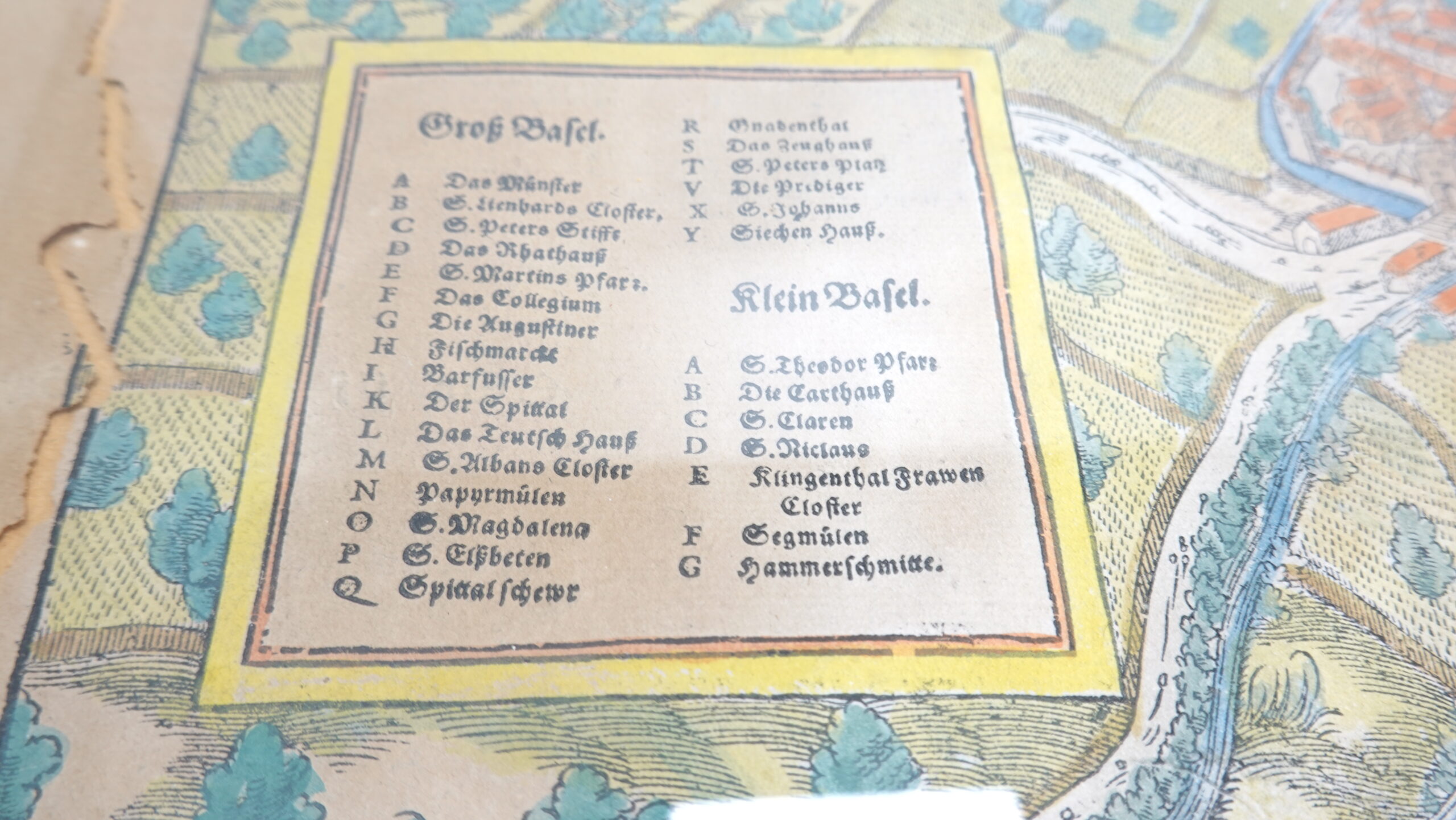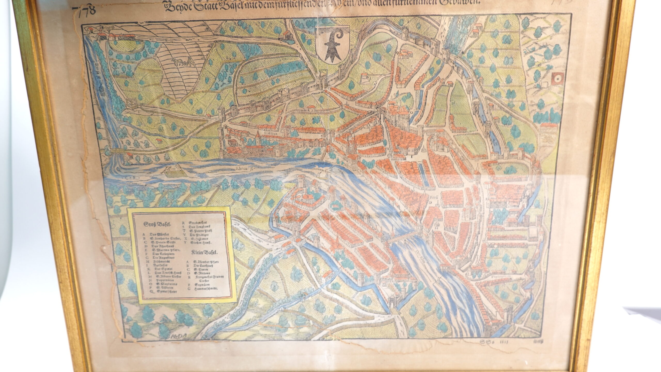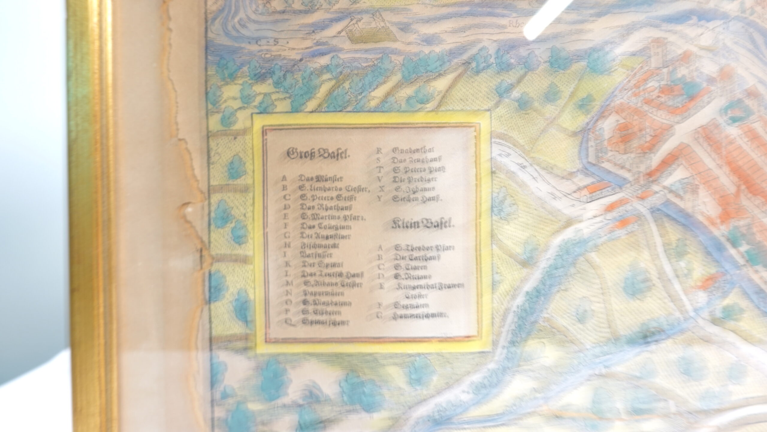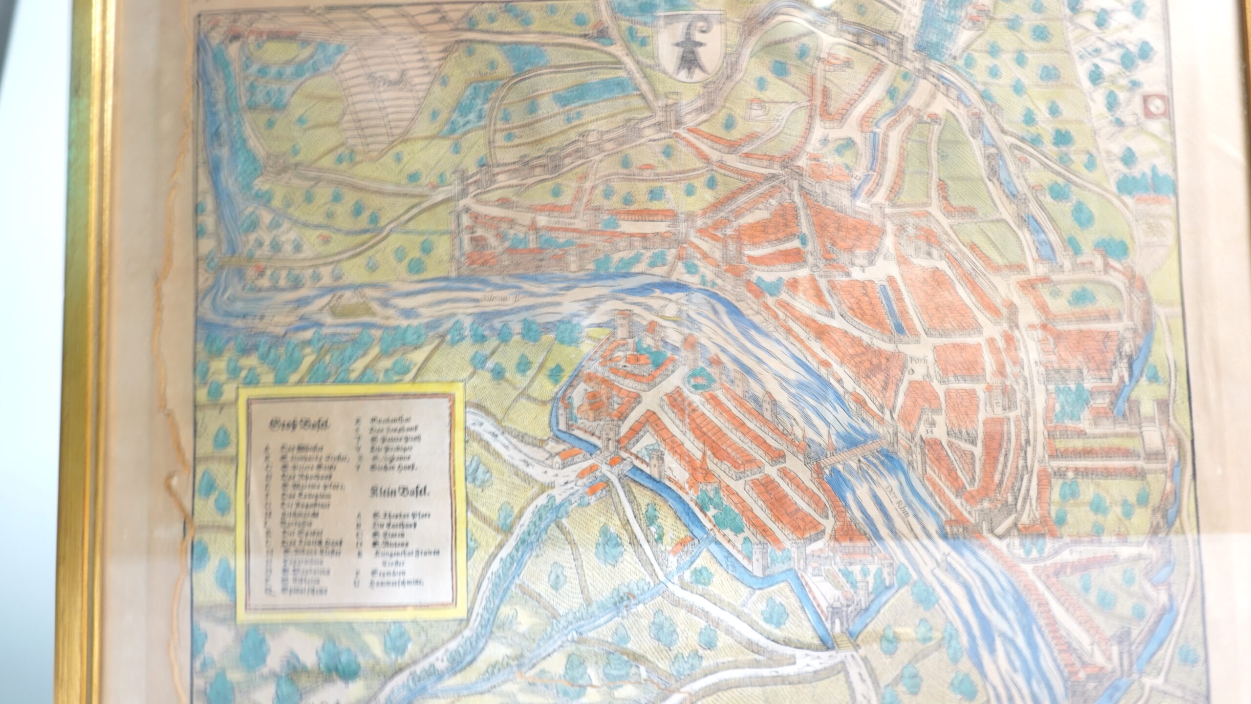Motiv: Detaillierter Stadtplan von Basel, bestehend aus „Groß Basel“ und „Klein Basel“, getrennt durch den Rhein. Darstellung mit Stadtmauern, Brücken, Türmen und zahlreichen markanten Gebäuden. Eine Legende in der linken unteren Ecke verzeichnet die wichtigsten Orte (z. B. Münster, St. Martin, Spalen-Tor).