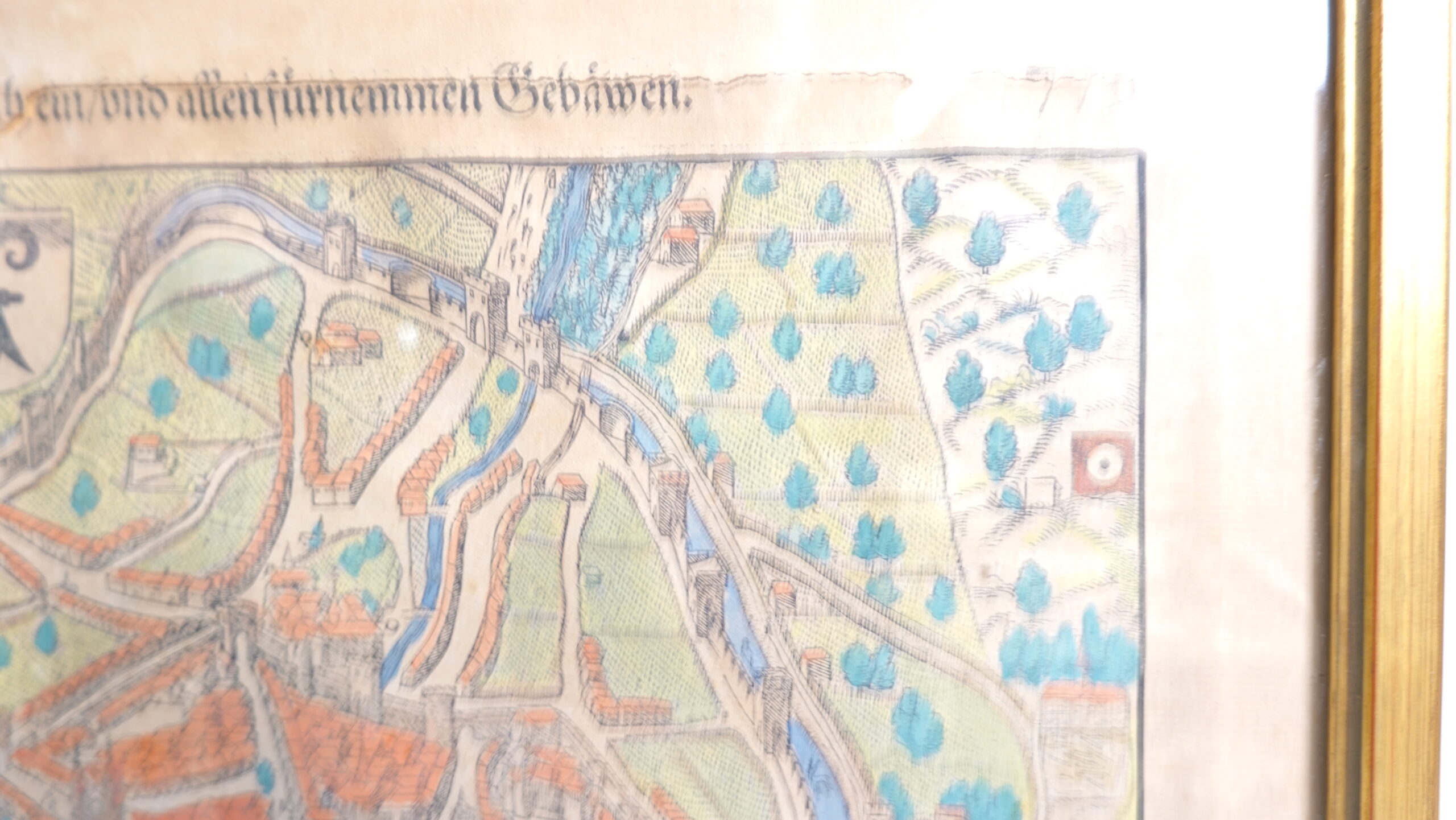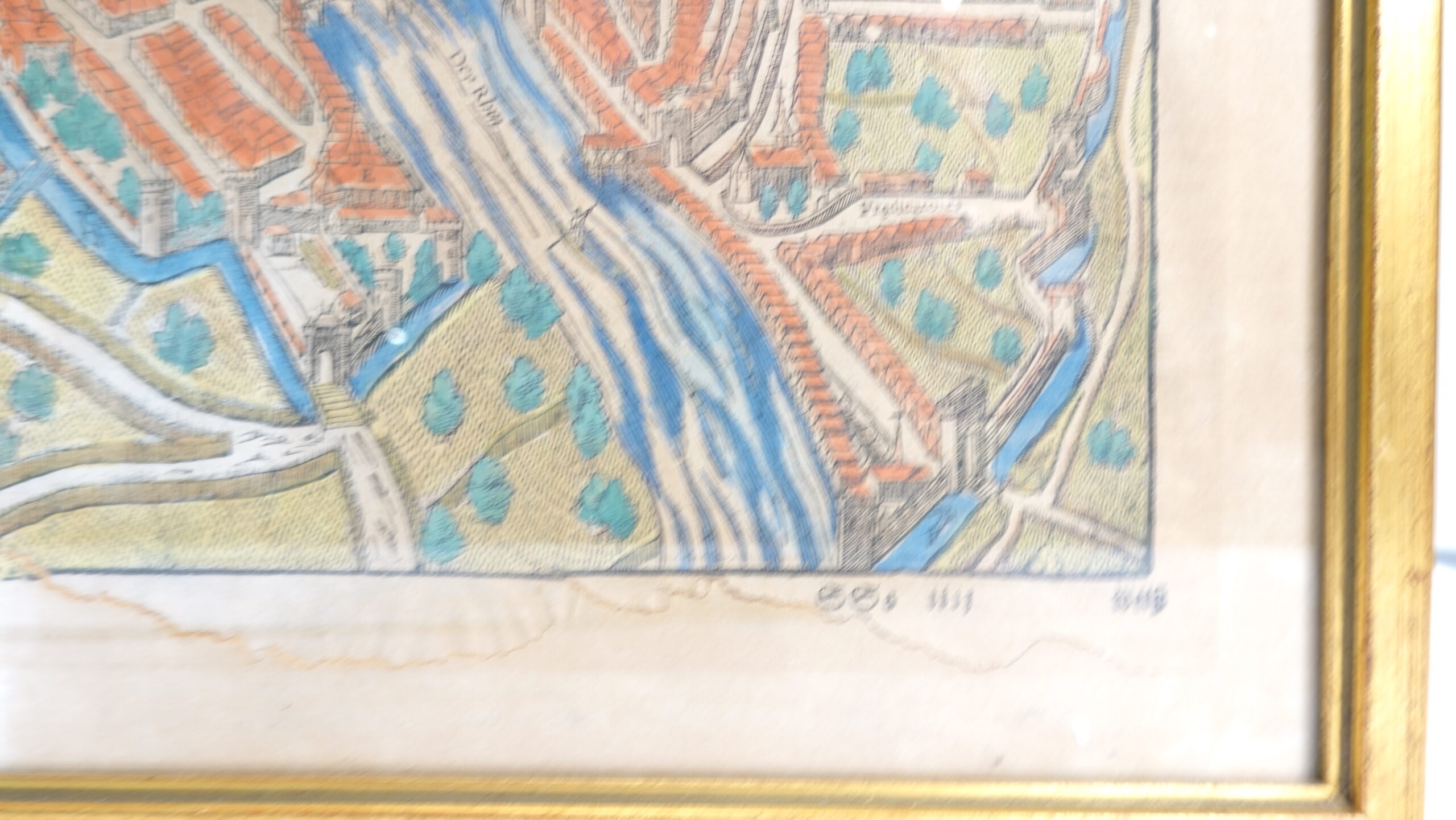 Kolorierung: Handkoloriert in Blau-, Grün- und Rottönen (besonders Dächer, Wasser und Vegetation).