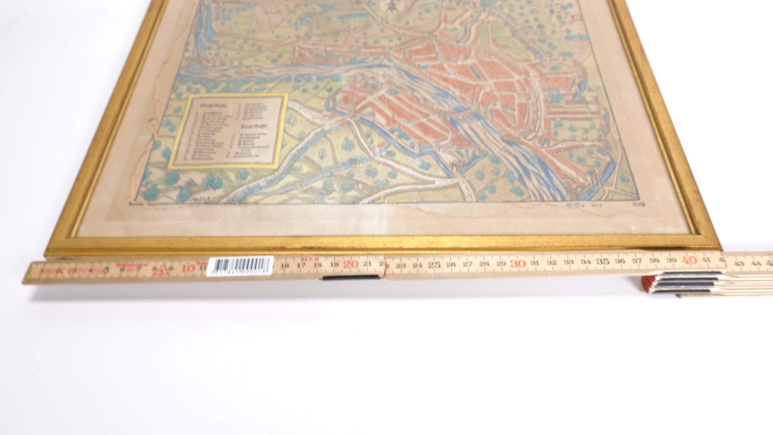 Zustand: Altersbedingte Verfärbungen, Wasserränder (insbesondere am linken Rand), kleinere Knickspuren. Insgesamt aber gut erhalten für das Alter, Farben sind noch kräftig sichtbar.