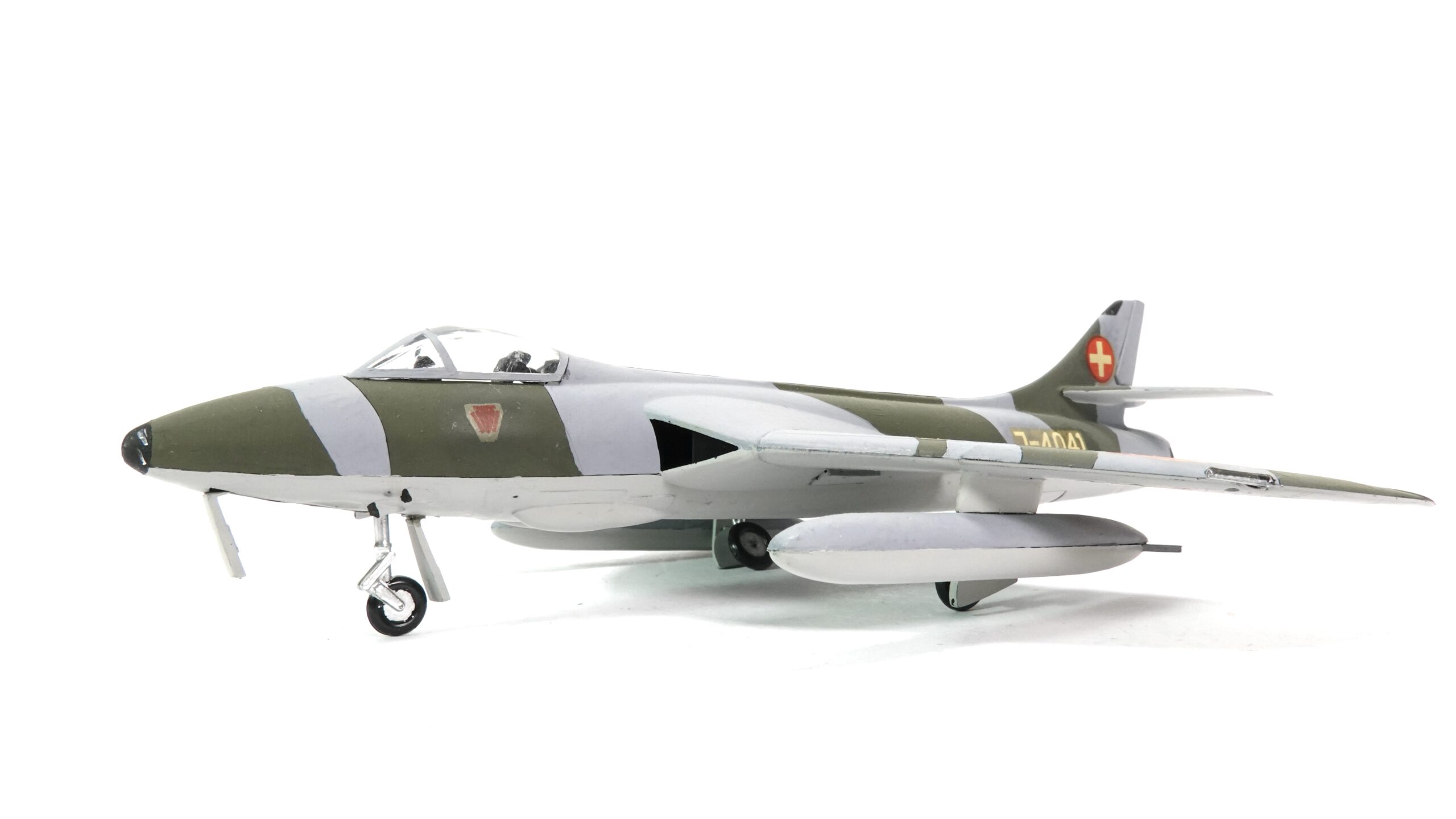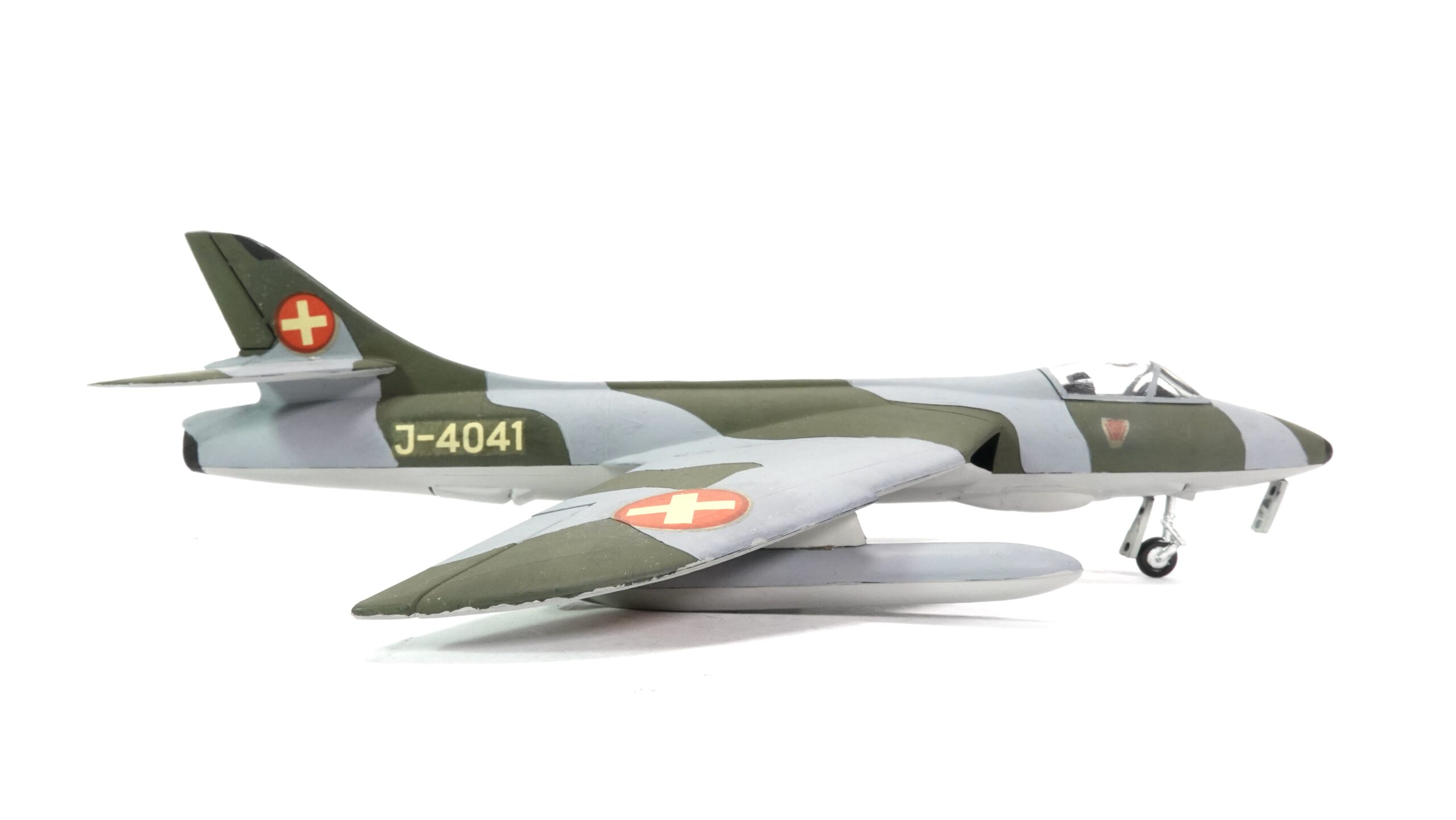 Das hier gezeigte Modell zeigt die Maschine mit der Kennung J-4041 im klassischen grünen Tarnschema mit grauen Elementen – typisch für die späten Einsatzjahre. Natürlich dürfen die rot-weißen Schweizer Hoheitszeichen auf Flügel und Leitwerk nicht fehlen – schließlich soll jeder wissen, wer hier mit Stil unterwegs ist.