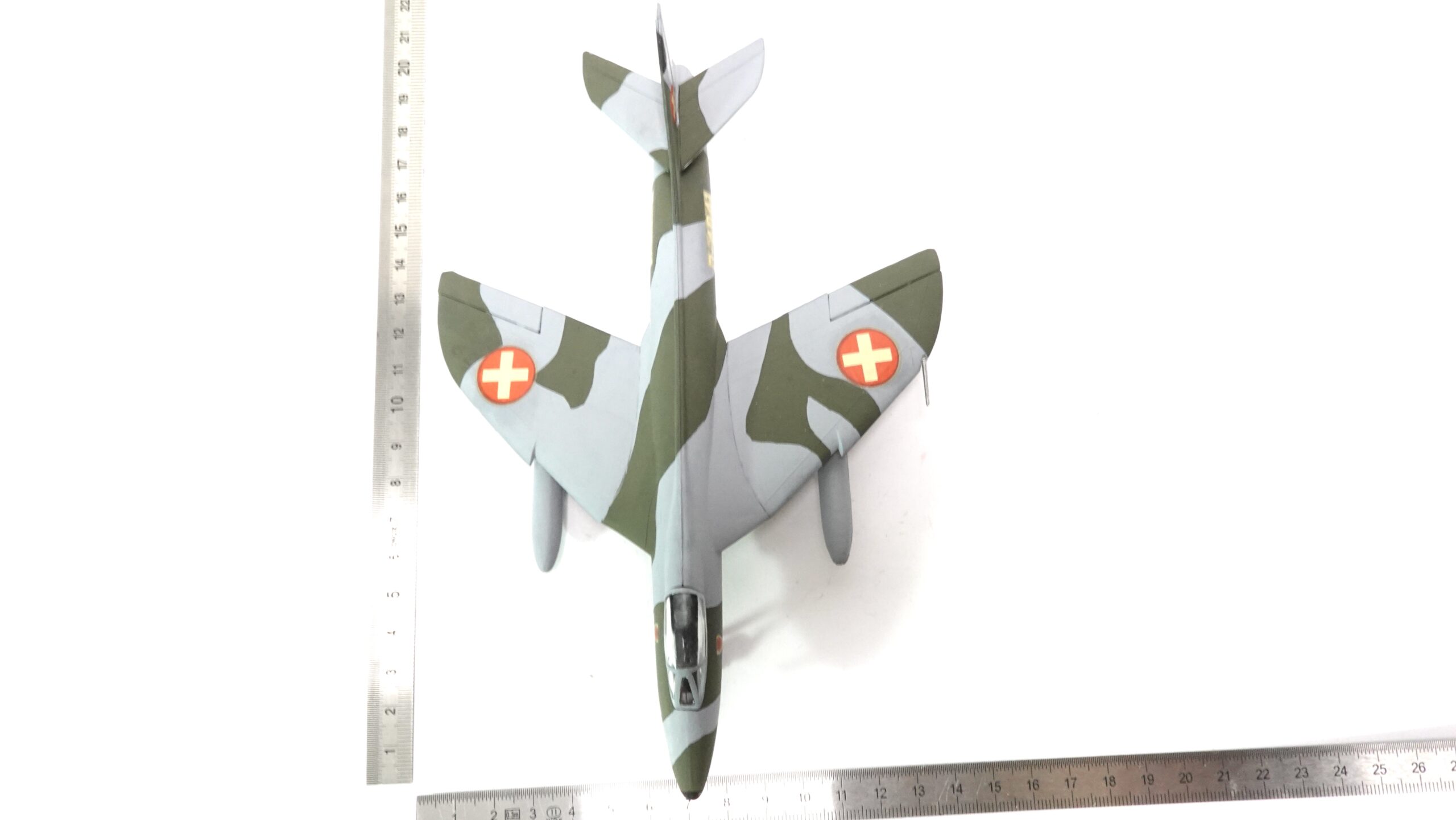 Zustand: Sehr guter Zustand – liebevoll von Hand bemalt mit authentischem Tarnschema der Schweizer Luftwaffe. Sorgfältige Handarbeit mit feinen Details wie Markierungen, Abzeichen und Zusatztanks. Ein echtes Sammlerstück mit persönlicher Note.