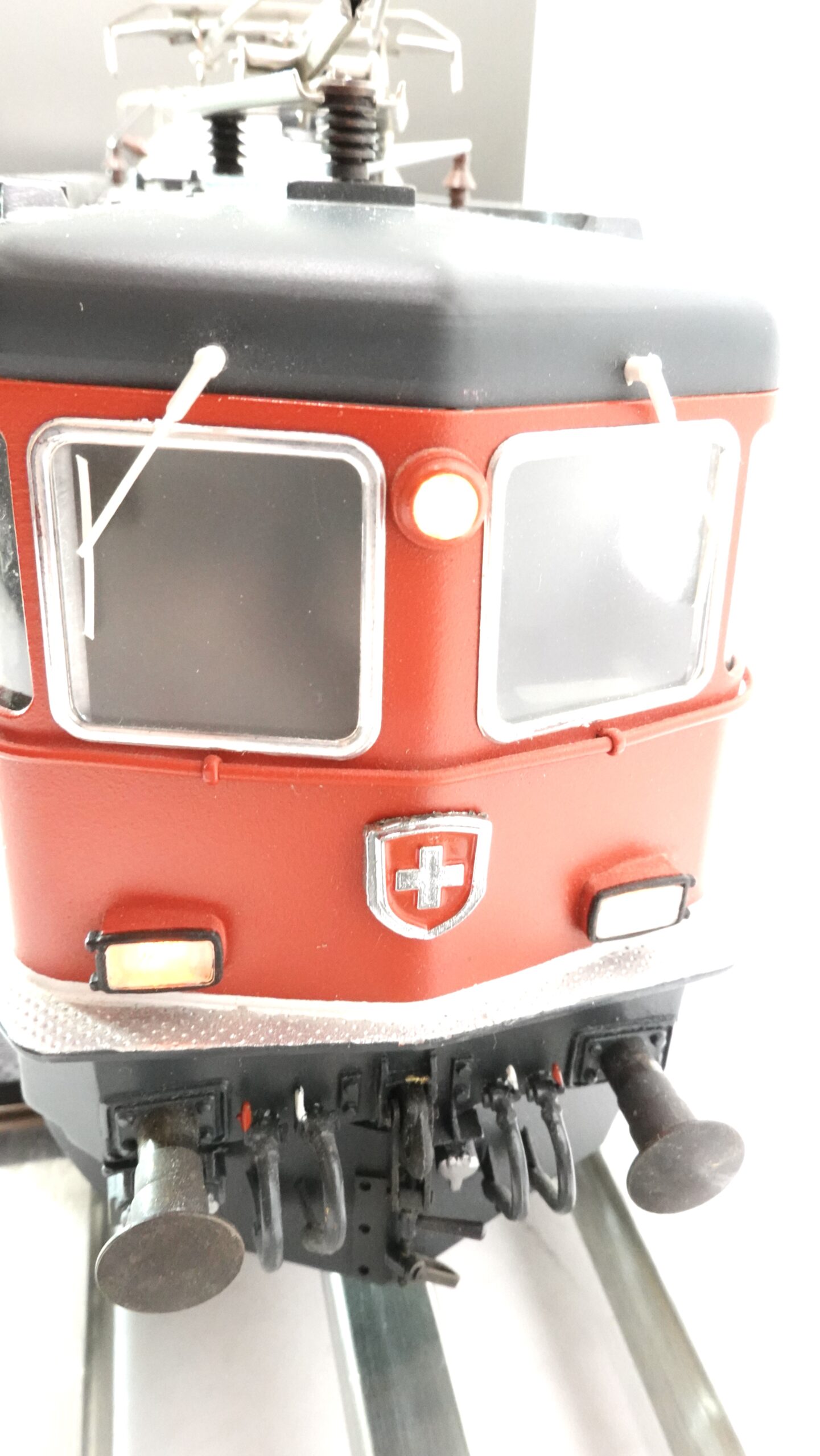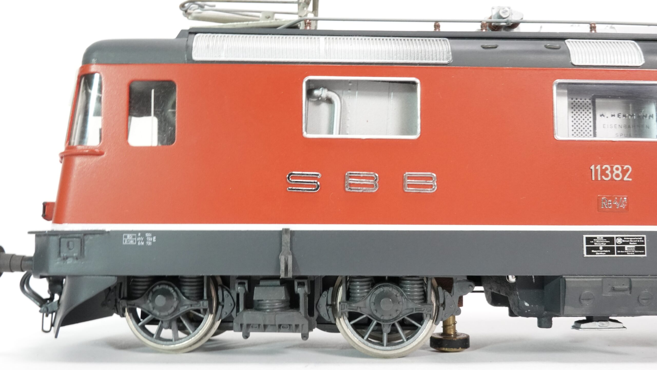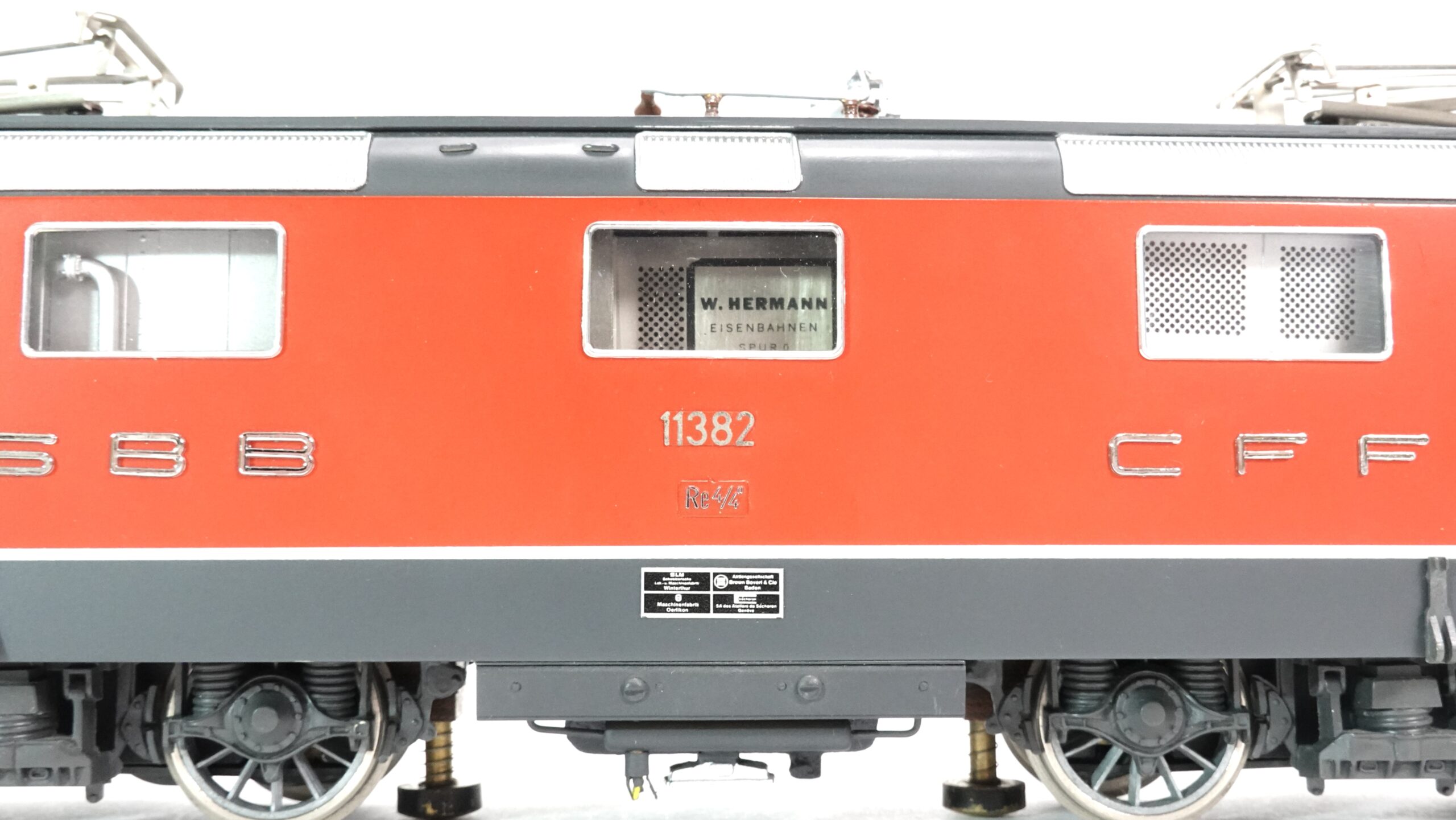Das hier gezeigte Modell stammt aus der bekannten Kleinserie von W. Hermann Eisenbahnen, die sich durch solide Bauweise, Metallkomponenten und ein hohes Maß an Vorbildtreue auszeichnen. In Spur 0 wirken die Proportionen der Re 4/4 II besonders imposant. Die feinen Gravuren, die erhabenen Schriftzüge und die markante rote Front mit Schweizer Wappen sind detailgetreu umgesetzt.
