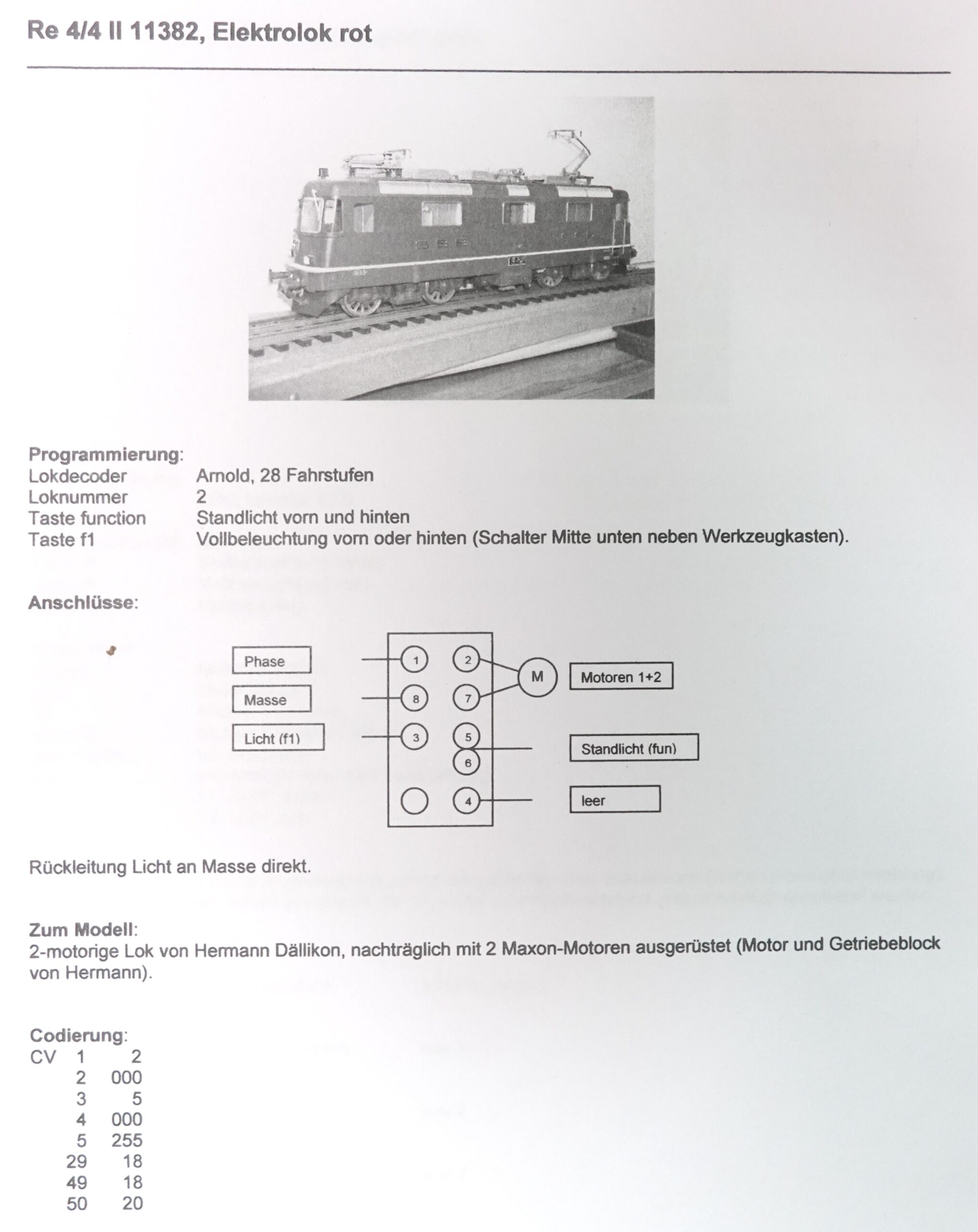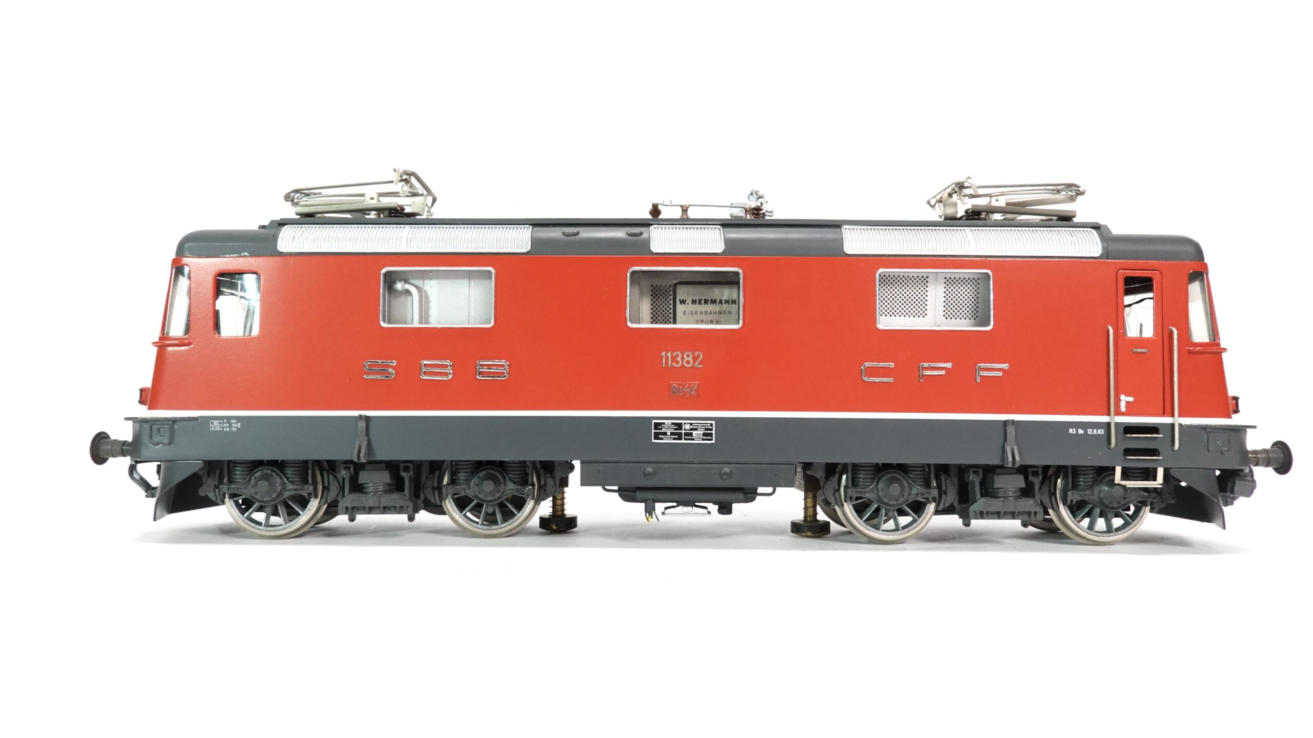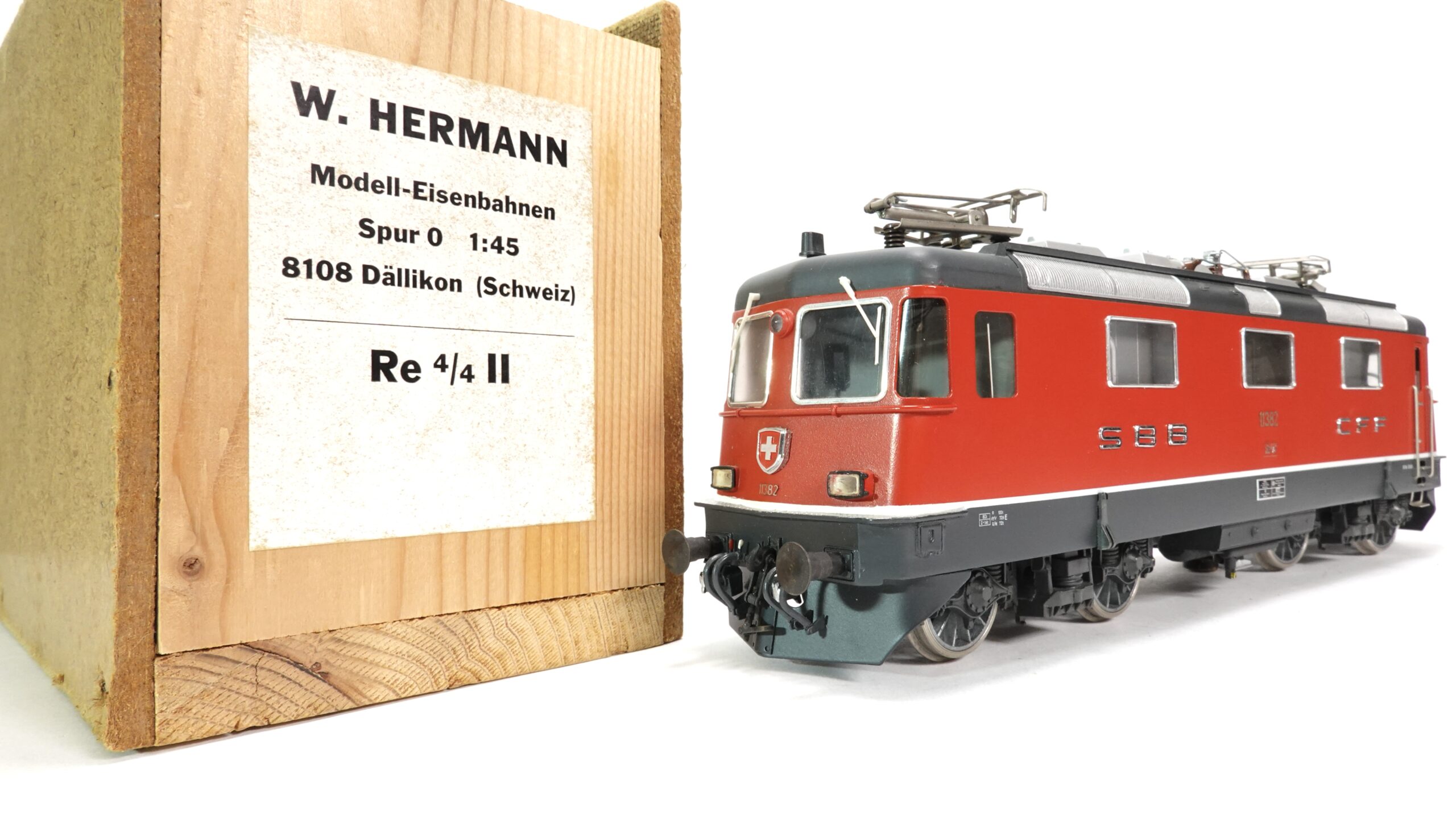 Die hier vorgestellte Lokomotive stellt eine SBB Re 4/4 II dar, genauer gesagt die Maschine 11382 der Schweizerischen Bundesbahnen (SBB). Dieses präzise gefertigte Modell stammt aus der Werkstatt von W. Hermann Eisenbahnen und ist in Spur 0 ausgeführt. Mit ihrer typischen roten Lackierung, den silbernen Anschriften SBB – CFF und den filigranen Stromabnehmern ist sie ein Blickfang in jeder Sammlung.