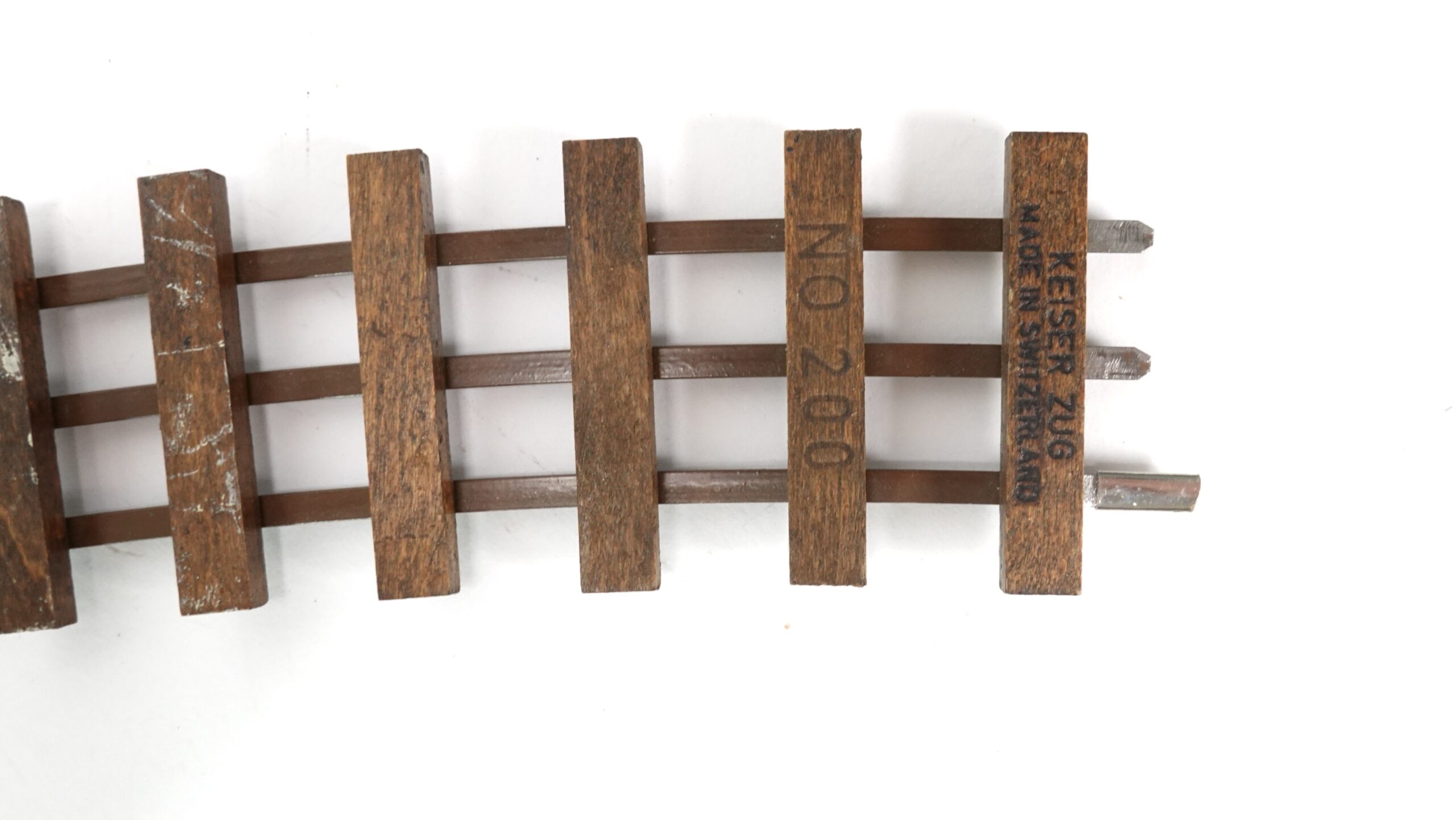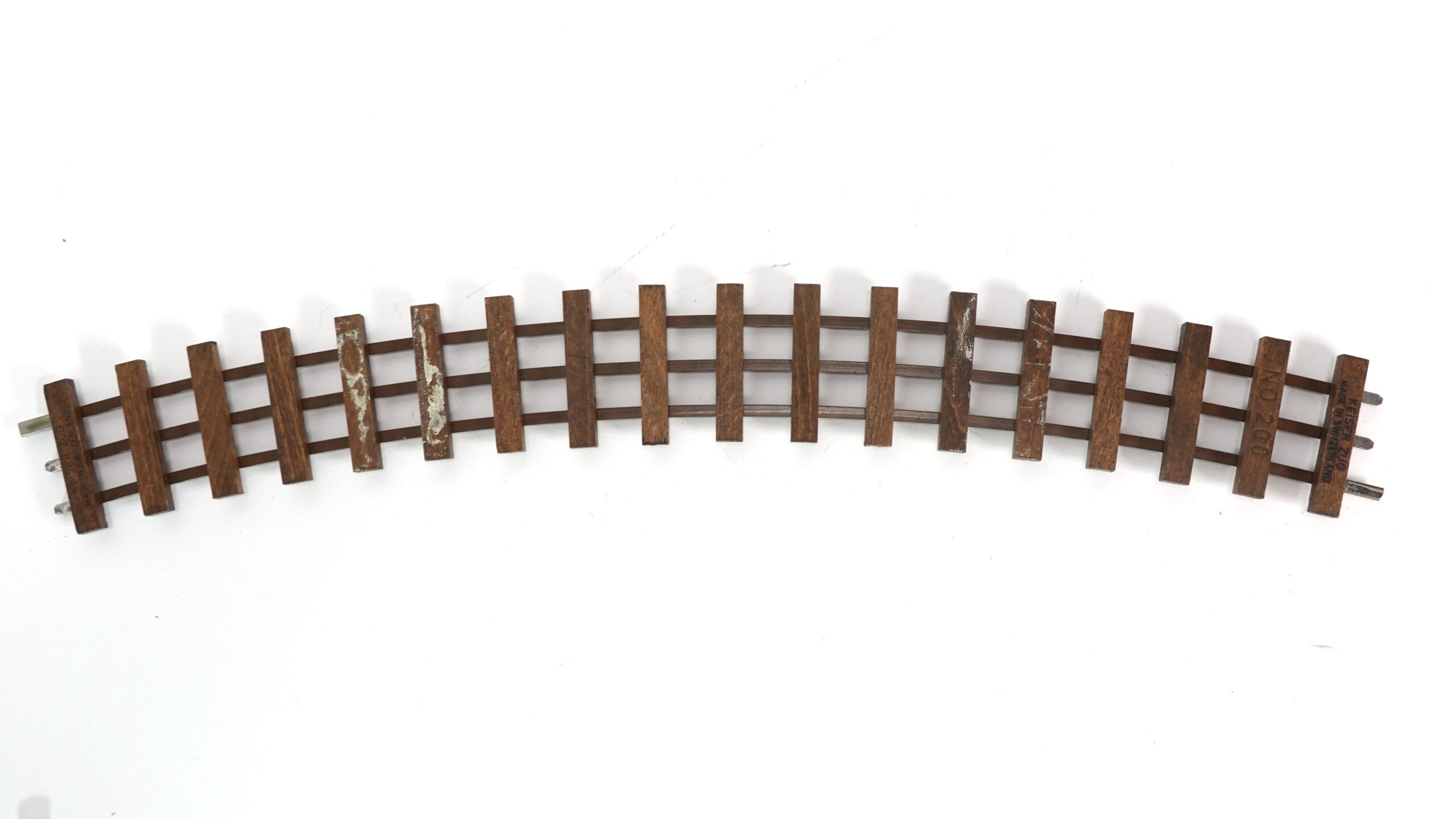 Diese klassische Modellbahnschiene stammt aus der traditionsreichen Schweizer Manufaktur Keiser Zug. Es handelt sich um ein gebogenes Gleisstück der Modellnummer 200, ausgelegt für Spur 0 und ausgestattet mit dem 3-Leiter-System.