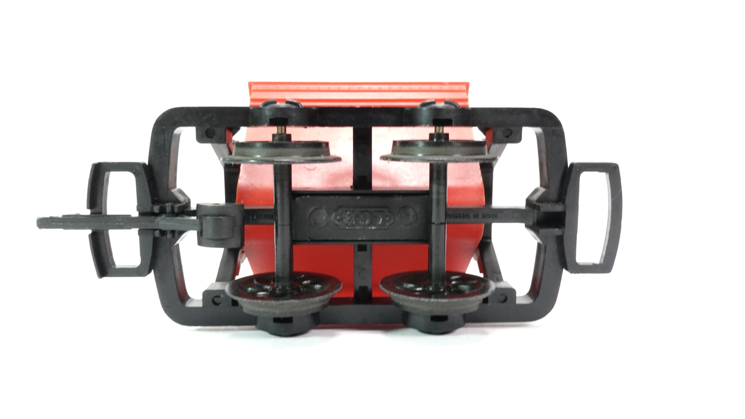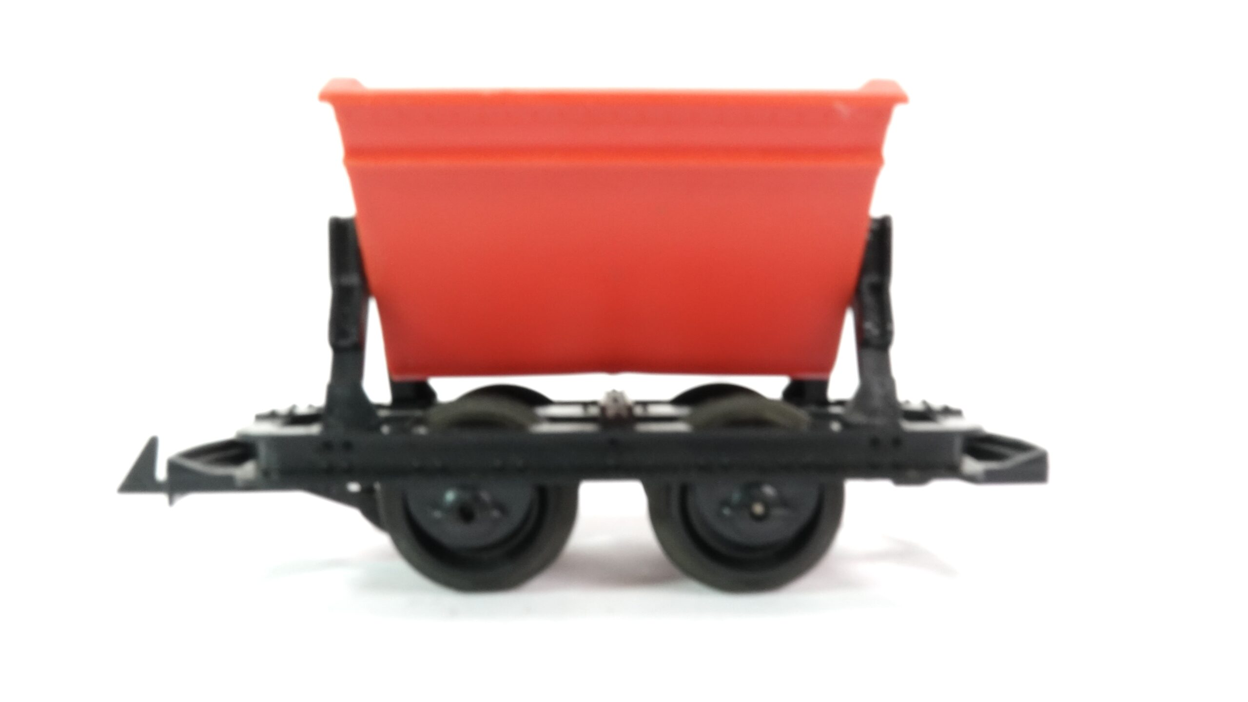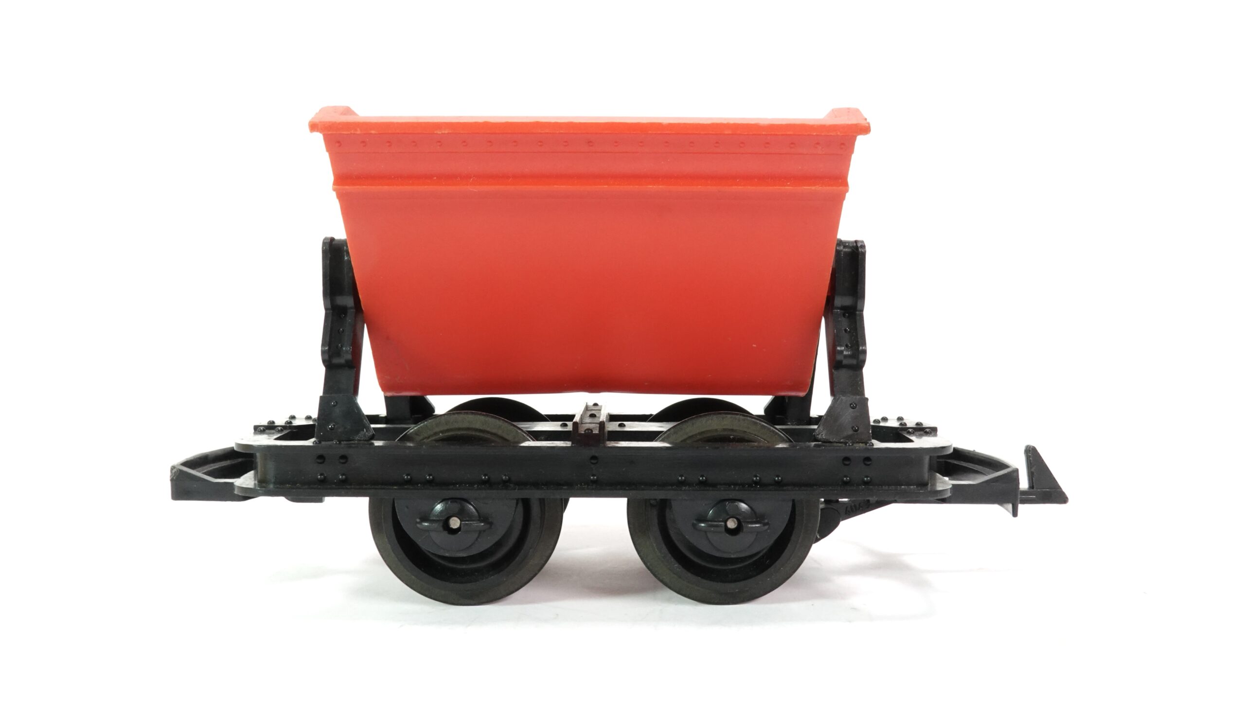 Besonders auffällig ist die leuchtend rote Lackierung, die nicht nur ein echter Hingucker auf jeder Anlage ist, sondern auch den industriellen Charakter des Wagens unterstreicht. Er wirkt, als könnte er gleich losrollen, um wertvolle Rohstoffe vom Steinbruch zur Fabrik zu transportieren. In Kombination mit weiteren Lorenwagen oder historischen Lokomotiven entsteht ein authentisches Bild kleiner Industriebahnen, wie man sie früher in Bergwerken oder Hafenanlagen sah.