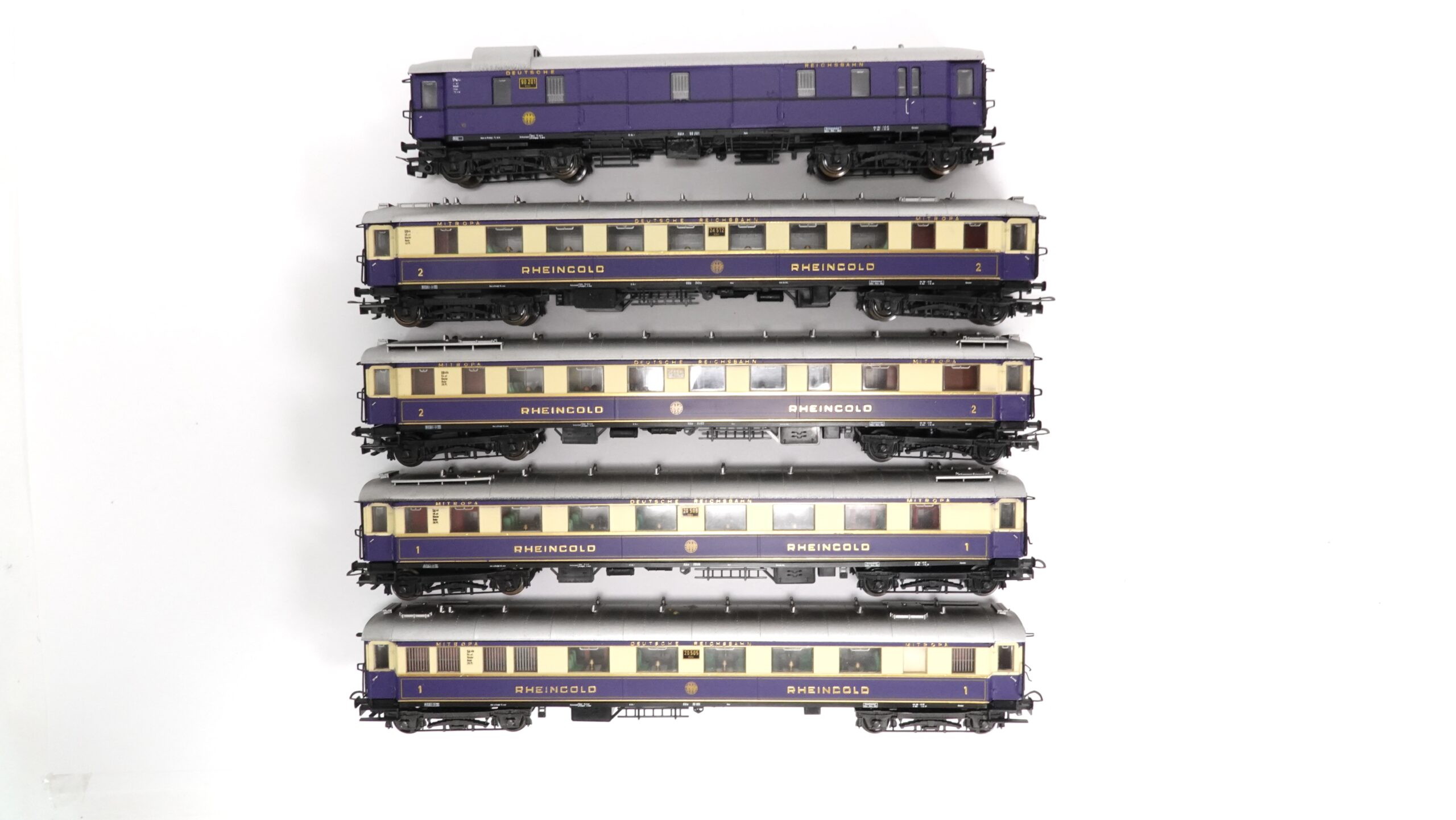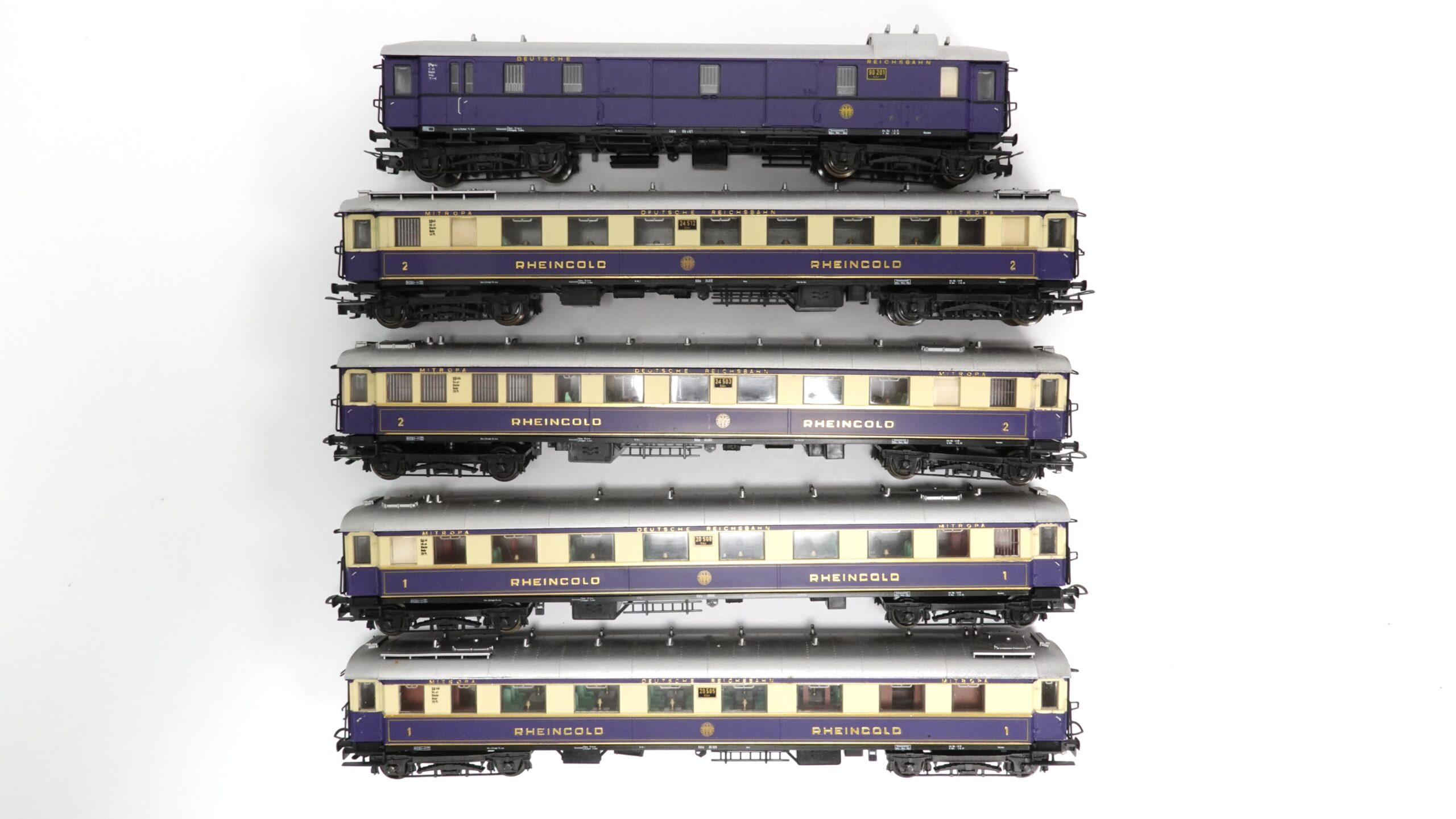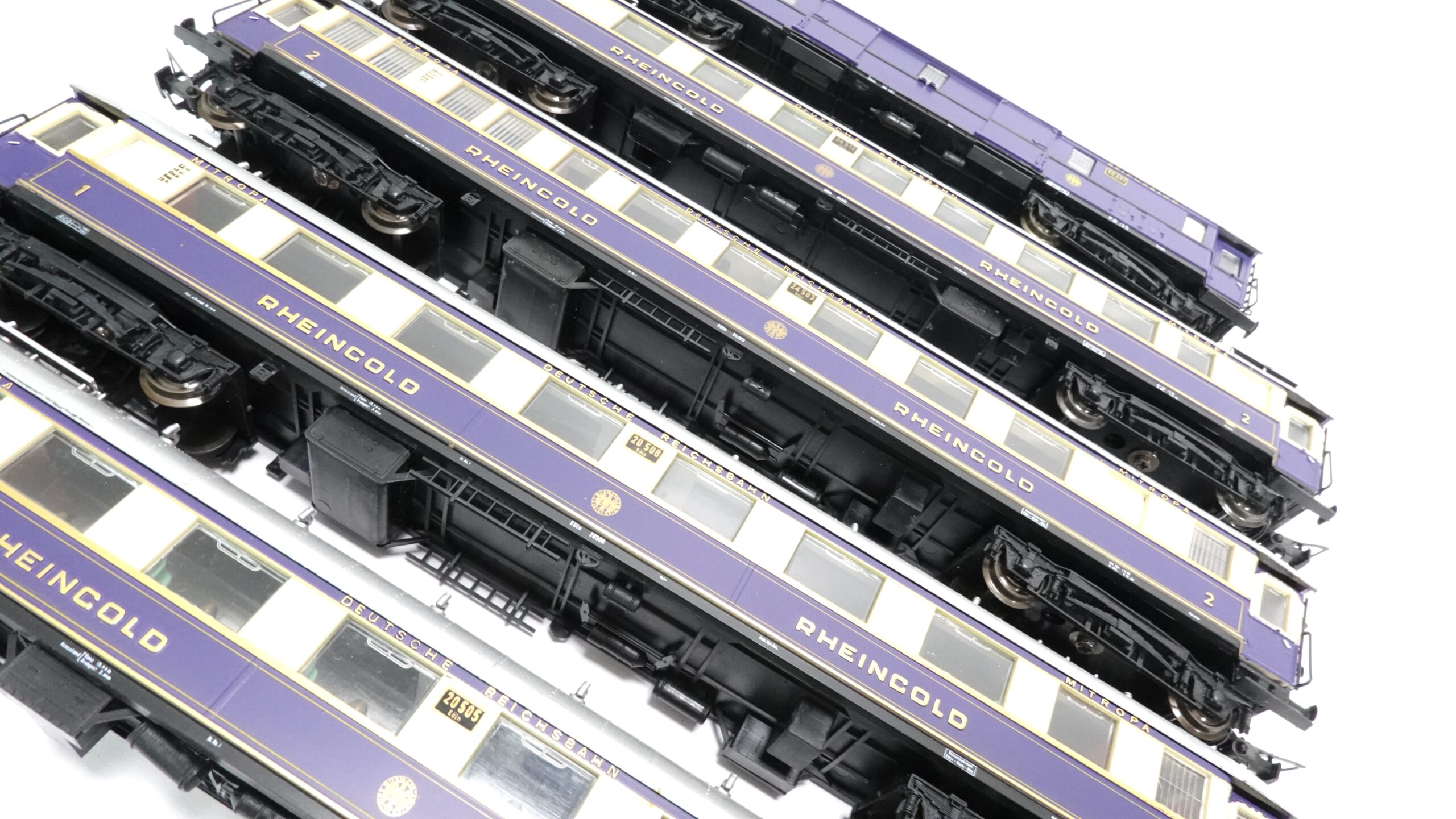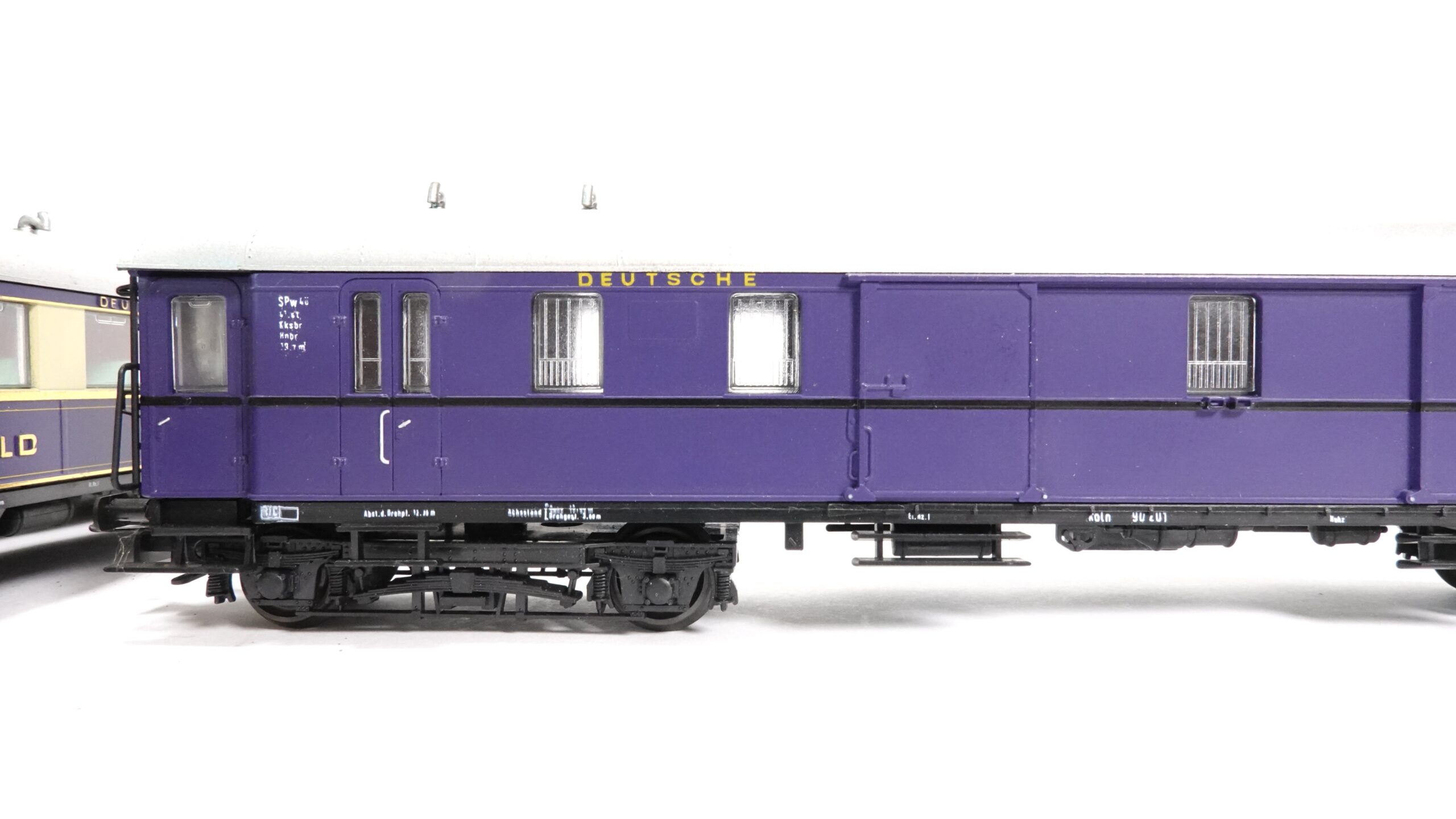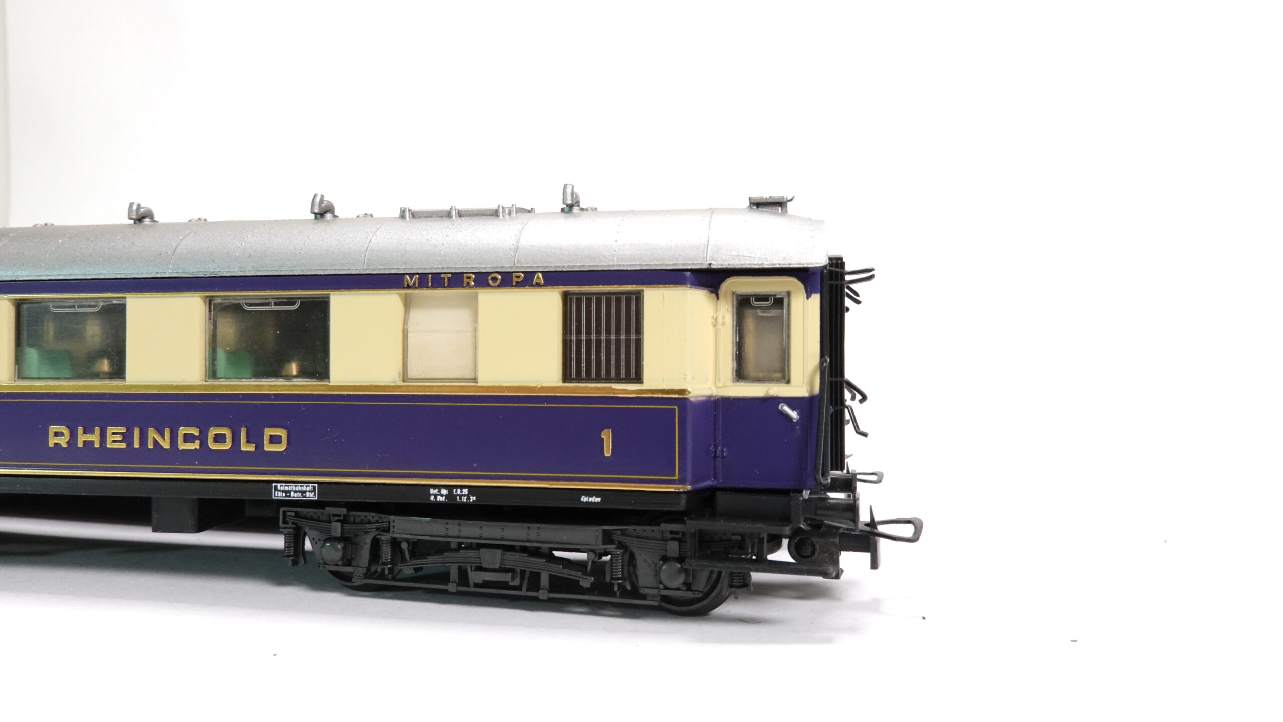 Alle Wagen sind mit normgerechten Kupplungen ausgestattet und verfügen über fein gravierte Drehgestelle, sauber aufgedruckte Wagennummern, Türbeschriftungen sowie authentische technische Daten. Die Lackierung ist seidenmatt und zeigt das charakteristische Farbschema des Rheingold-Zugs: cremefarbenes Oberteil und violetter Fensterbandbereich, verziert mit goldenen Linien und Emblemen.