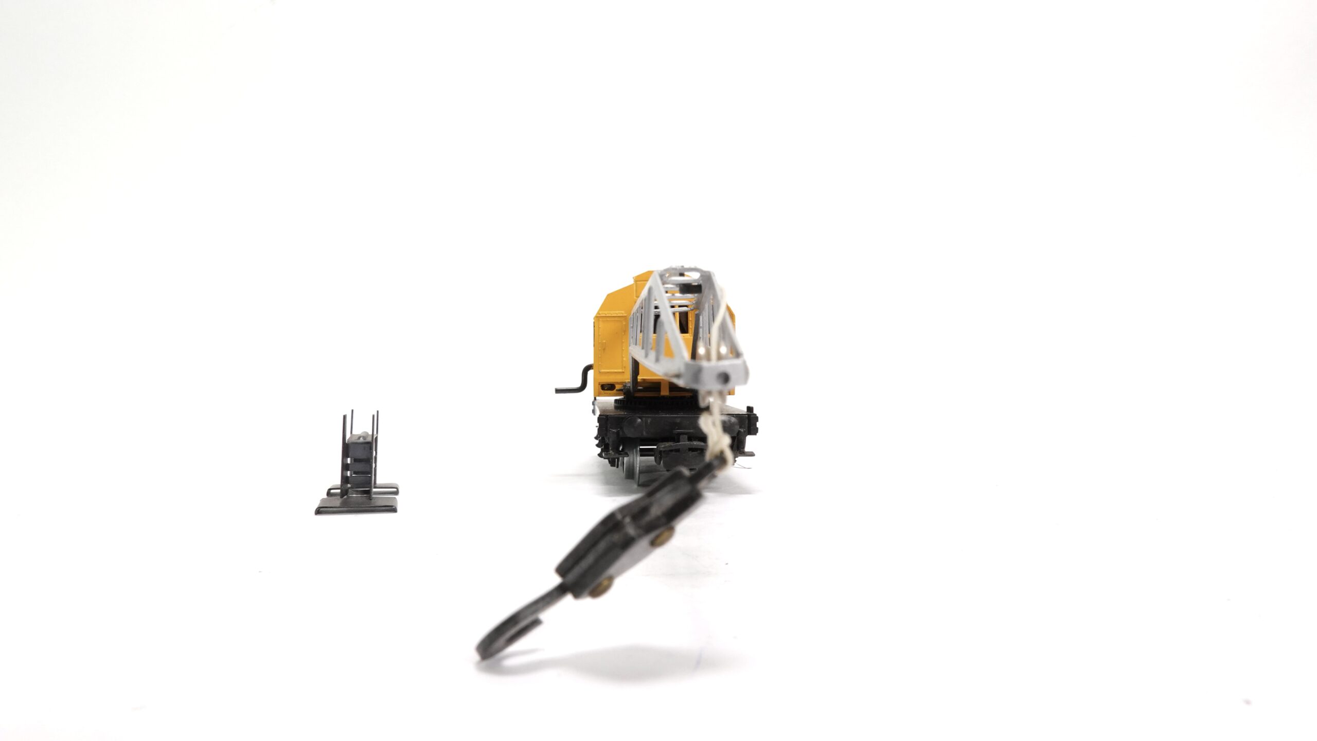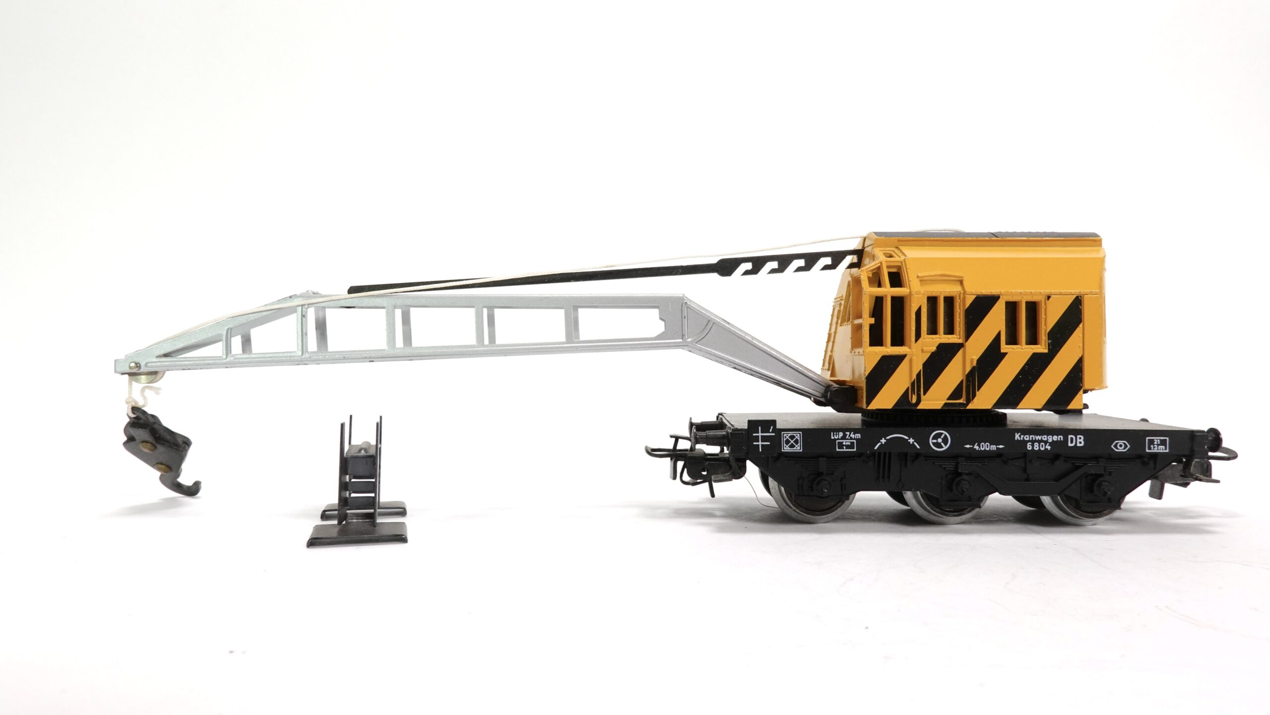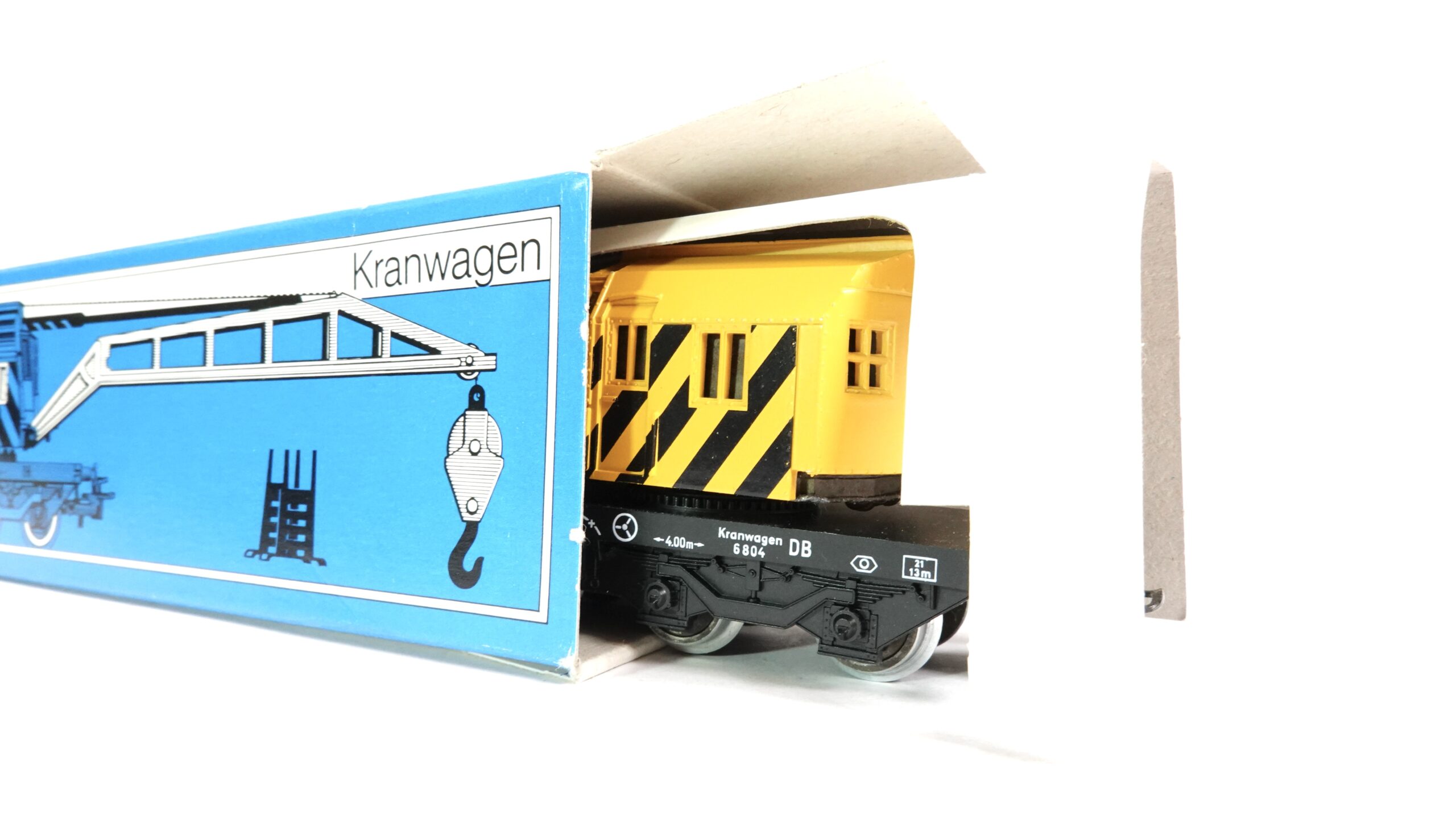 Besonders faszinierend ist die Kombination dieses Spezialwagens mit einem Arbeitstriebwagen, Werkstattwagen oder einem Hilfszug, wie sie bei der Deutschen Bundesbahn oft im Einsatz waren. Der Kranwagen wird so zum zentralen Element einer Szene voller Dynamik und Authentizität – ein echter Blickfang für jeden Modellbahnliebhaber.