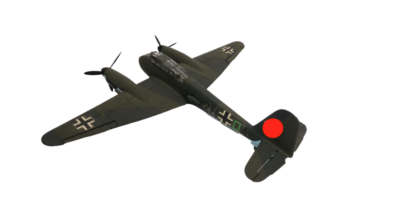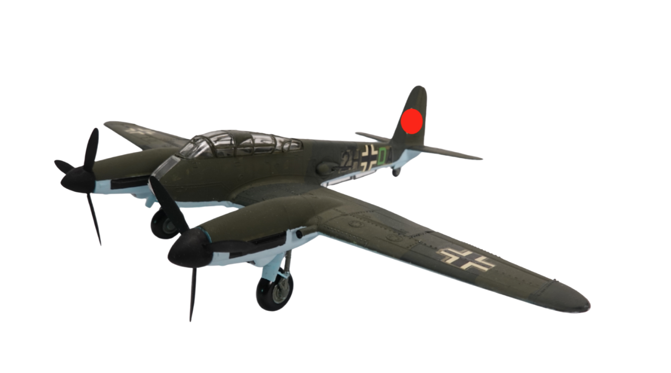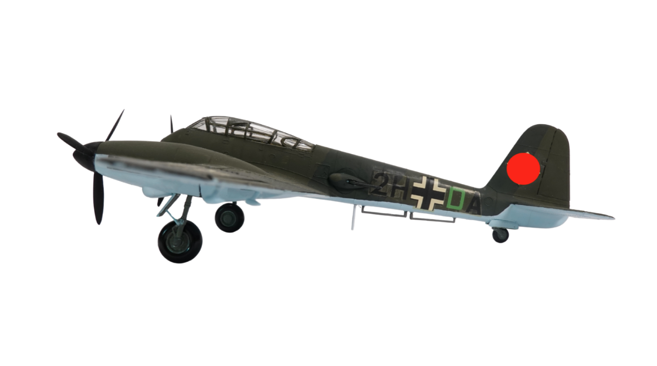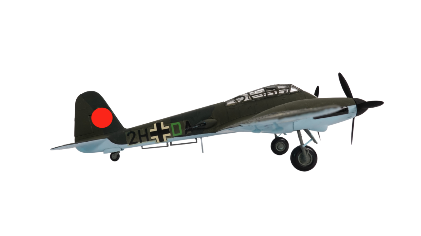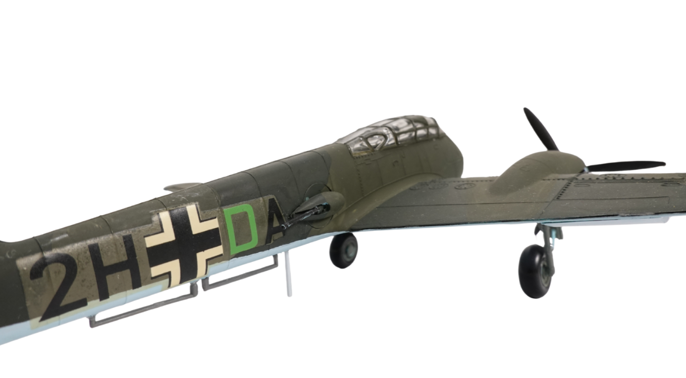 Das Modell trägt die Rumpfkennung „2H + DA“, was auf eine Maschine einer Zerstörer- oder Aufklärereinheit hindeutet. Auch die Balkenkreuze und das historisch korrekte Leitwerkssymbol sind angebracht. Trotz seines historischen Kontextes dient dieses Modell rein der dokumentarischen Darstellung luftfahrttechnischer Entwicklungen.