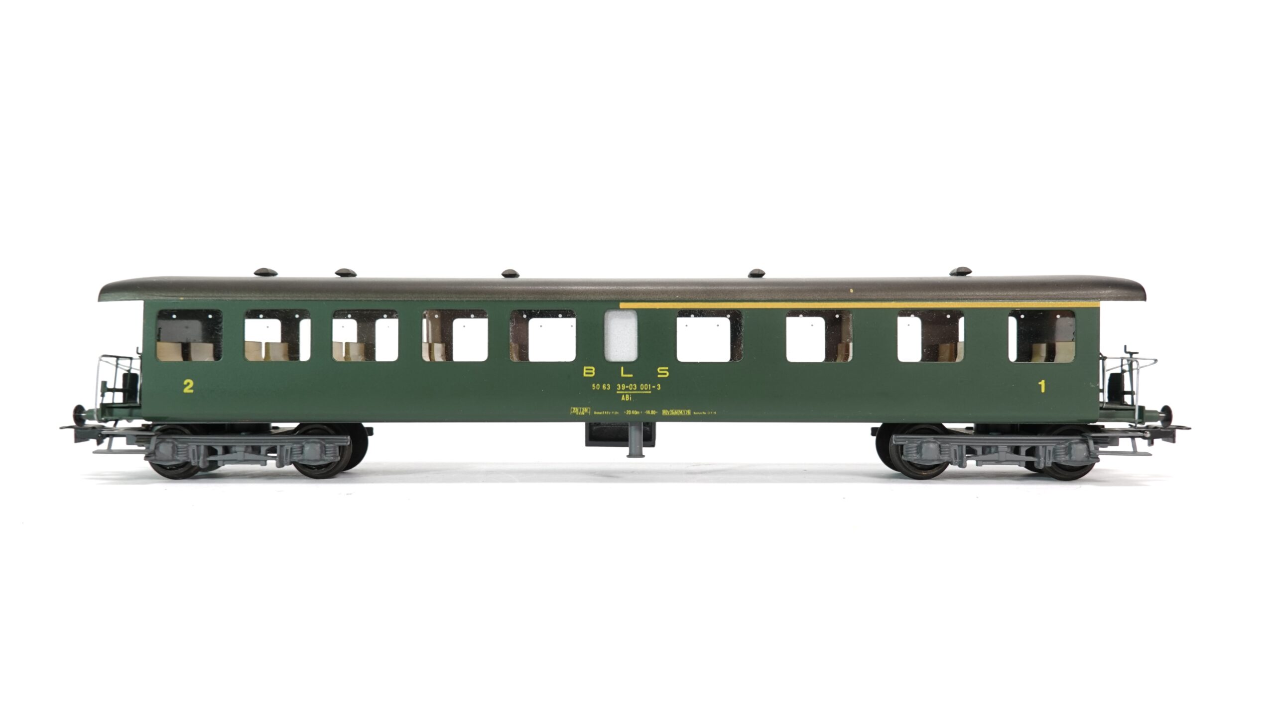 Das Modell stellt einen ABi-Wagen dar, also einen kombinierten 1. und 2. Klasse-Wagen, wie er im Regional- und Fernverkehr eingesetzt wurde. Aufgedruckt sind die Wagennummer „50 63 39-03 001-3“ und die Klassenkennzeichnungen „1“ und „2“ an den jeweiligen Wagenenden. Die Fenster sind klar und erlauben einen Einblick in die fein gestaltete Inneneinrichtung – mit verschiedenen Sitzgruppen, passend zur jeweiligen Klasse. So ist in der ersten Klasse beispielsweise eine etwas großzügigere Bestuhlung erkennbar.