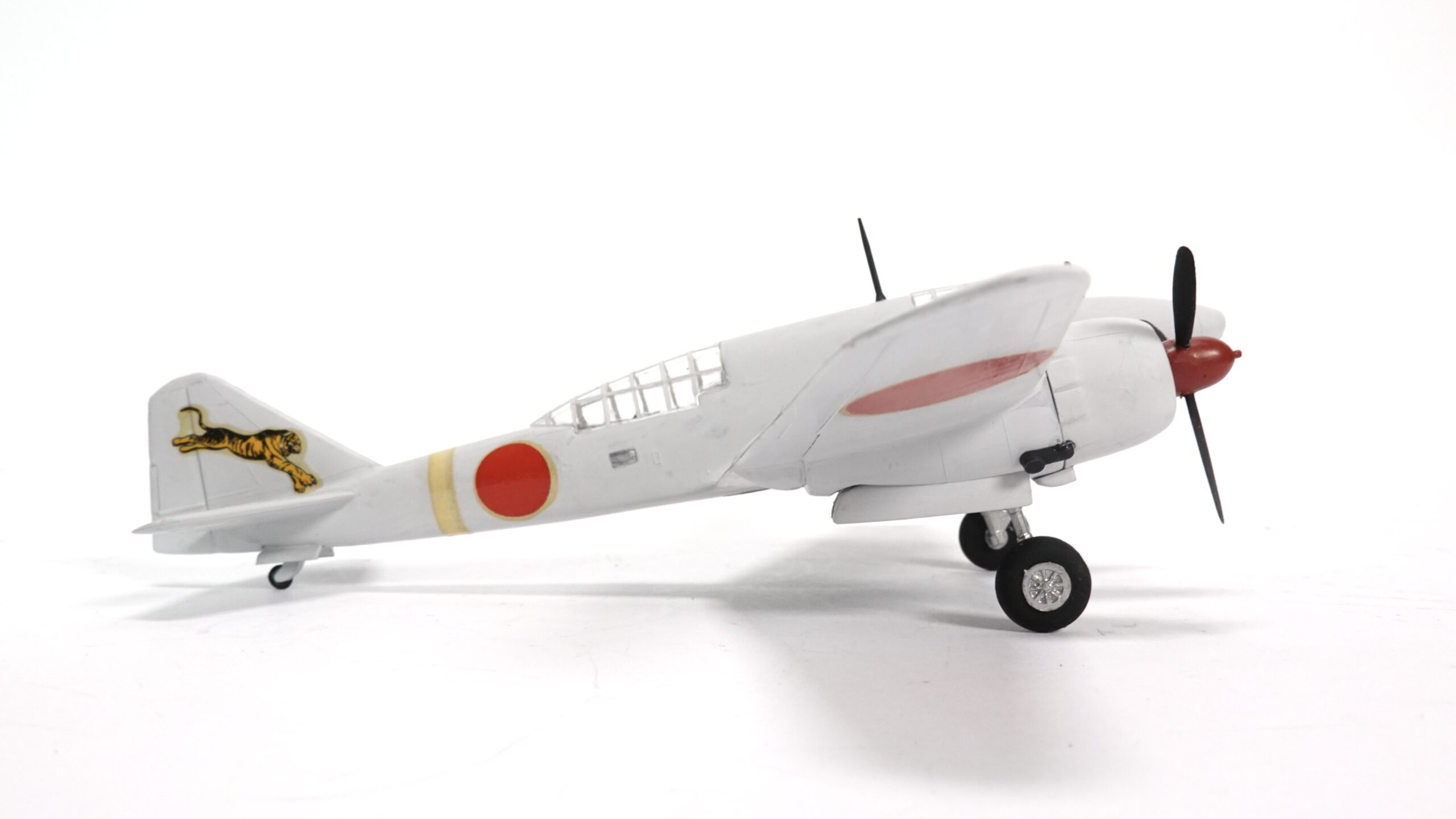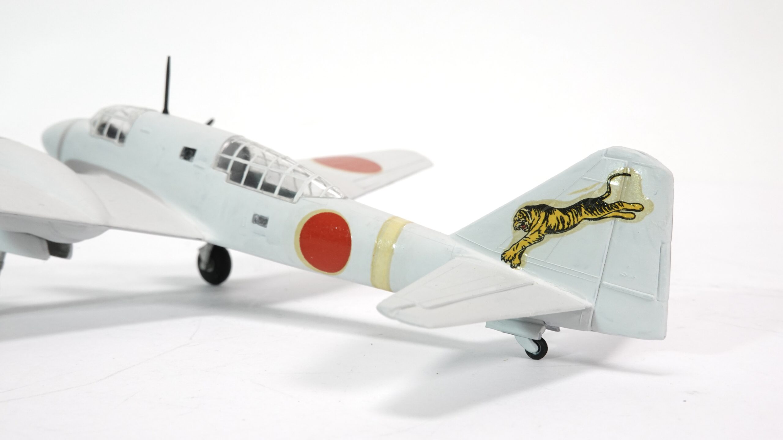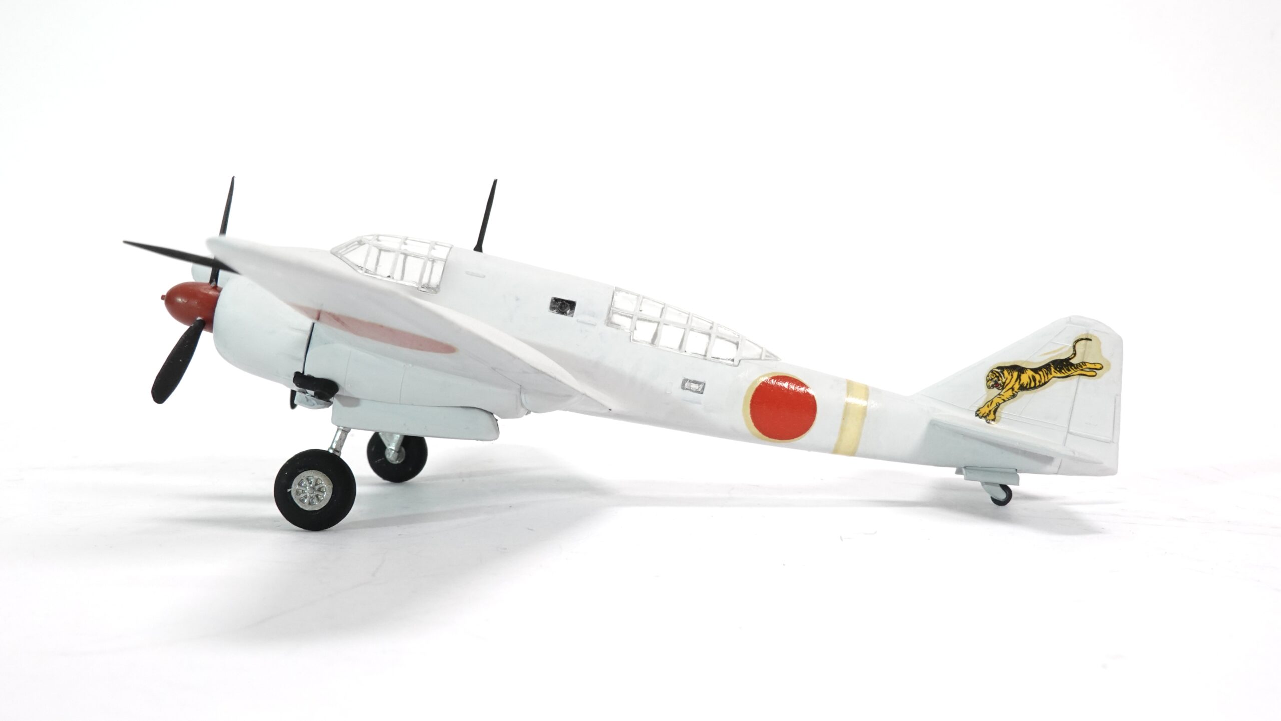 Das hier gezeigte Modell präsentiert die Ki-46 in einer markanten Bemalung mit winterlicher Tarnwirkung in Weiß, kombiniert mit den roten Hoheitszeichen (Hinomaru) und einem auffälligen Tiger-Emblem am Heckleitwerk. Letzteres verweist auf eine Einheit, die für ihre Aggressivität und Präzision bekannt war. Die Darstellung vermittelt authentisch den Charakter der Maschine, wie sie in kälteren Einsatzgebieten – etwa in Nordchina oder Mandschurei – geflogen sein könnte.