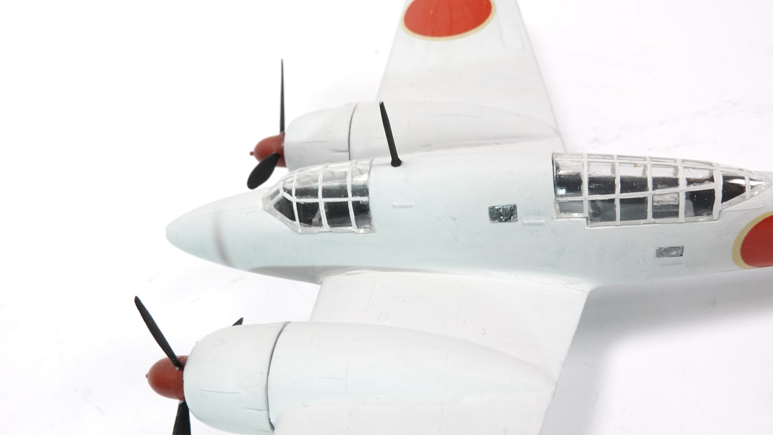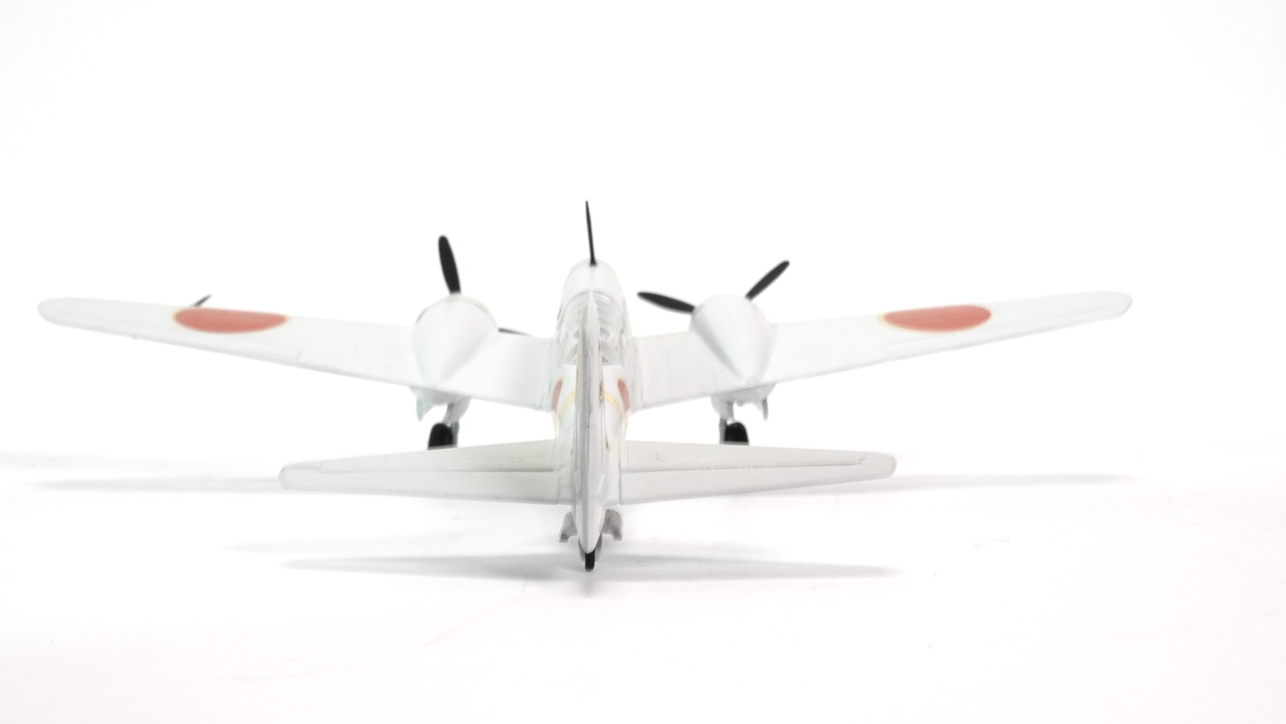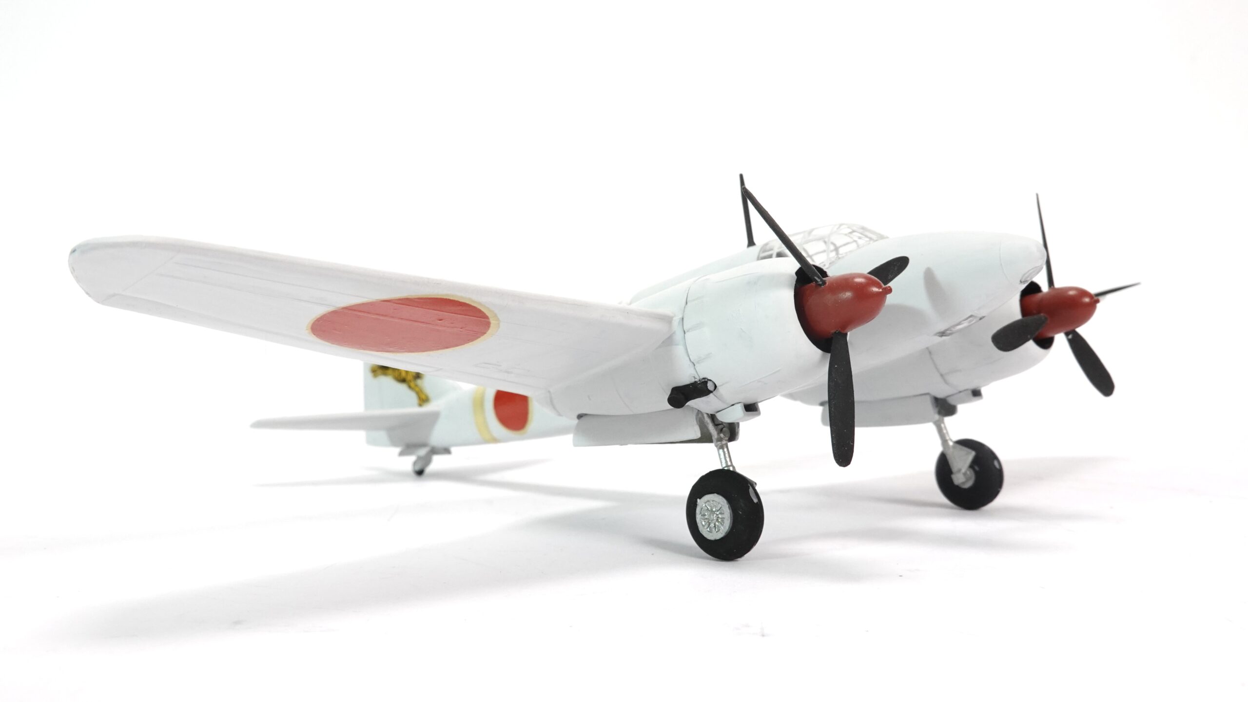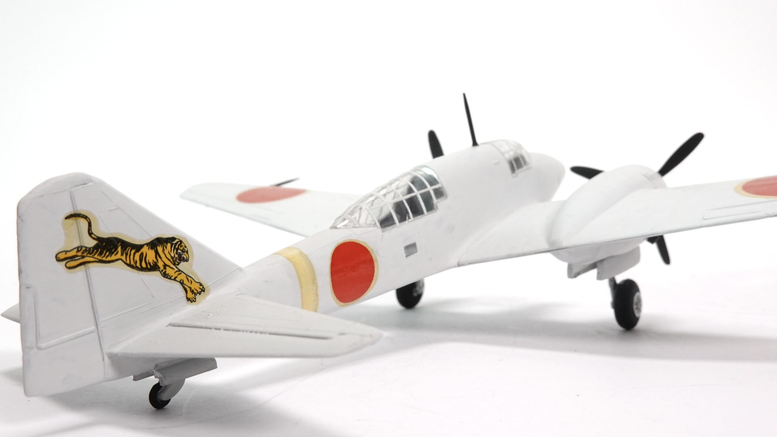 Das hier gezeigte Modell präsentiert die Ki-46 in einer markanten Bemalung mit winterlicher Tarnwirkung in Weiß, kombiniert mit den roten Hoheitszeichen (Hinomaru) und einem auffälligen Tiger-Emblem am Heckleitwerk. Letzteres verweist auf eine Einheit, die für ihre Aggressivität und Präzision bekannt war. Die Darstellung vermittelt authentisch den Charakter der Maschine, wie sie in kälteren Einsatzgebieten – etwa in Nordchina oder Mandschurei – geflogen sein könnte.