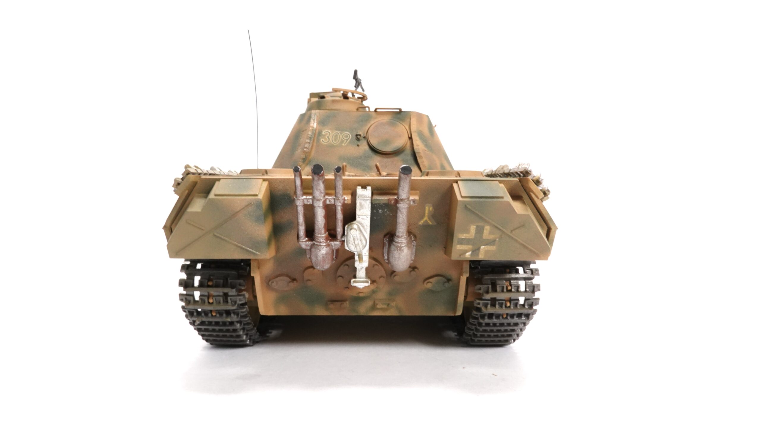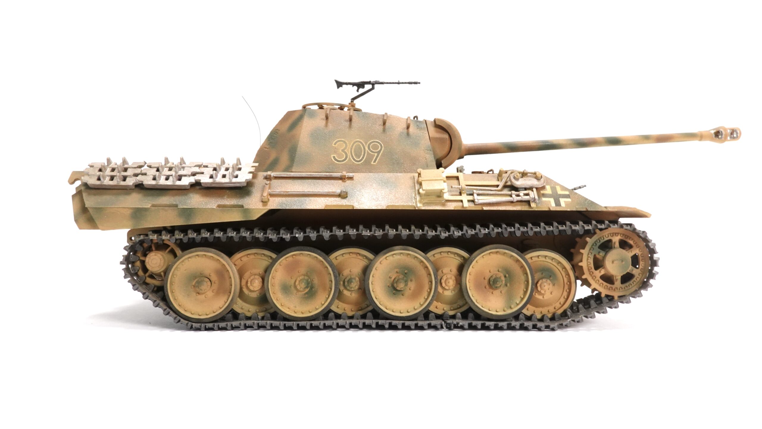 Dieses detailreiche Modell im Maßstab 1:35 zeigt den Panther Ausf. G mit der taktischen Nummer 309. Es wurde fachmännisch montiert und in liebevoller Handarbeit bemalt. Die realistische Tarnlackierung in typischer Drei-Farben-Tarnung (Dunkelgelb, Olivgrün und Rotbraun) wurde mit großer Sorgfalt umgesetzt und verleiht dem Modell ein authentisches Erscheinungsbild.