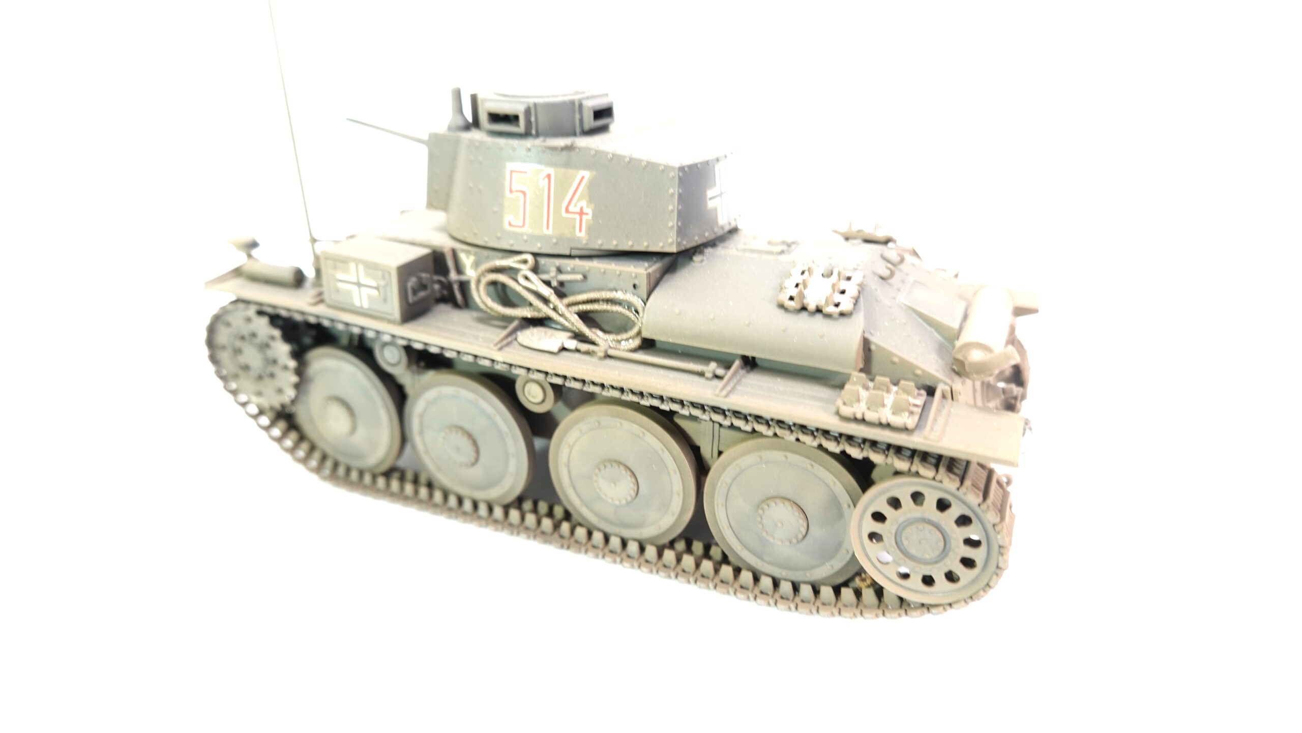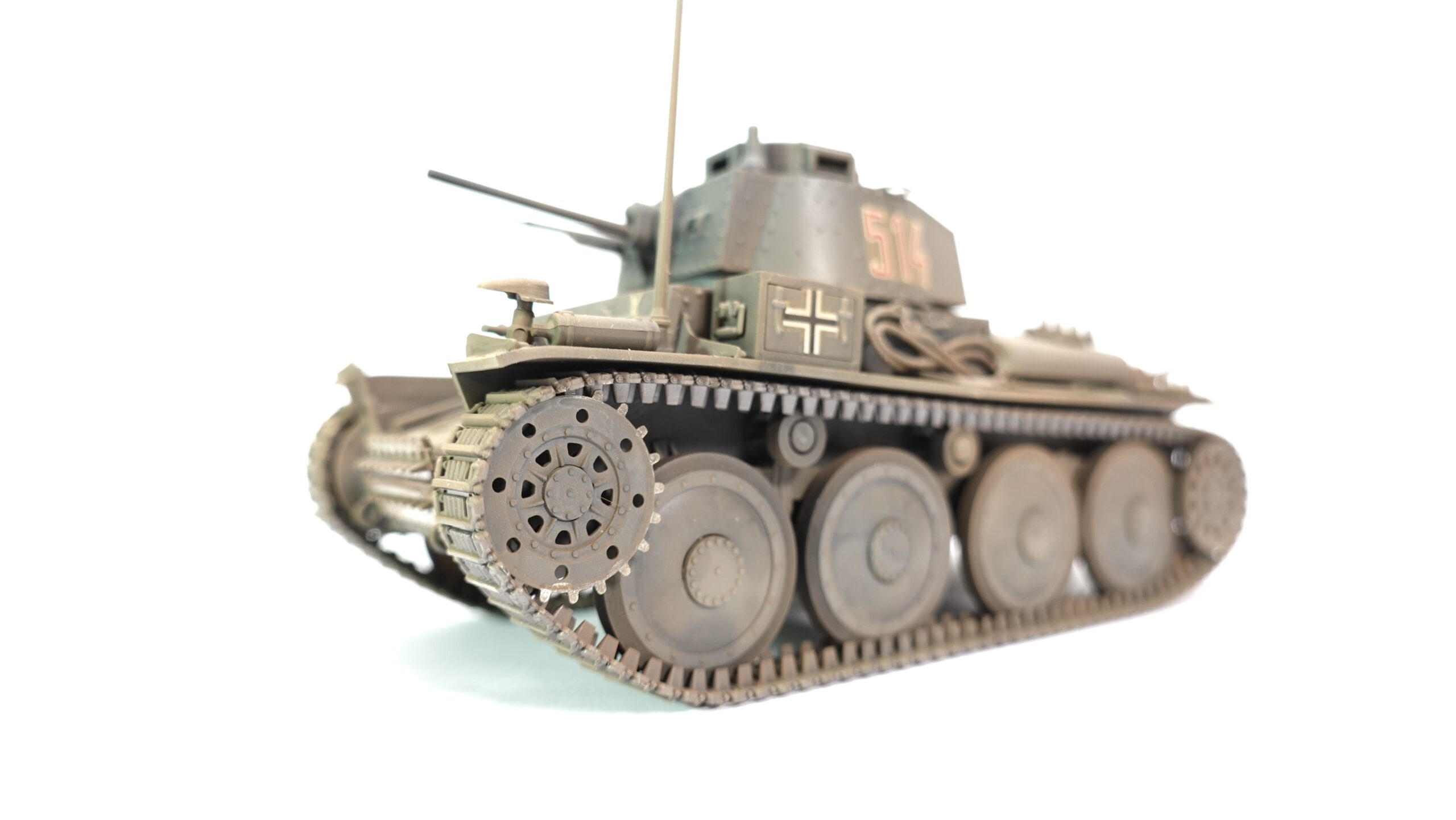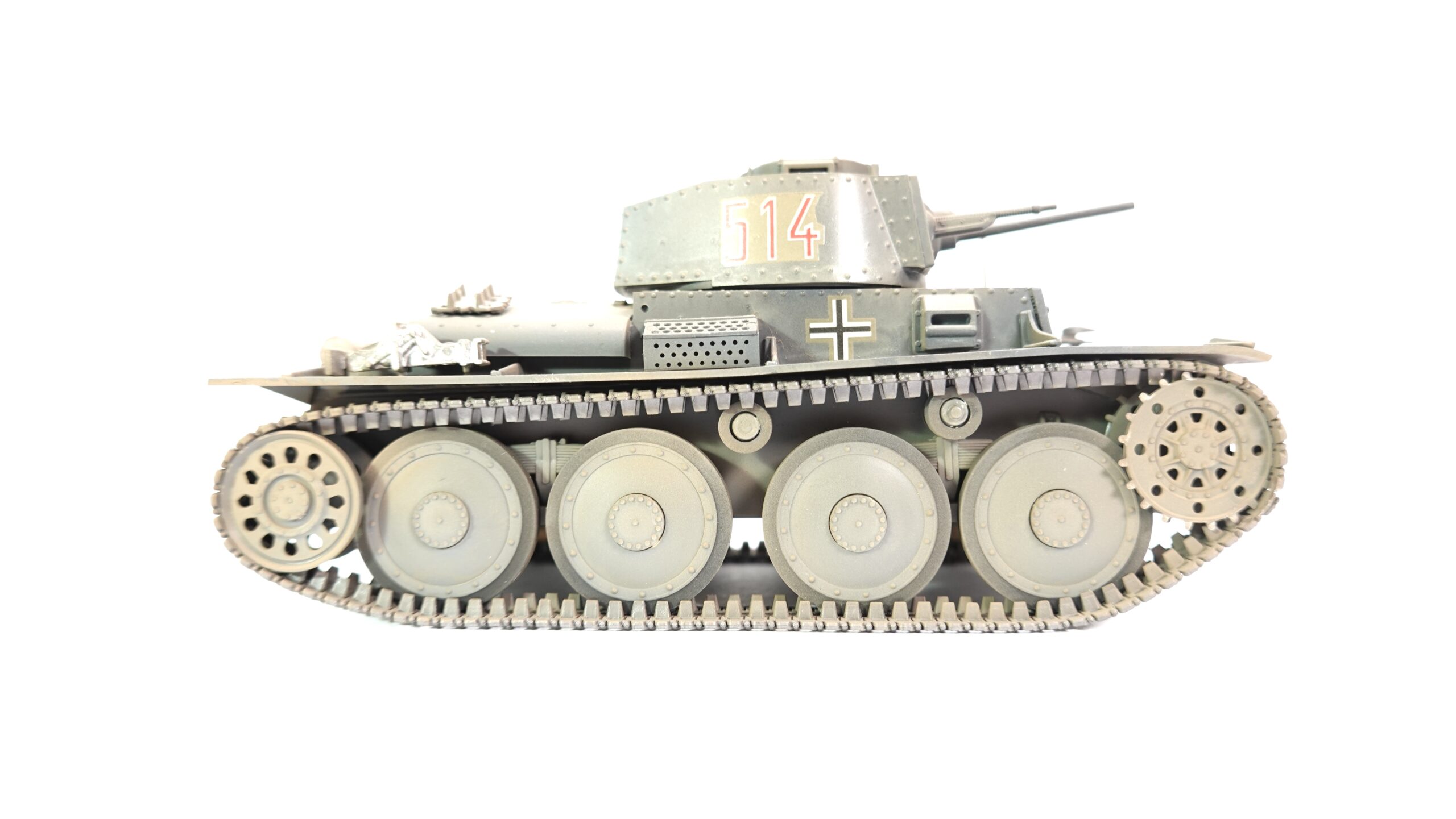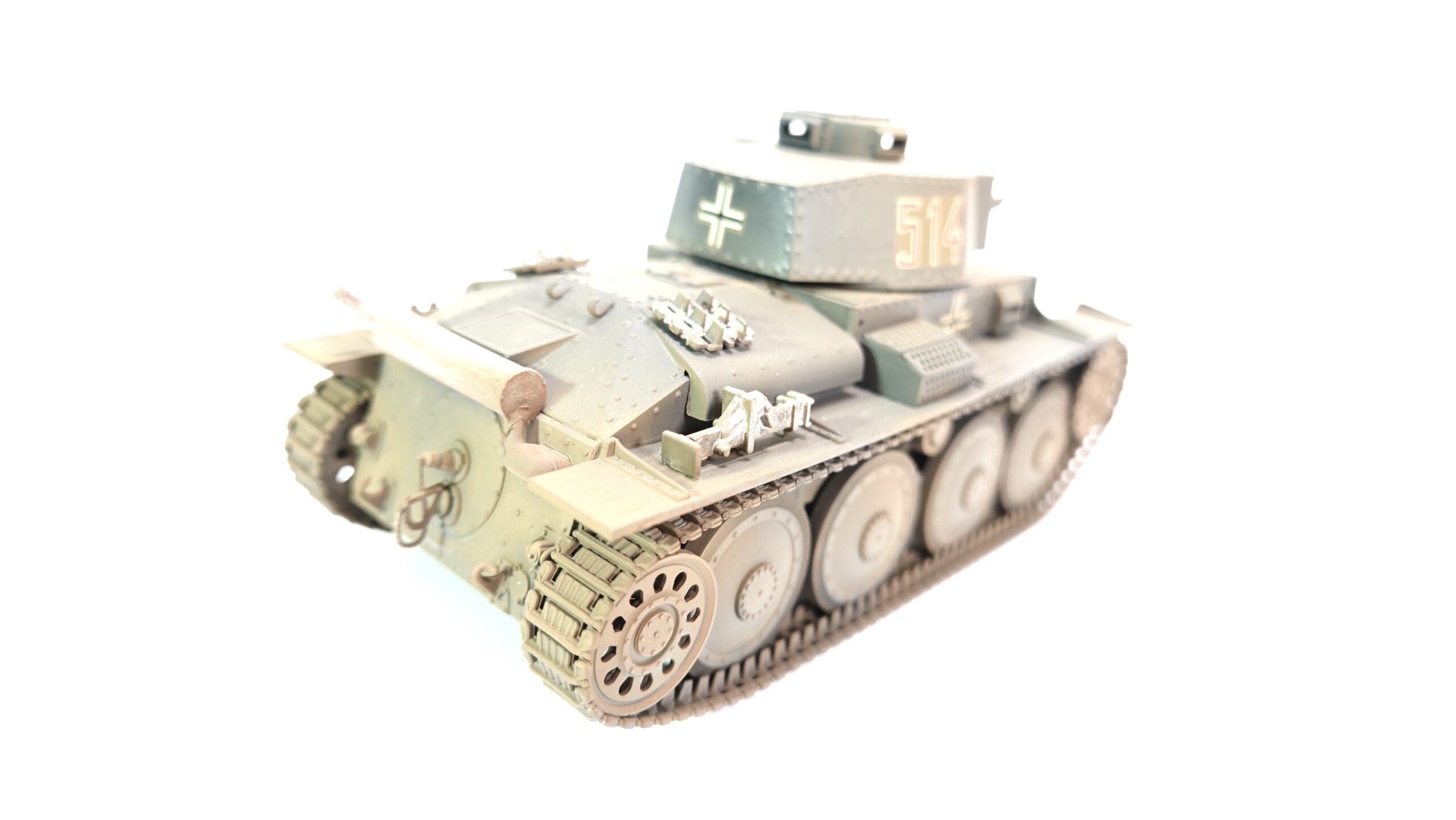 Dieses Modell stellt den Panzer II Ausf. F in authentischer Optik dar, inklusive realitätsnaher Lackierung, Turmbewaffnung und der typischen Werkzeug- und Zubehöranbringung am Wannenrand. Die Betriebsnummer 514 sowie die Balkenkreuze deuten auf ein Fahrzeug aus einem Panzerregiment an der Ostfront hin.