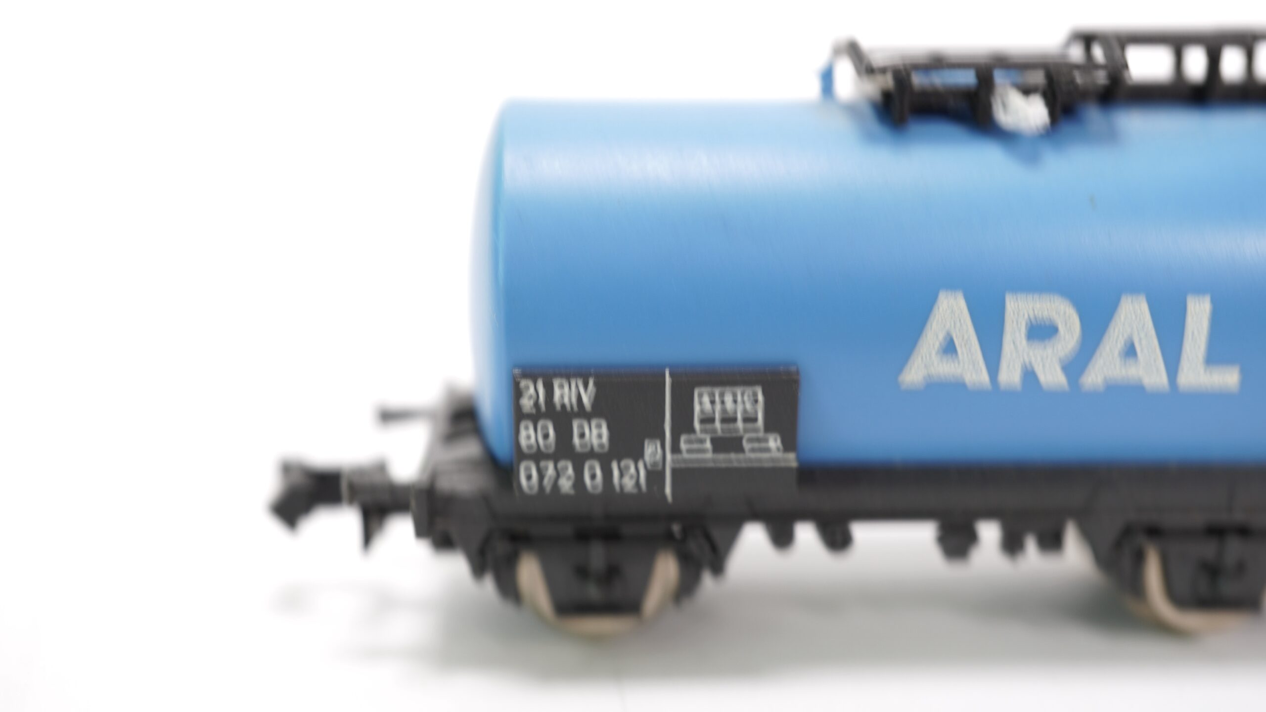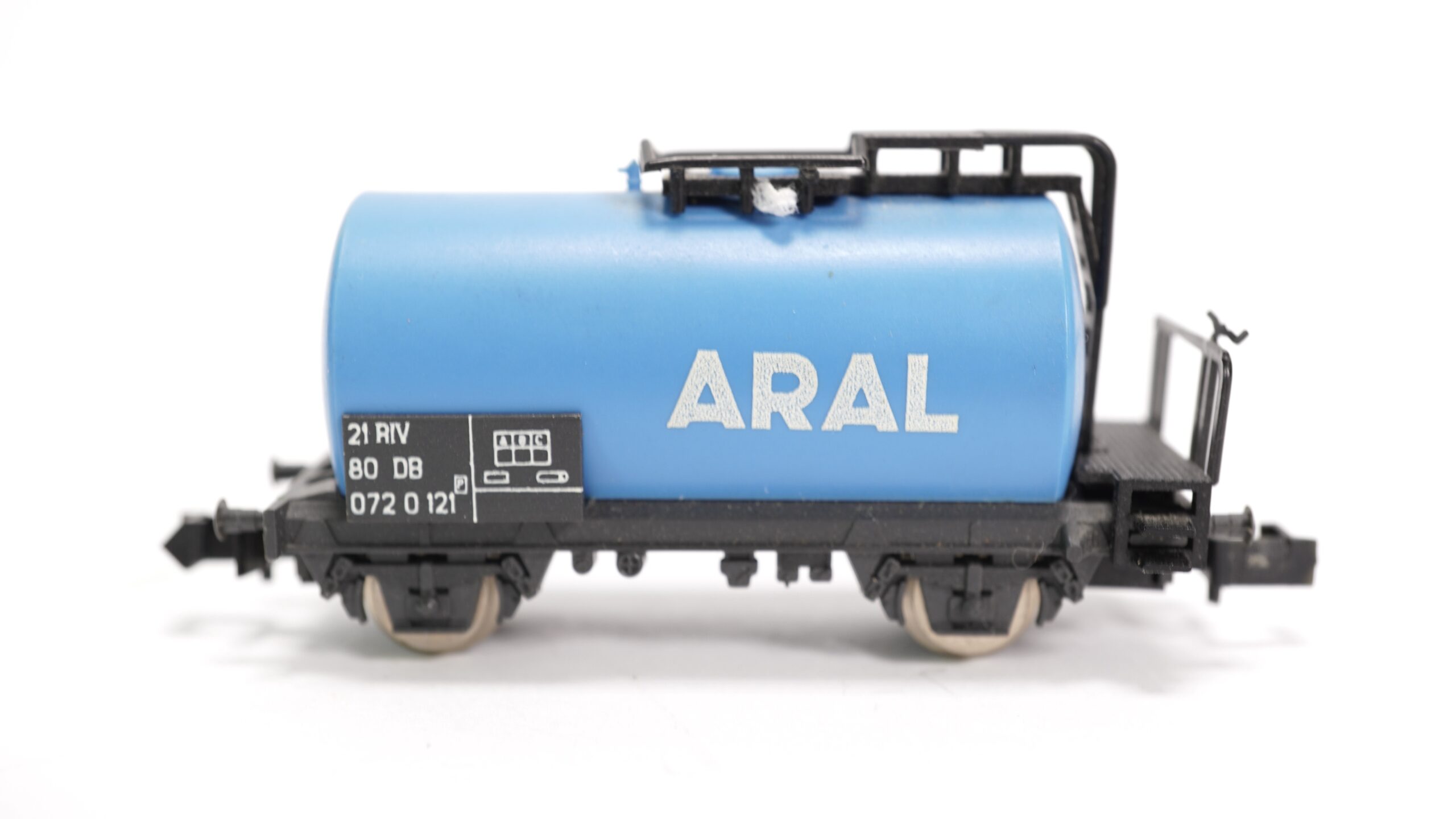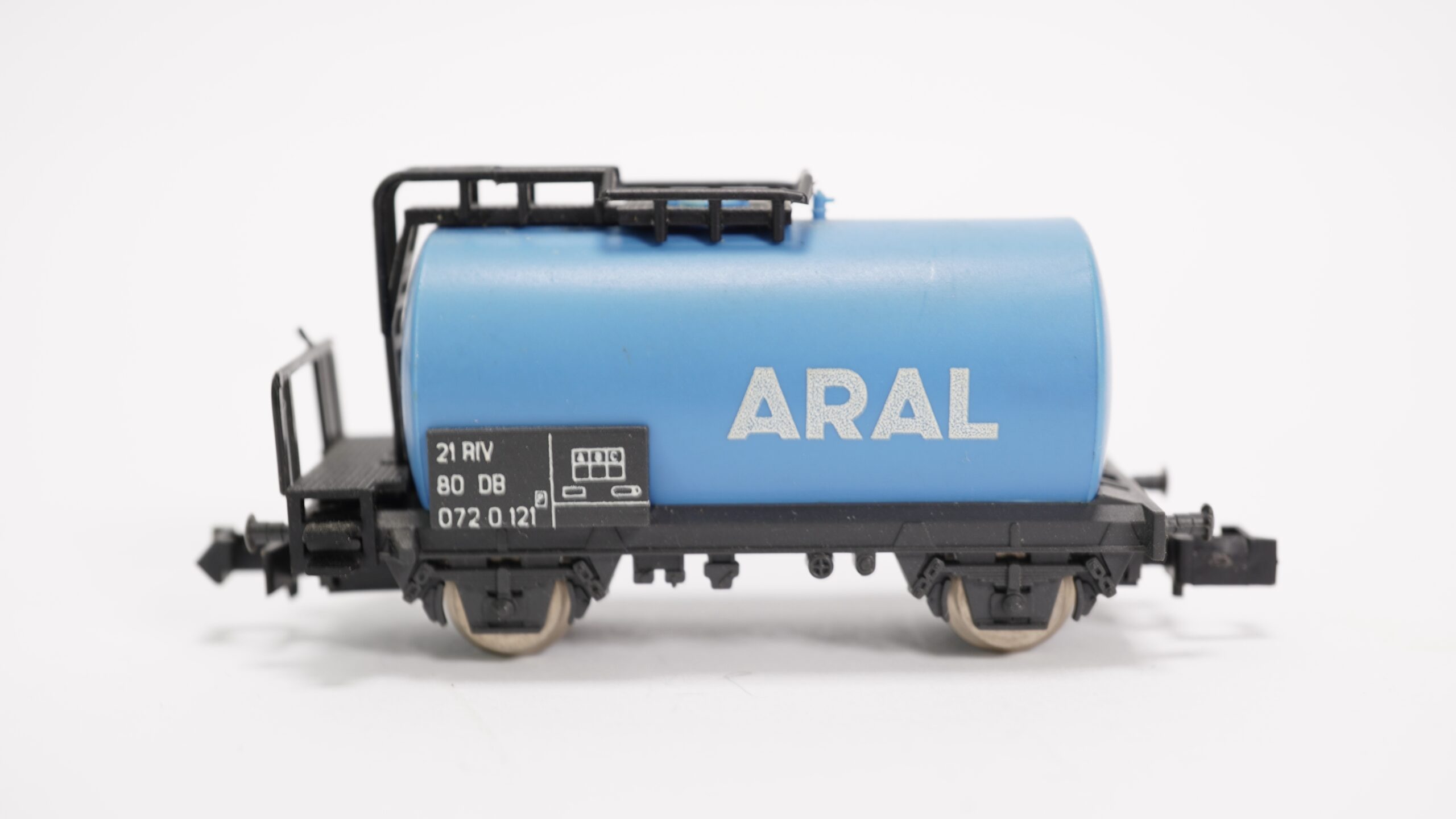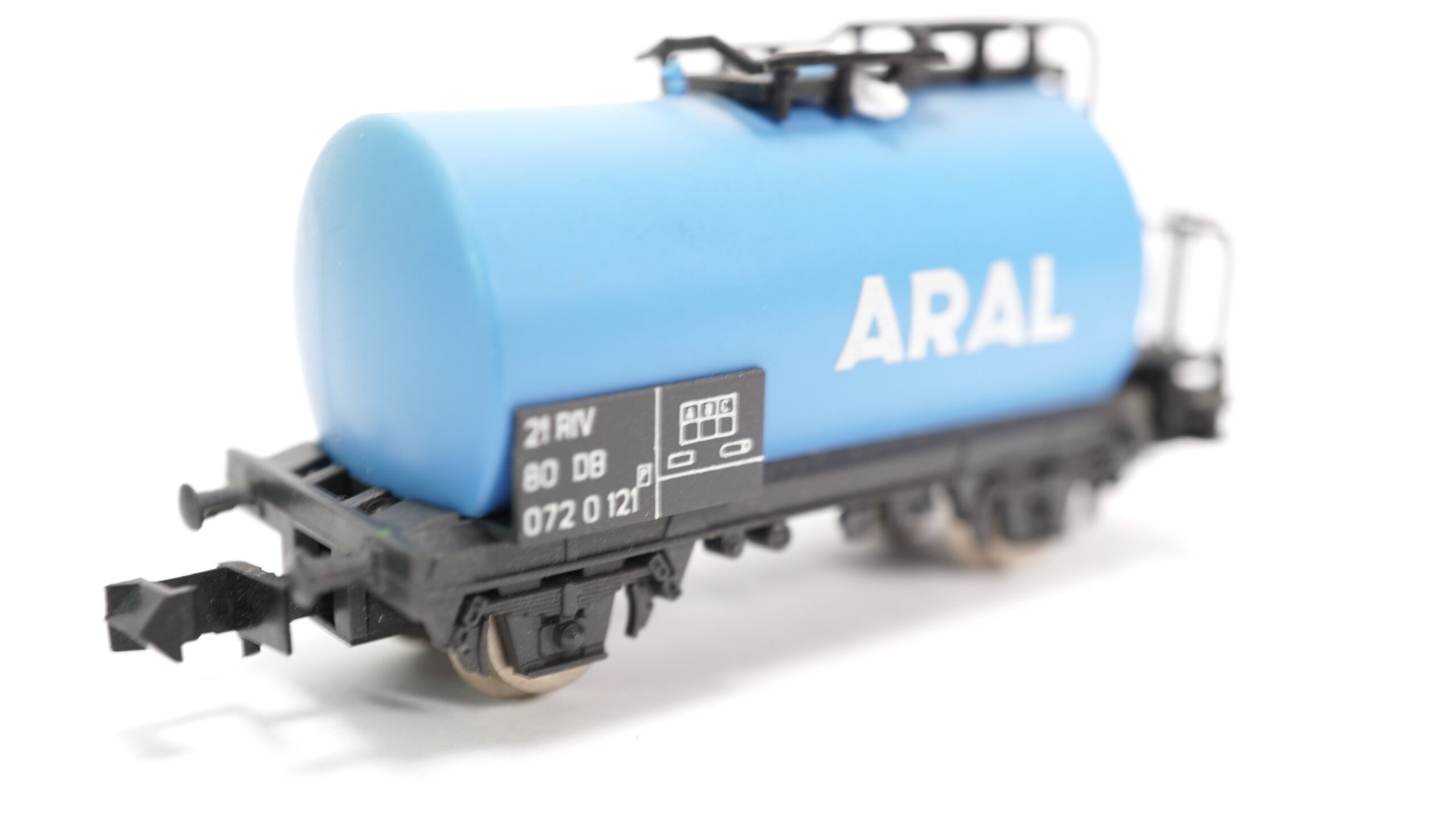 • Der Wagen ist in einem auffälligen blau lackiert, mit dem markanten „ARAL“-Logo auf der Seite, was auf seine Verwendung für den Transport von ARAL-Kraftstoffen hinweist.