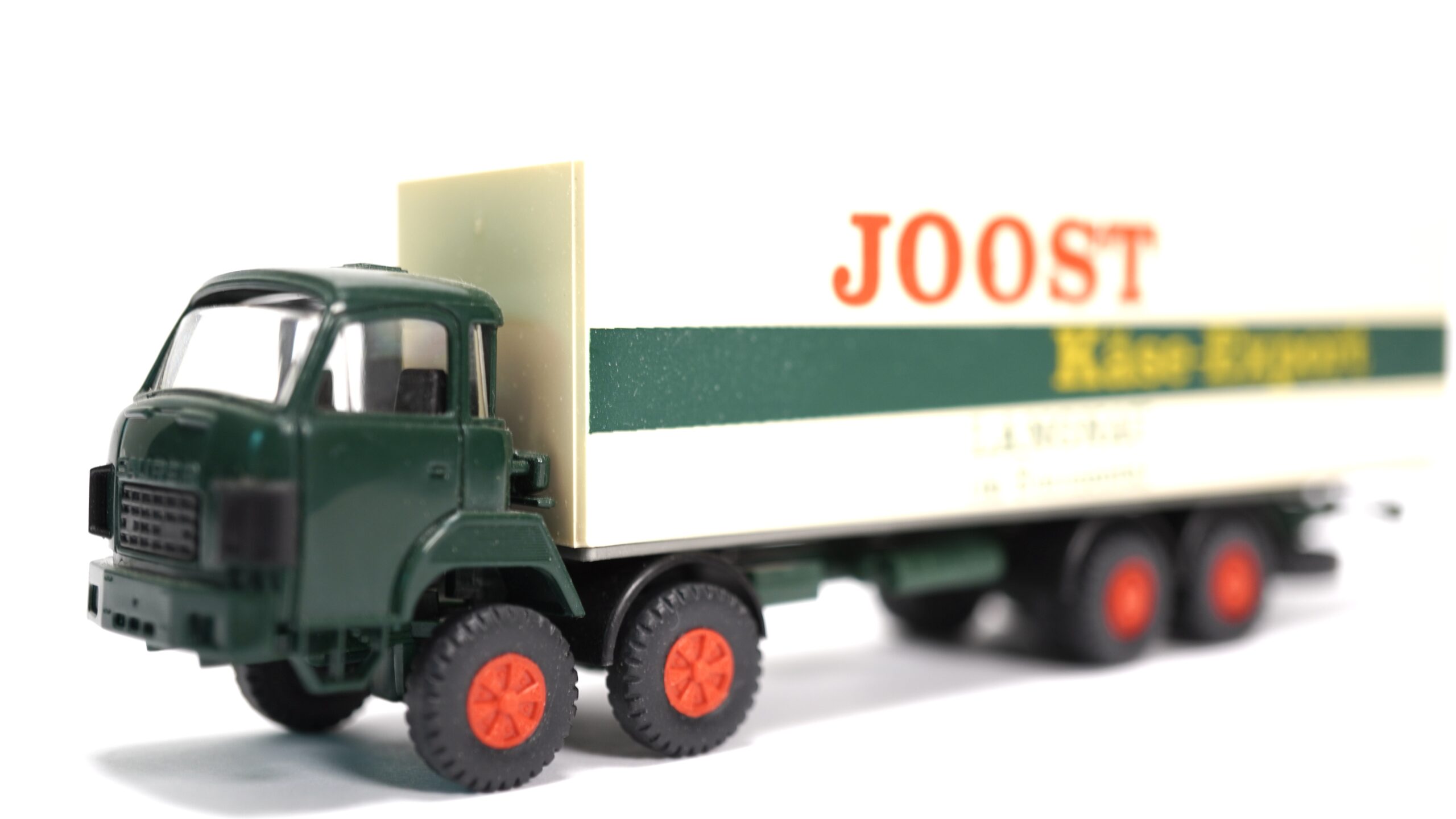 Der Saurer D290/330 beeindruckte durch seine markante Frontpartie, die klare Linienführung und seine imposante Erscheinung als vierachsiger Koffer-LKW. Solche Fahrzeuge wurden vor allem für den sicheren und geschützten Transport empfindlicher Waren eingesetzt. In der Gestaltung von Joost Käse erhält der Lastwagen einen unverwechselbaren Charakter, der an die traditionsreiche Käse- und Lebensmittelbranche erinnert. Gerade im Kühl- und Frischwarentransport spielten zuverlässige LKW eine entscheidende Rolle, um hochwertige Produkte termingerecht an Händler und Märkte zu liefern.
