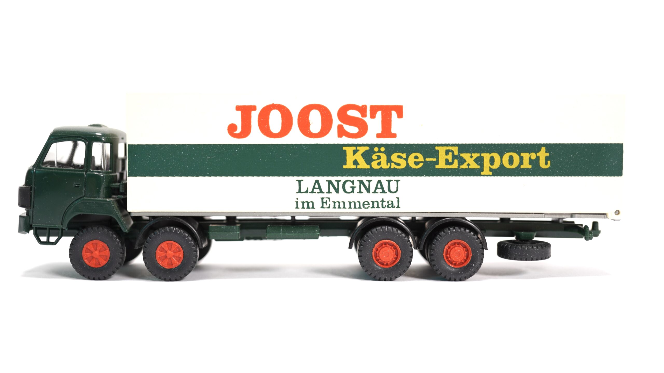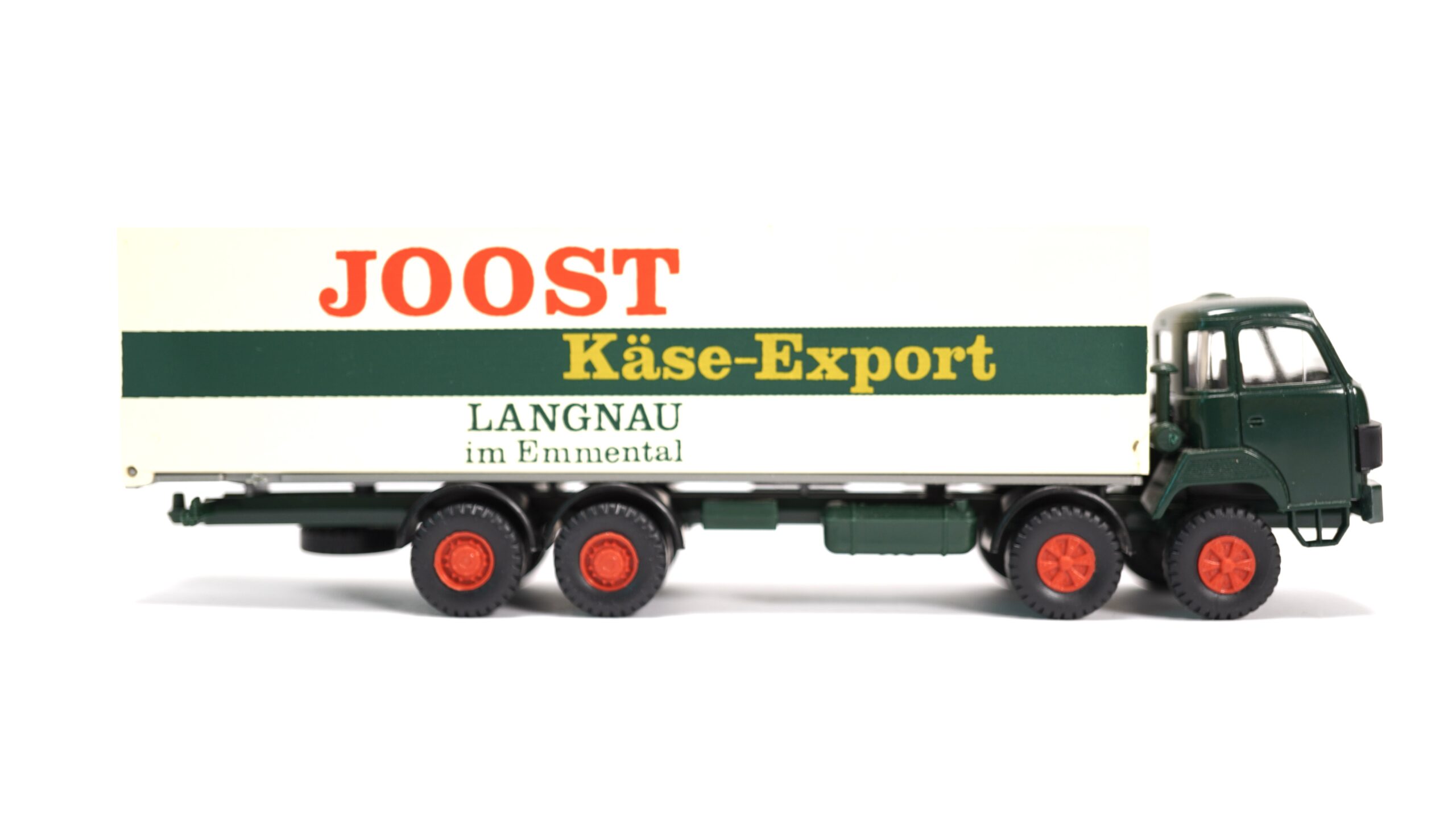 Die Kombination aus schweizerischer Ingenieurskunst von Saurer und der werbewirksamen Gestaltung für Joost Käse verleiht dem Fahrzeug eine authentische Ausstrahlung. Der Roskopf Saurer D290/330 4-Achs-Koffer-LKW Joost Käse verkörpert damit nicht nur ein Nutzfahrzeug, sondern ein Stück Wirtschaftsgeschichte. Er erinnert an eine Zeit, in der Speditionen mit Stolz ihre aufwendig gestalteten Firmenfahrzeuge präsentierten und Markenbotschaften auf Europas Straßen sichtbar machten.