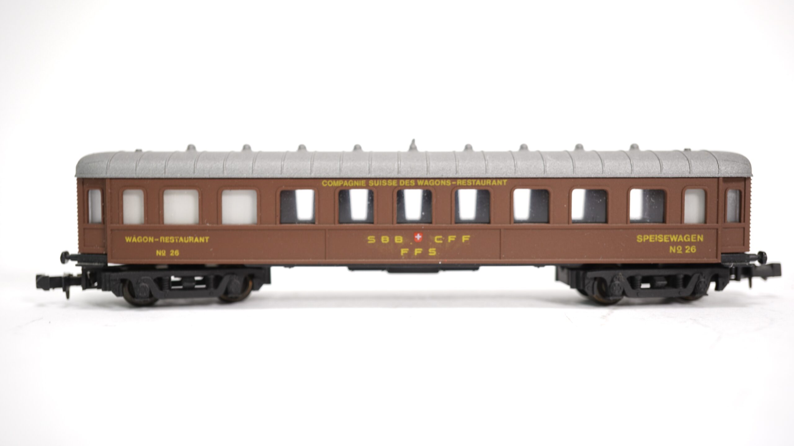 Die Beschriftung des Modells ist mehrsprachig gehalten – ganz wie es sich für die Schweiz gehört. „Waggon-Restaurant“ einerseits und „Speisewagen“ andererseits zeugen von der kulturellen Vielfalt des Landes. Ergänzt wird dies durch die Aufschrift Compagnie Suisse des Wagons-Restaurants, was dem Modell zusätzlich einen Hauch internationaler Eleganz verleiht.