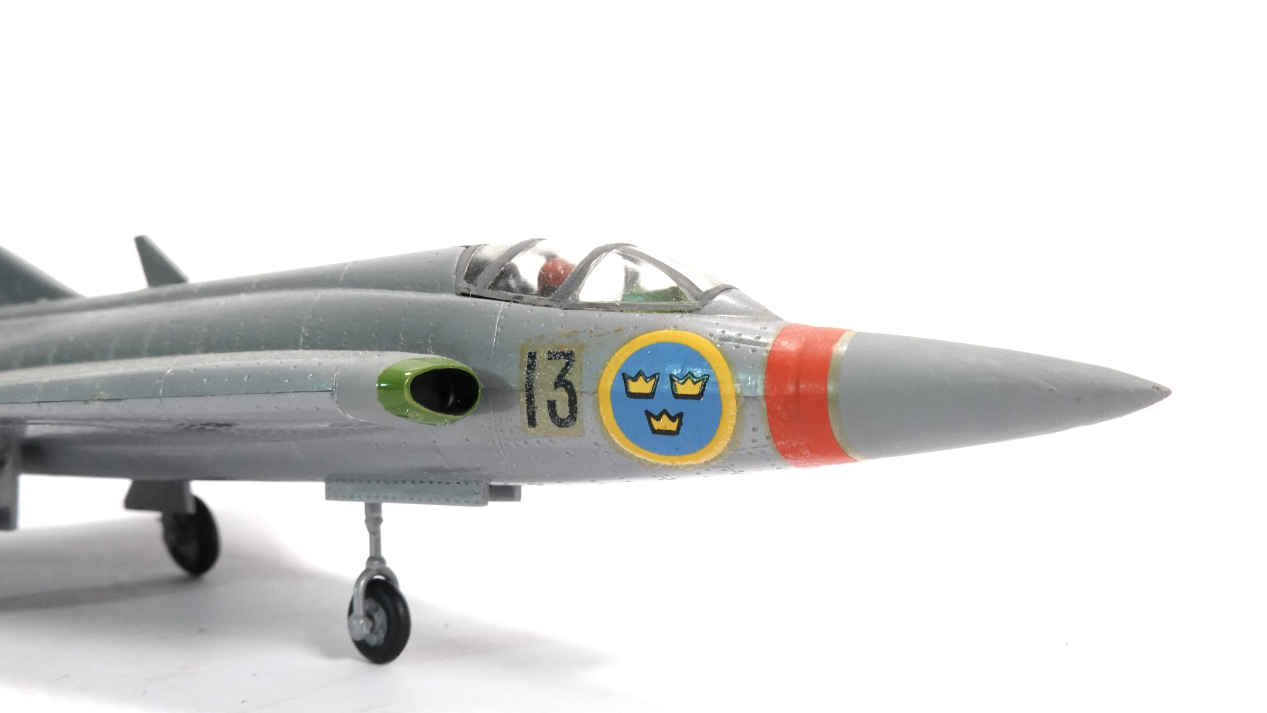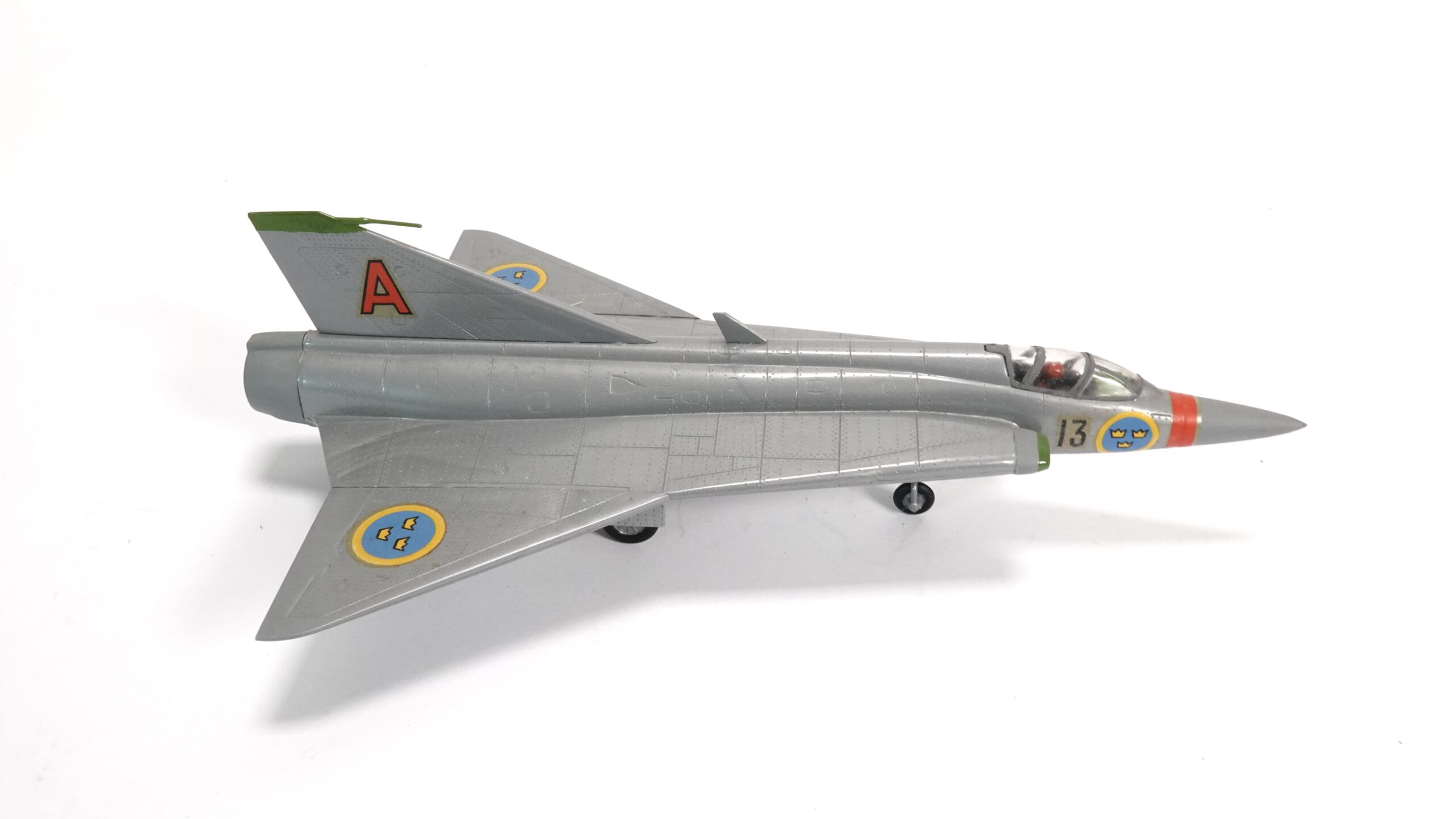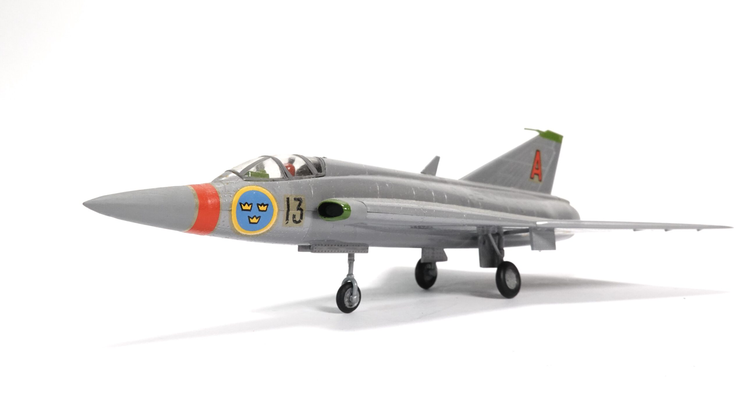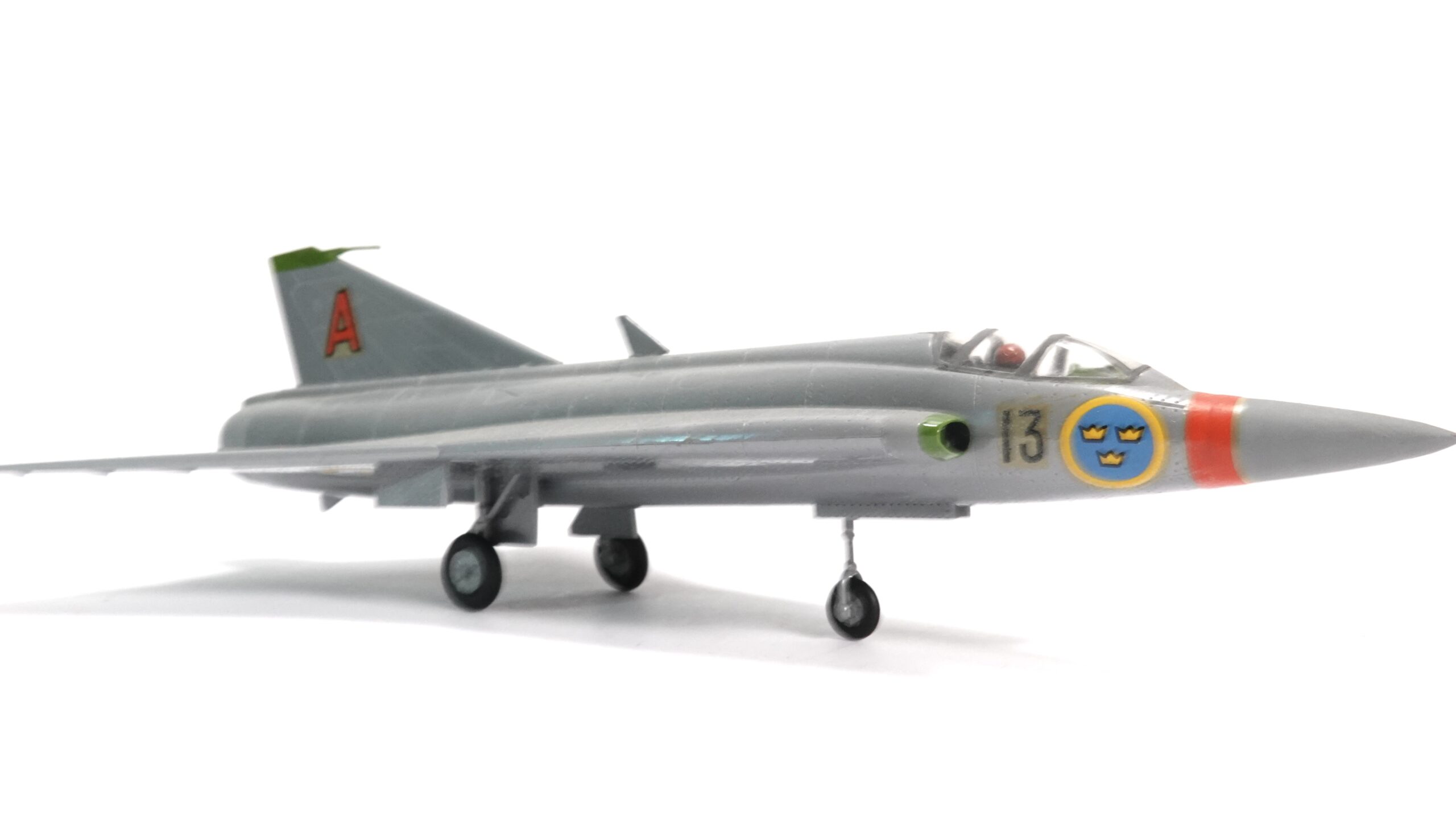 Die Maschine war über Jahrzehnte das Rückgrat der schwedischen Luftverteidigung und wurde später auch von Dänemark, Finnland und Österreich eingesetzt. Die hier gezeigte Variante trägt die Markierung „13“ sowie das schwedische Hoheitszeichen mit den drei gelben Kronen auf blauem Grund – ein Symbol der königlichen Luftwaffe Schwedens. Am Leitwerk ist deutlich das rote „A“ erkennbar, ein Hinweis auf die Staffel- oder Geschwaderzugehörigkeit.