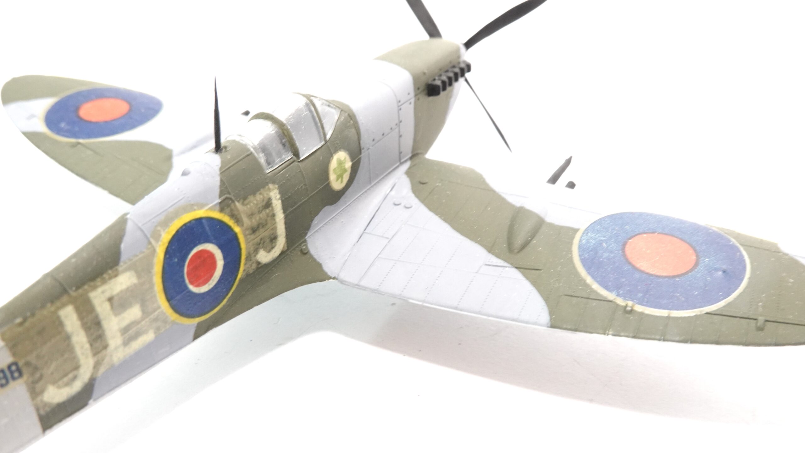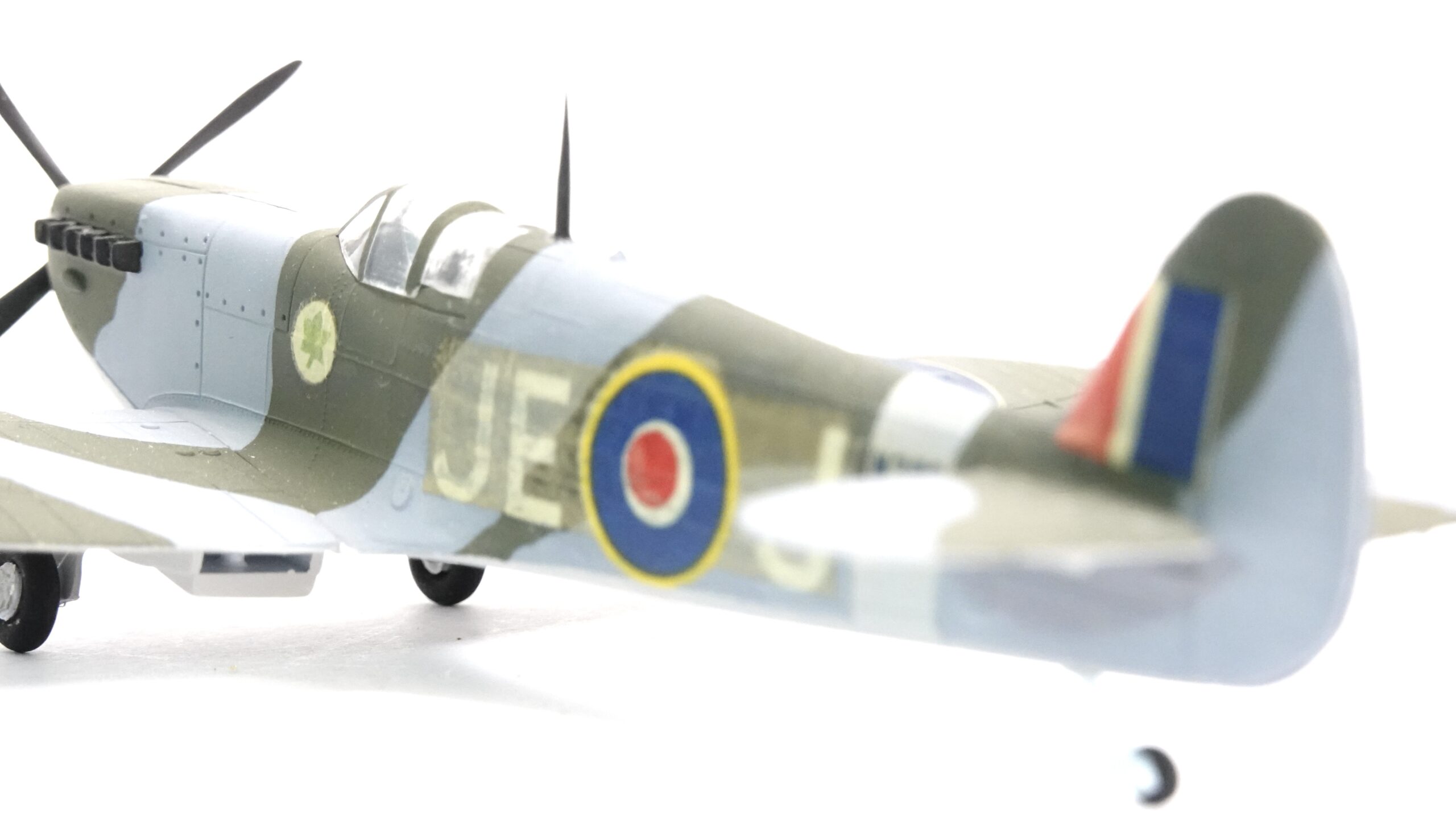Dieses Modell ist aus Kunststoff gefertigt und im Maßstab 1:72 umgesetzt. Bei einer Originalspannweite von 11,23 m ergibt sich eine Modellspannweite von rund 15 cm (gemessen). Die authentische Tarnlackierung in Olivgrün und Grau mit den typischen RAF-Roundels auf Rumpf und Tragflächen entspricht historischen Vorlagen. Auf der linken Rumpfseite ist zusätzlich das vierblättrige Kleeblatt-Emblem von Johnsons Maschine aufgebracht.