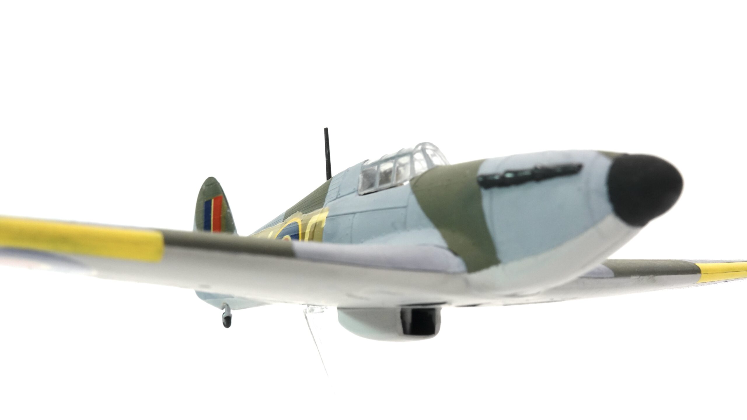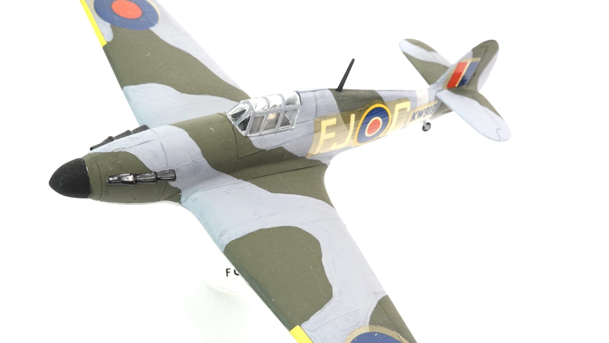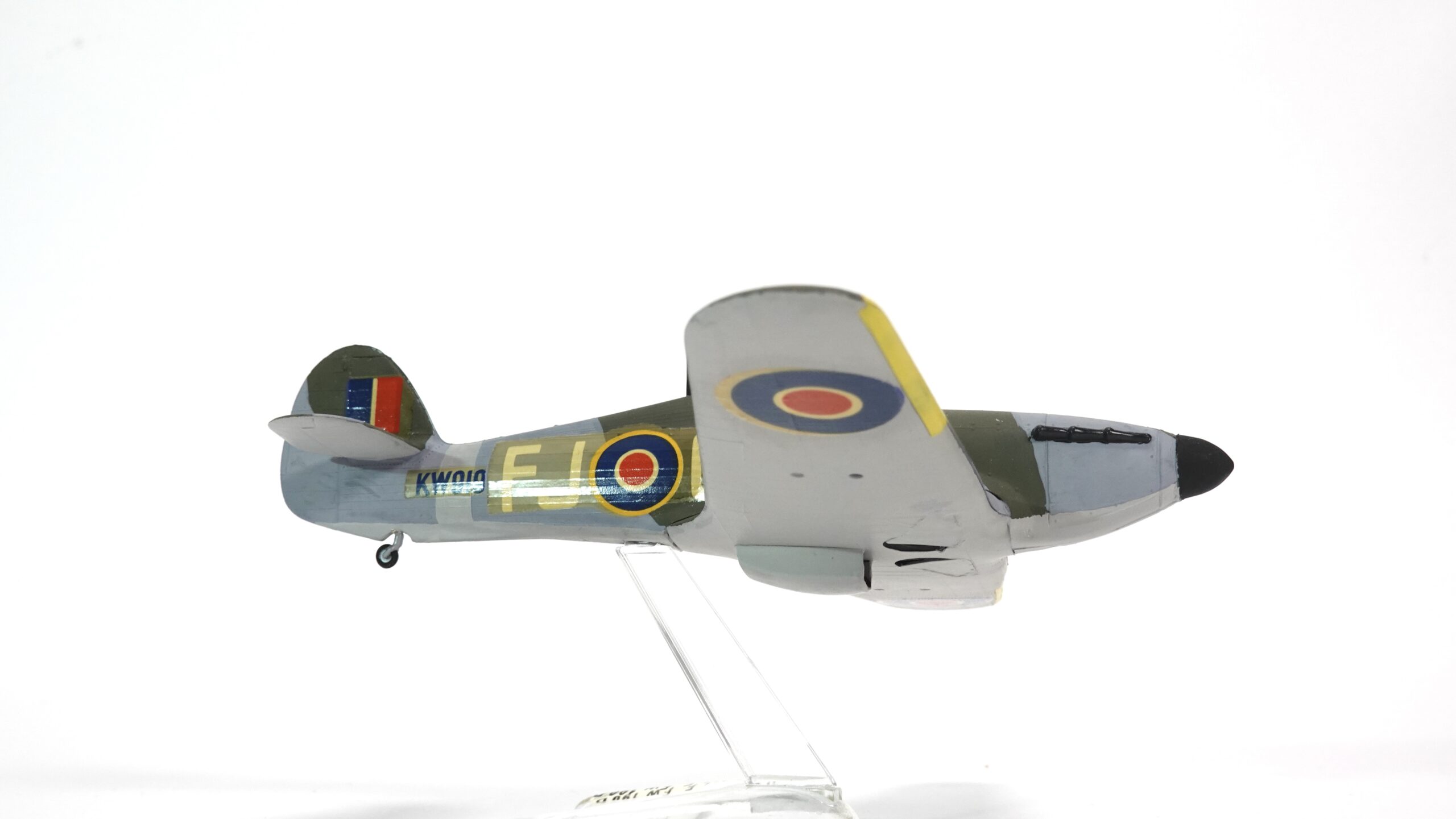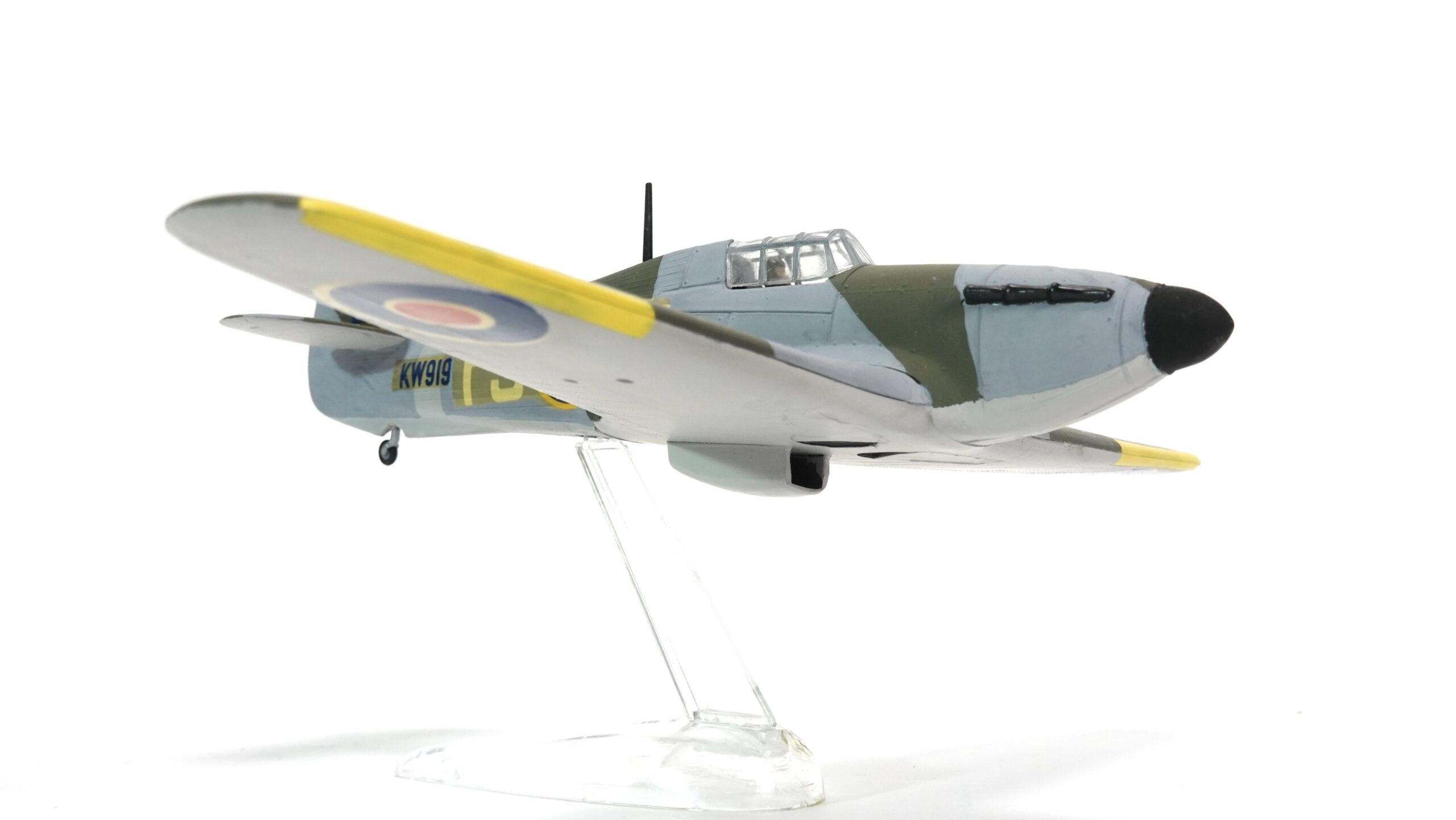 Die hier gezeigte Ausführung trägt die Betriebsnummer KW-D und ist mit den typischen Hoheitszeichen der Royal Air Force versehen. Die authentische Tarnbemalung in Dunkelgrün und Grau, kombiniert mit gelben Markierungen an den Flügelvorderkanten, orientiert sich an der Einsatzbemalung britischer Jagdverbände im europäischen Kriegsschauplatz. Alle Farbflächen wurden in sorgfältiger Handarbeit aufgetragen – die klare Linienführung, die Deckkraft der Farben und die feine Ausarbeitung zeugen von viel handwerklichem Können.