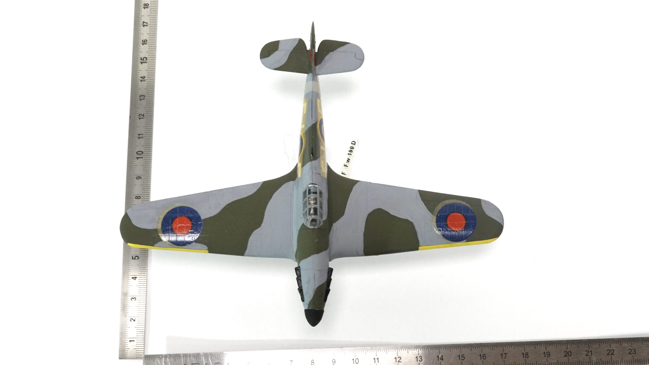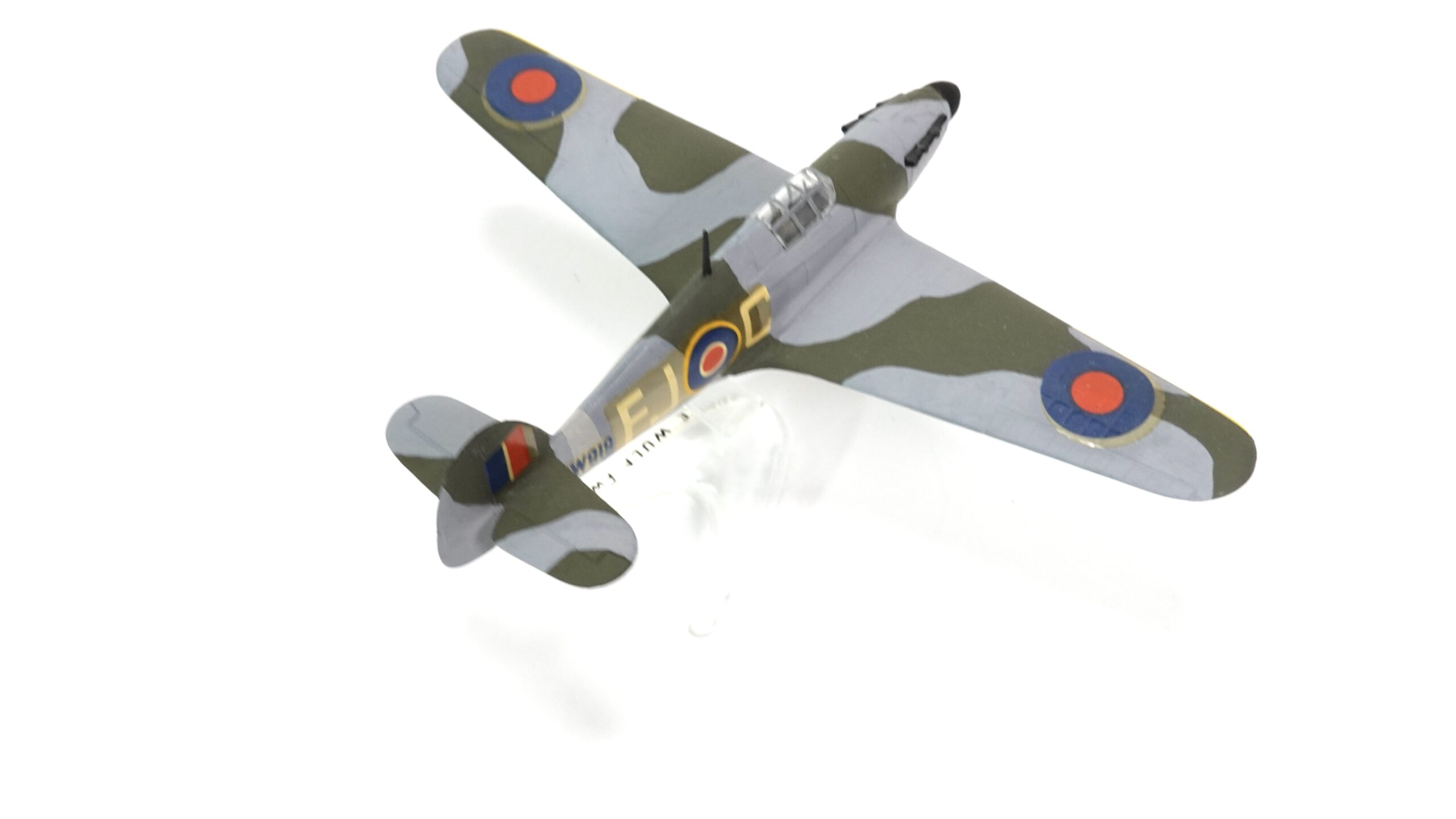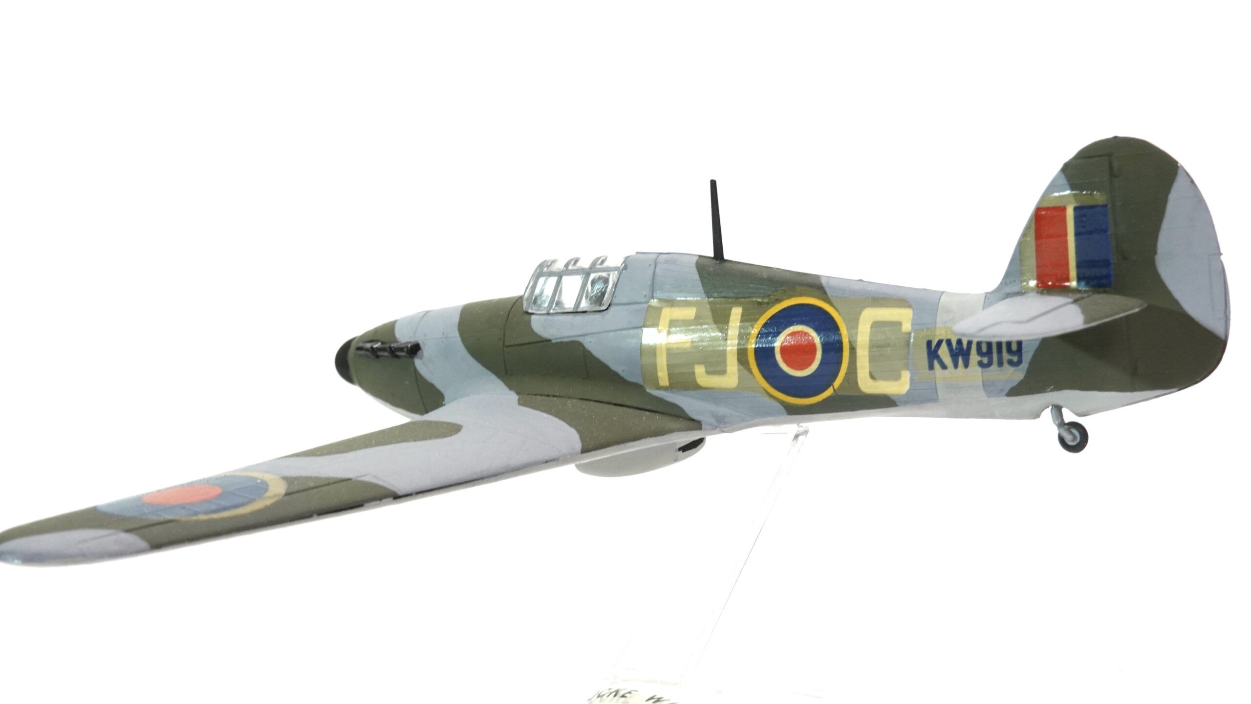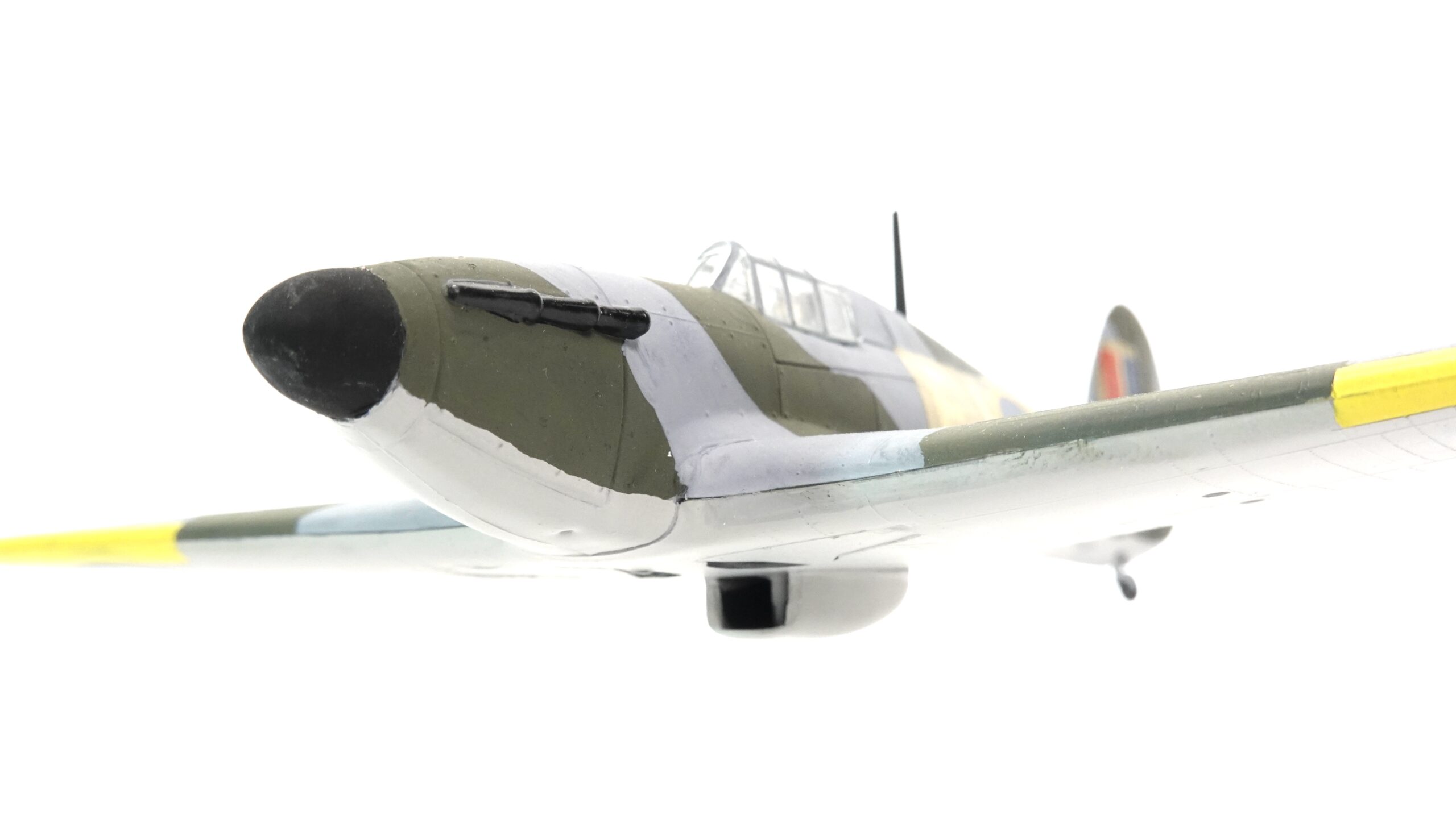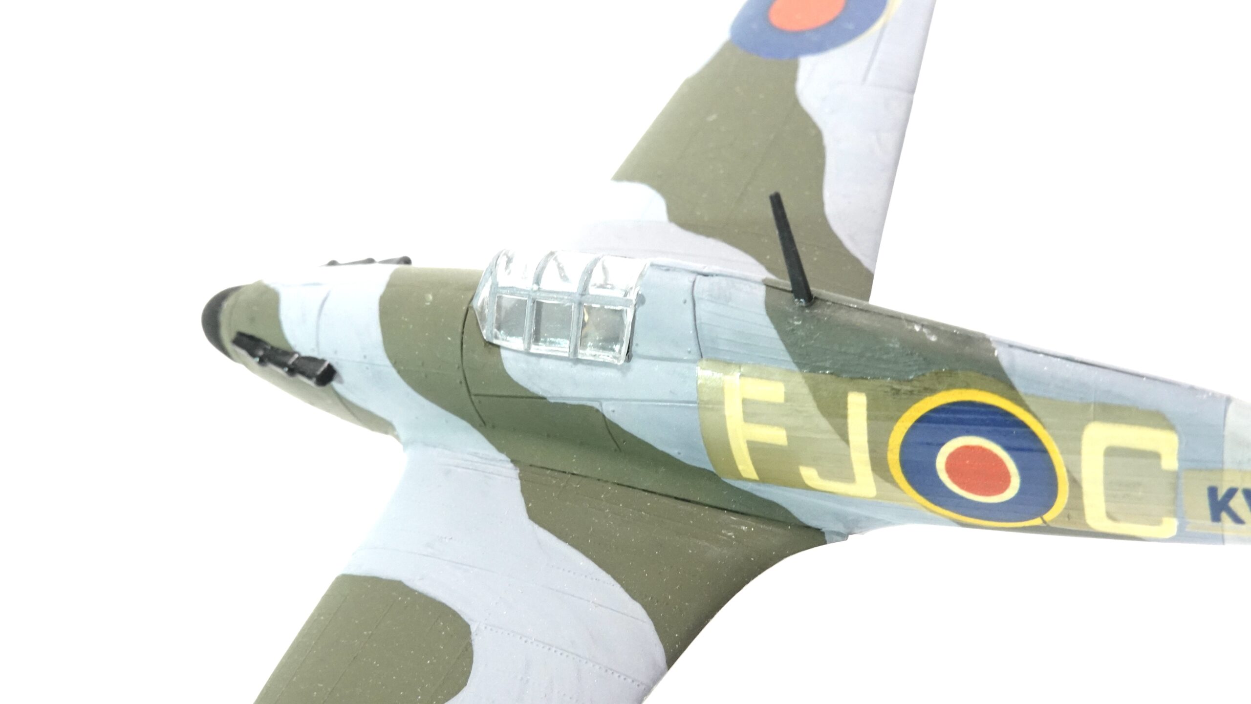 Die hier gezeigte Ausführung trägt die Betriebsnummer KW-D und ist mit den typischen Hoheitszeichen der Royal Air Force versehen. Die authentische Tarnbemalung in Dunkelgrün und Grau, kombiniert mit gelben Markierungen an den Flügelvorderkanten, orientiert sich an der Einsatzbemalung britischer Jagdverbände im europäischen Kriegsschauplatz. Alle Farbflächen wurden in sorgfältiger Handarbeit aufgetragen – die klare Linienführung, die Deckkraft der Farben und die feine Ausarbeitung zeugen von viel handwerklichem Können.