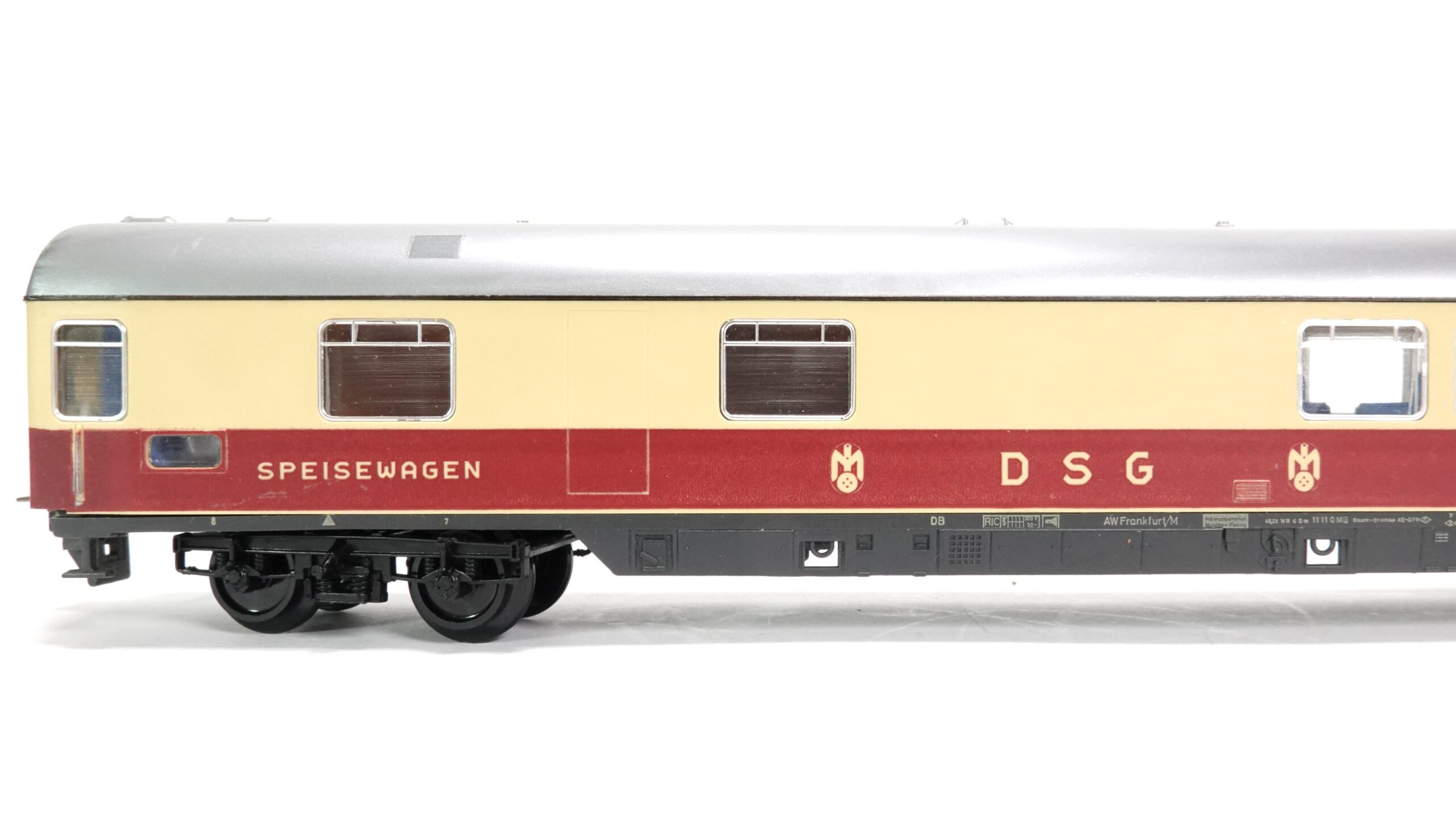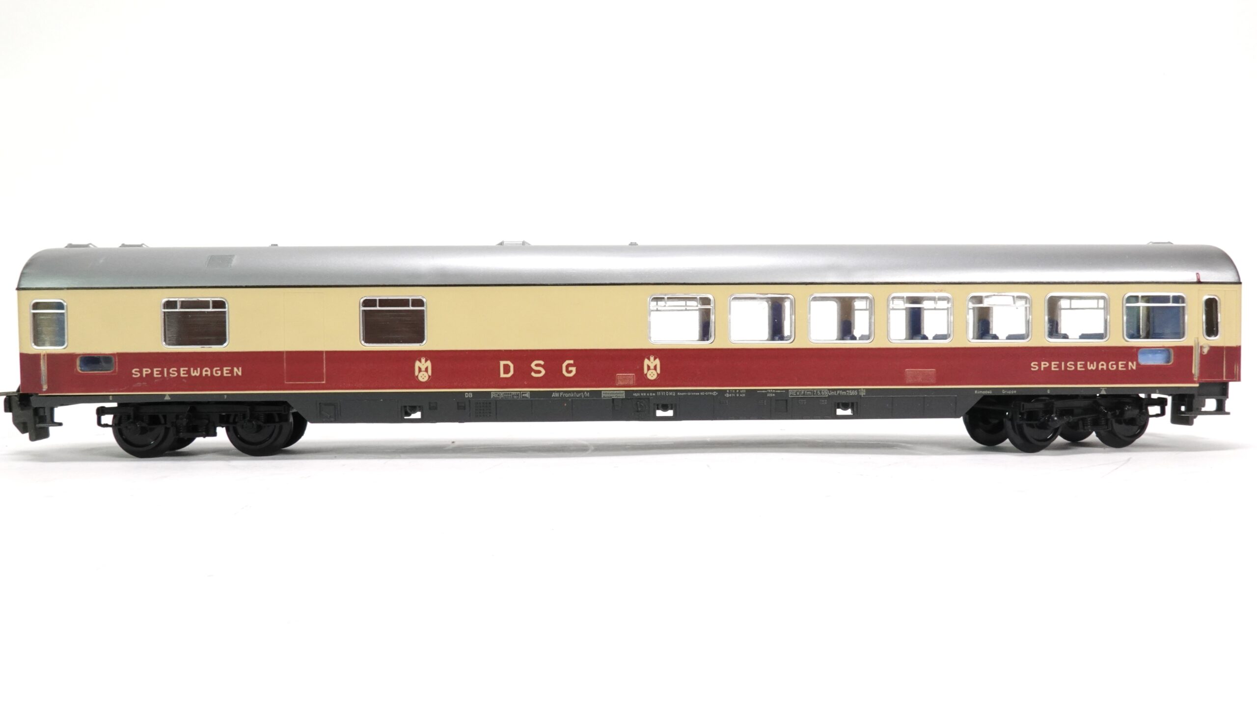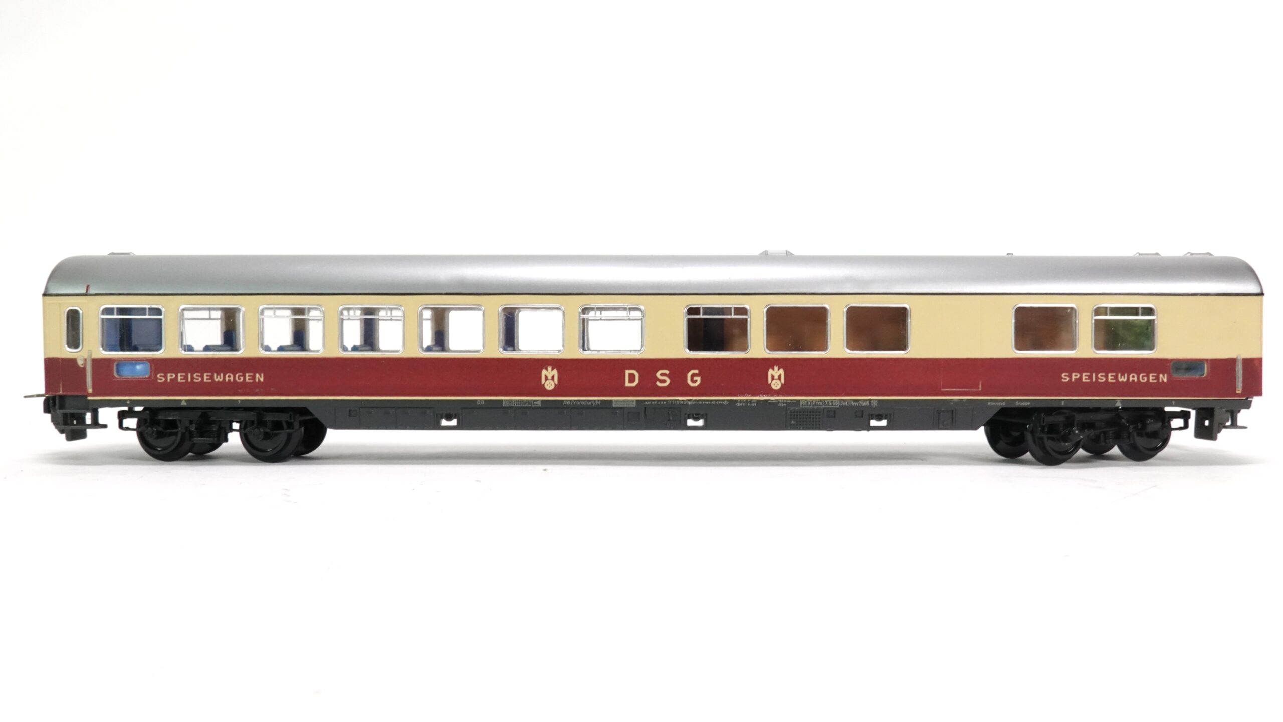 Dieser Speisewagen ist nicht nur ein optisches Schmuckstück auf Ihrer Anlage, sondern auch ein zentraler Bestandteil jeder TEE-Zusammenstellung. Die markante Farbgebung, die sorgfältig gestalteten Details der Fensterfronten und die charakteristischen Türen sorgen für ein authentisches Erscheinungsbild, das sofort ins Auge fällt. Besonders in langen Zugkompositionen wird deutlich, wie wichtig der Speisewagen für das Gesamtbild einer TEE-Garnitur ist – er symbolisiert Komfort, Klasse und das besondere Reiseerlebnis.
