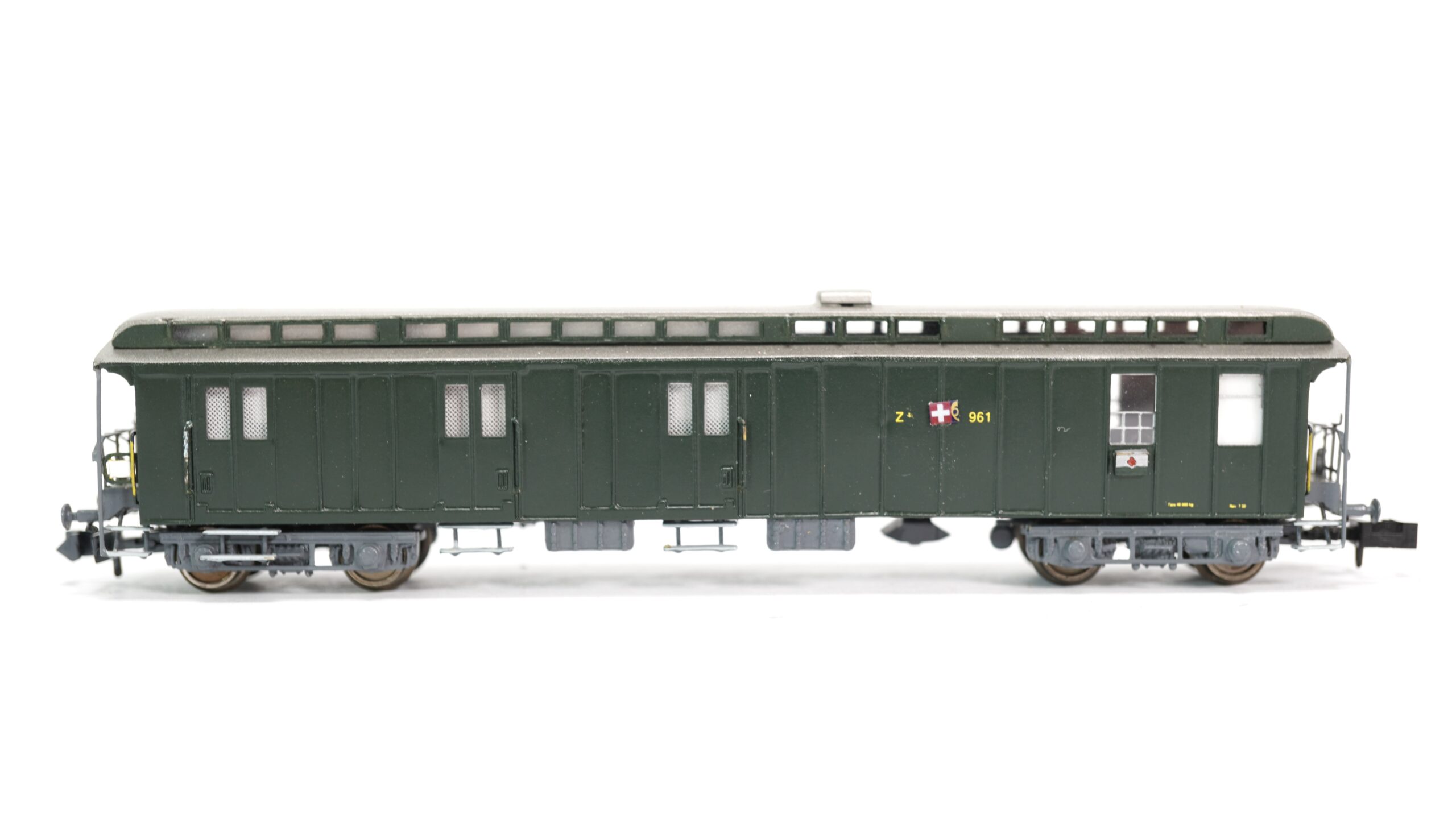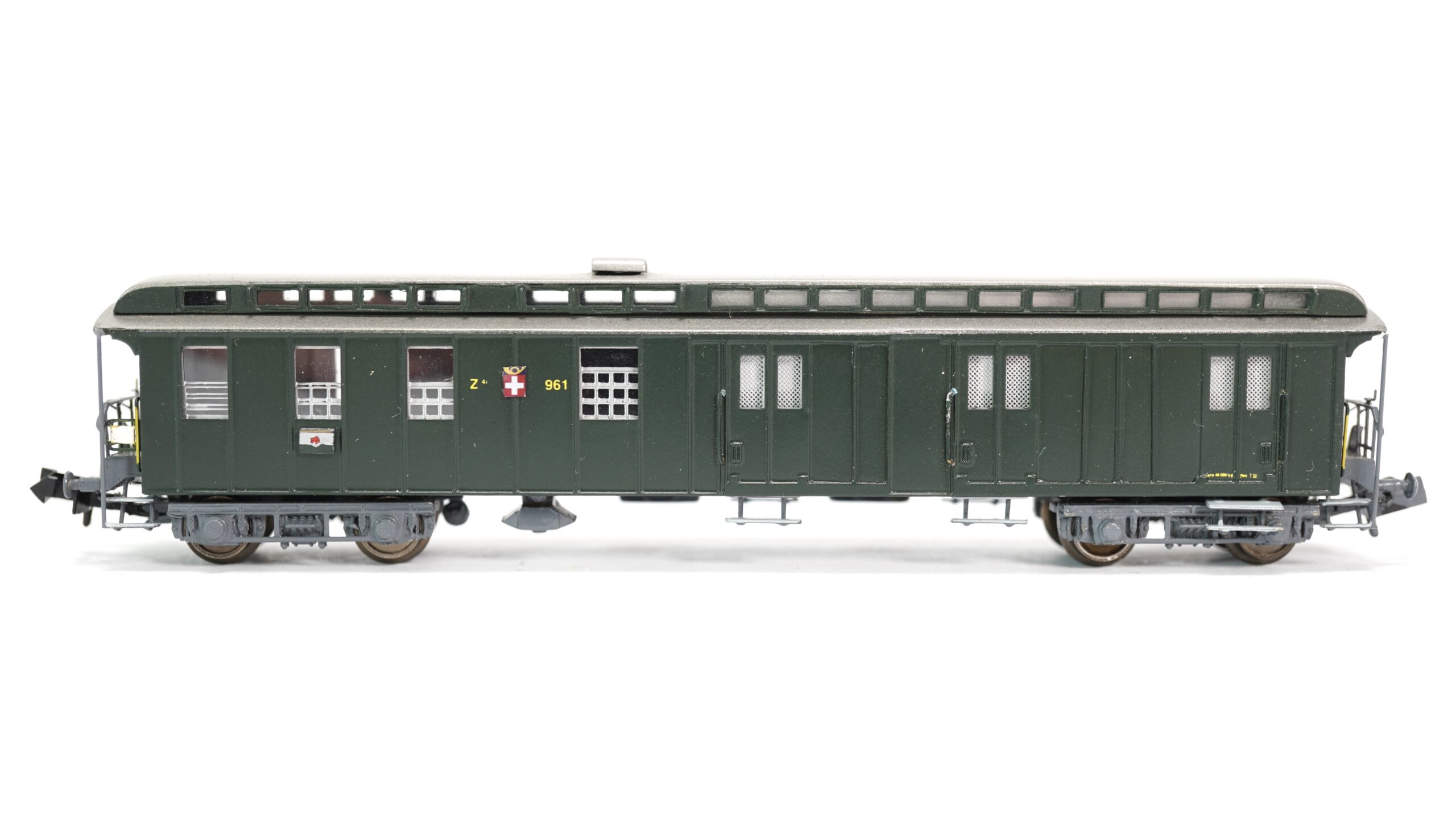 Der Wagen ist in klassischem SBB-Grün lackiert und trägt das SBB-Wappen sowie die feine Beschriftung mit der Wagennummer 961. Typisch für diesen Wagentyp sind die vielen kleinen Fenster, Lüftungsgitter und die markante Dachform mit Oberlichtern.