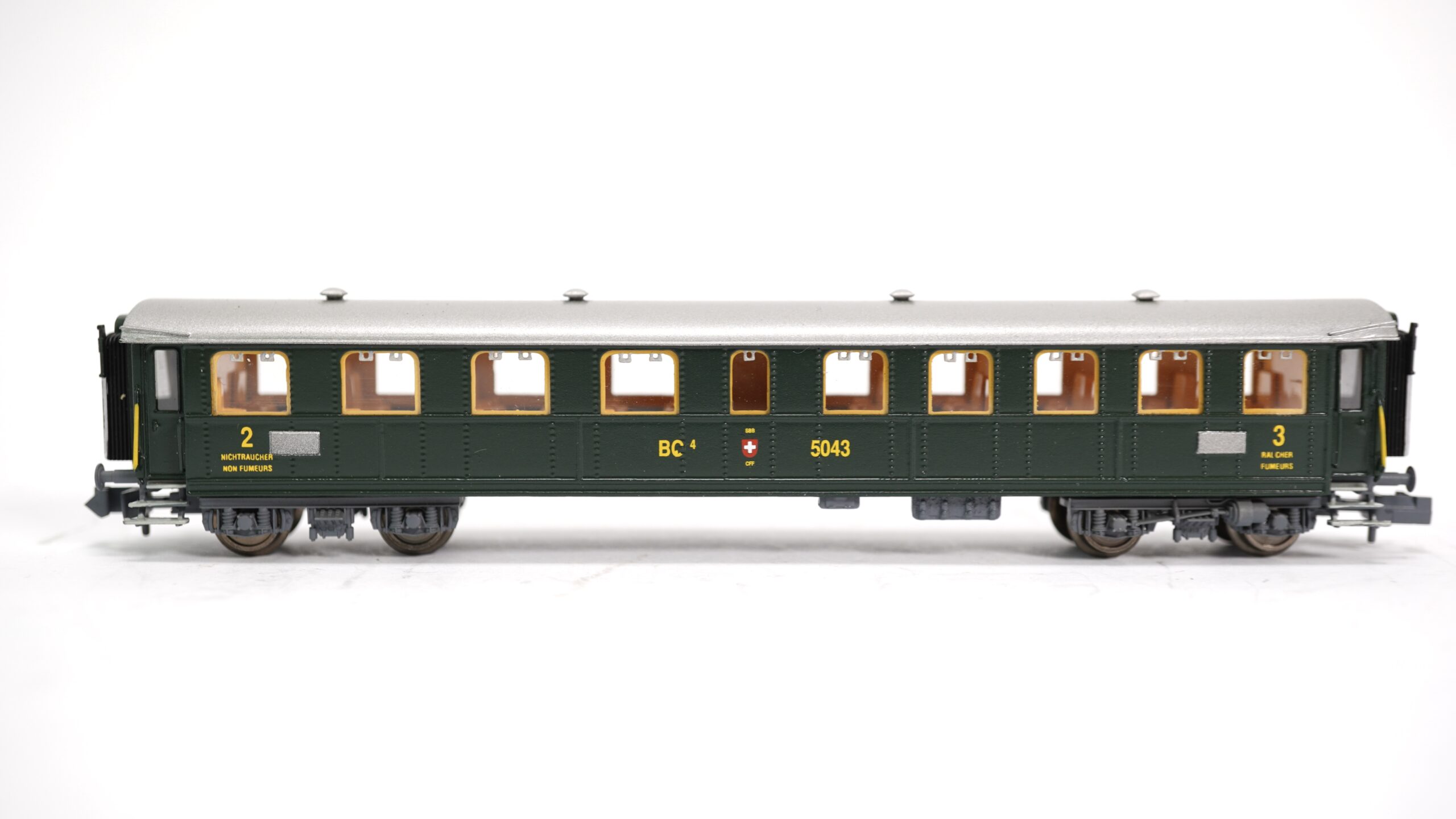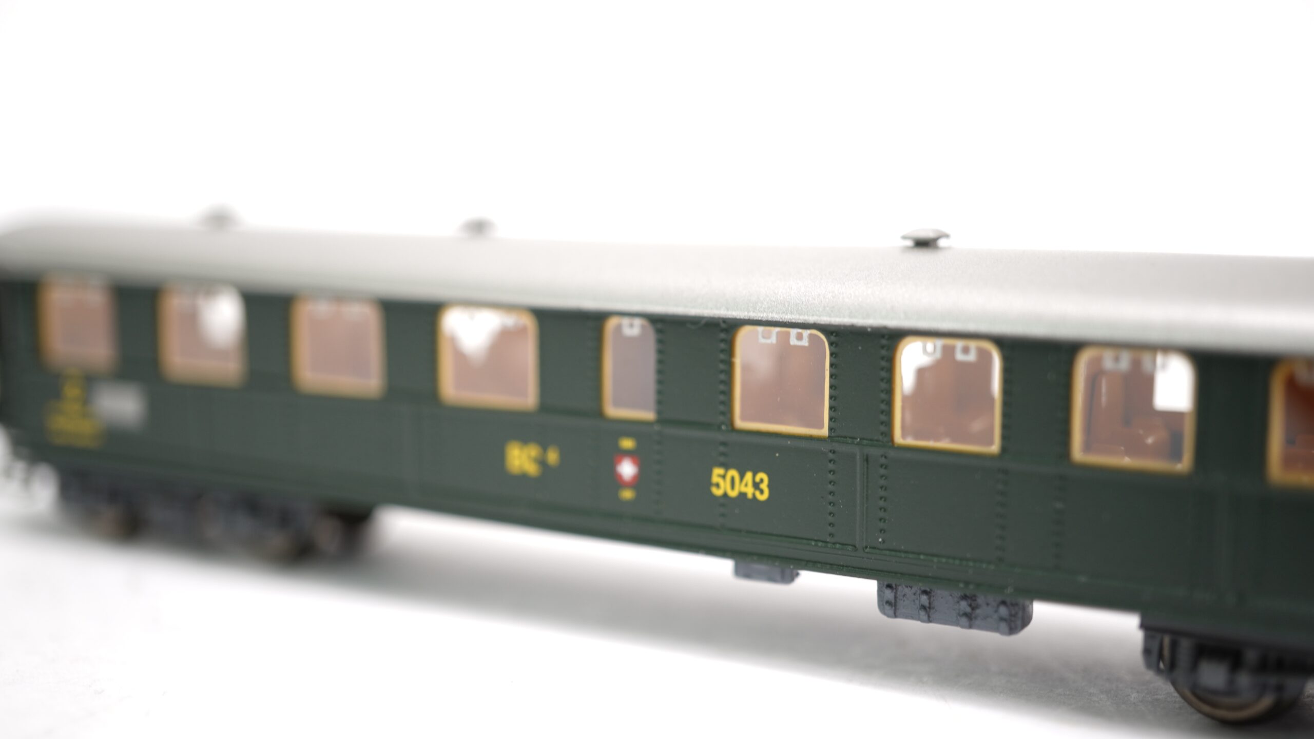 Der Originalwagen BC⁴ 5043 vereinte die 2. und 3. Klasse in einem einzigen Wagentyp – eine damals gängige Praxis, um möglichst viele Passagiere komfortabel zu befördern. Die robusten Stahlwagen dieser Bauart waren bis weit in die Nachkriegszeit auf den Haupt- und Nebenlinien der SBB unterwegs. Typisch: die markante dunkelgrüne Lackierung, das silbergraue Dach, genietete Seitenwände und gelbe Klassenbeschriftung.