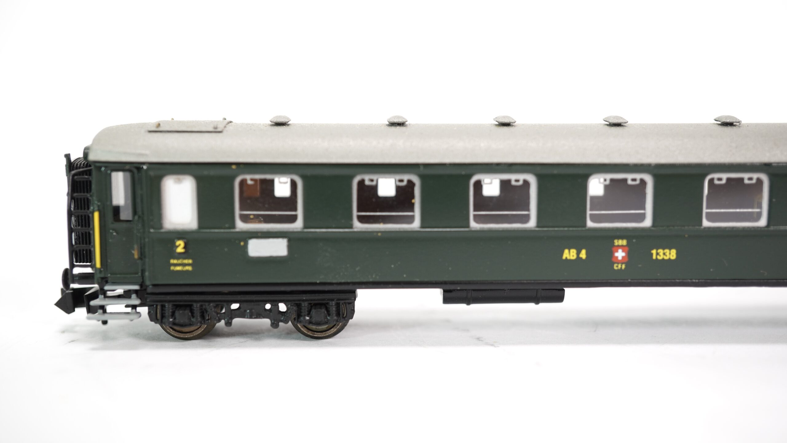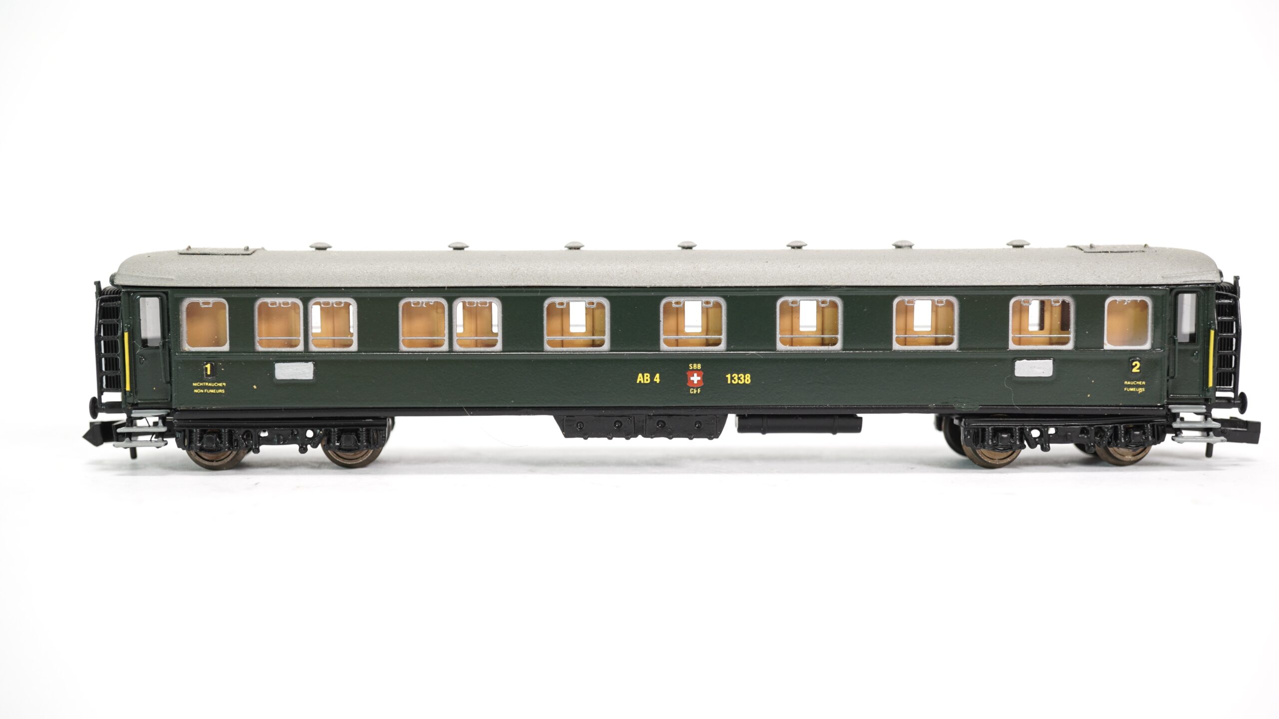 • Vorbildgetreue Beschriftung: SBB-Logo, Wagenbezeichnung AB4 1338, klare Klassenkennzeichnung (1. & 2. Klasse)