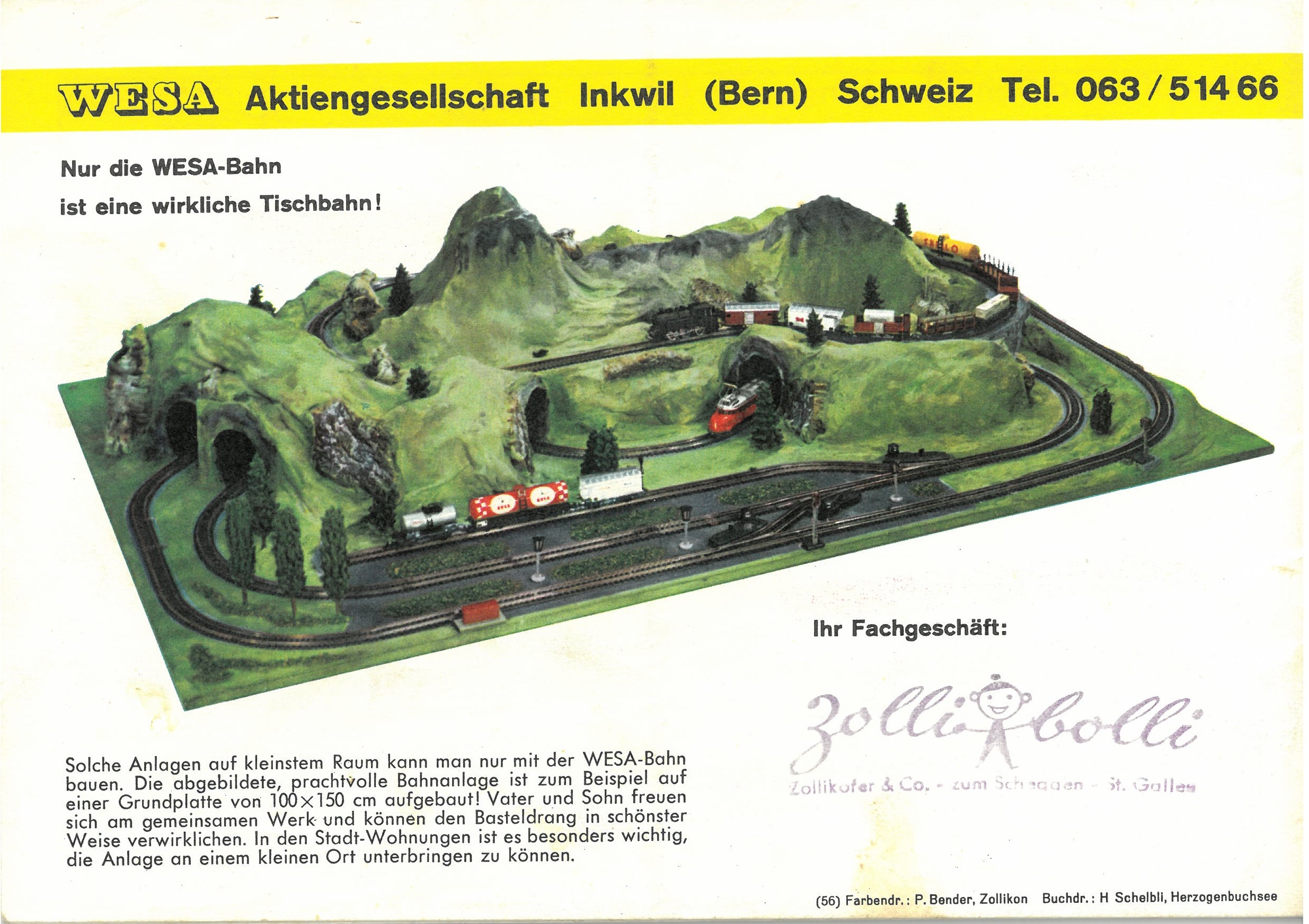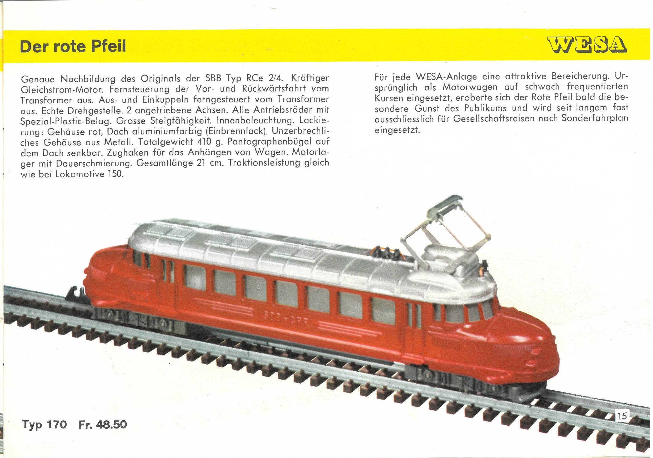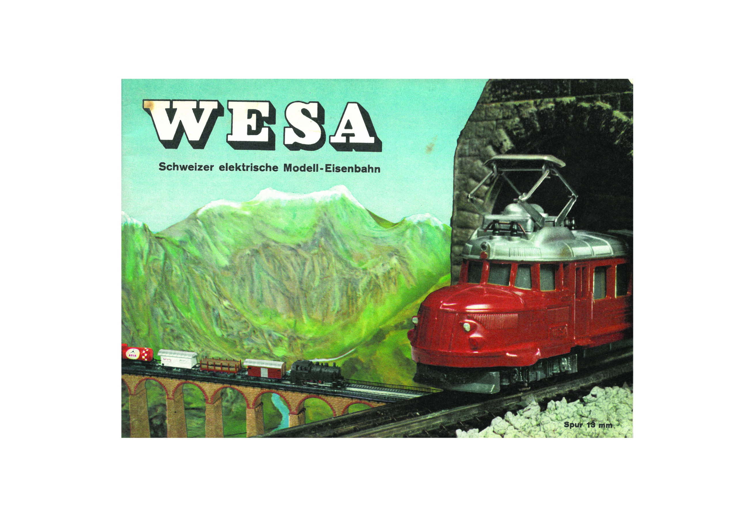 Der WESA-Katalog von 1956 gilt unter Sammlern als eine der stimmungsvollsten Veröffentlichungen des Herstellers. Das ikonische Titelbild fängt den Geist der Epoche perfekt ein: Der „Rote Pfeil“, Inbegriff moderner Schweizer Reiselust, bricht aus einem Tunnel hervor, während im Hintergrund ein Güterzug über ein gemauertes Viadukt dampft. In diesem Katalog wird die gesamte Welt der 13-mm-Bahn präsentiert – ein System, das damals durch seine Kompaktheit und die robuste Metalldruckguss-Bauweise Massstäbe setzte.